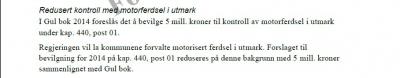 18. Apropos behov for økt kontroll med motorferdsel i utmark: Blånissene foreslår å kutte øremerkede midler til motorferdsel-oppsyn fra justisdepartementets (i.e. politiets) budsjett for 2014 (jf. vedlegg). Begrunnelsen synes å være at kommunene selv skal stå for motorferdsel-forvaltningen - dermed skal de også ha ansvar for å besørge nødvendig oppsyn. Hvordan regjeringen ser for seg at kommunene skal løse dette i praksis sies det intet om. Jeg undrer: Har de aktuelle kommunene tilstrekkelige ressurser og mannskaper med kompetanse og politimyndighet som kan utføre nødvendig tilsyn/oppsyn? Eventuelt: Finnes det en eneste kommune som har det? ???