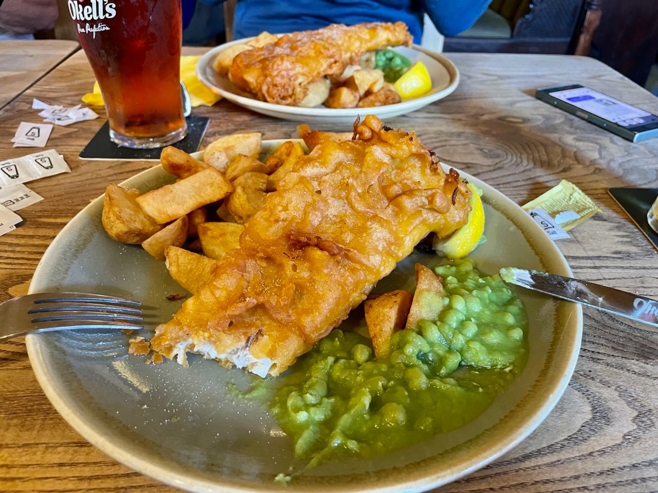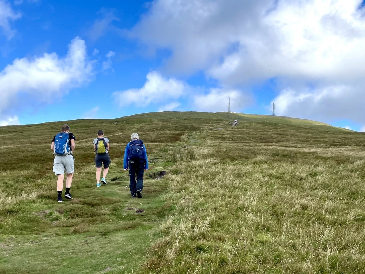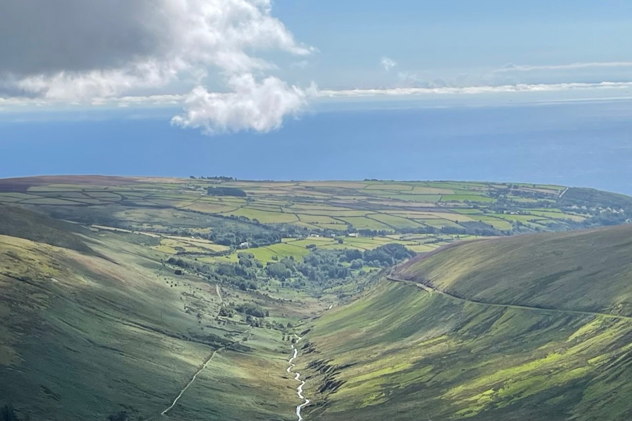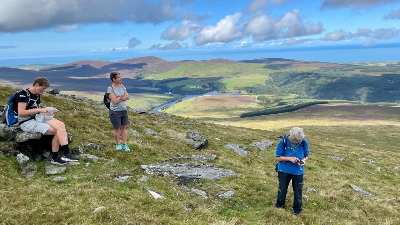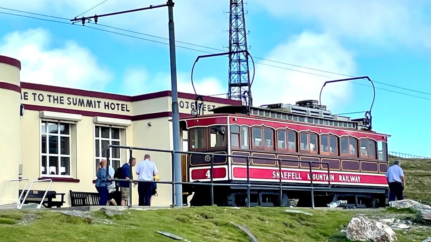 Ut av Norge og til topps på Isle of Man. Til Snaefell kan du ta toget. Vi entret den elektrisk drevne vognen i Laxey (som kommer av Laksaa eller lakseelv) og hoppet av underveis, på Bungalow stasjon, for så å gå de siste par hundre høydemeterne til toppen. Snaefell betyr Snøfjell og toppen ligger på svimlende 621 moh. Der oppe ventet utsikt i alle retninger, dvs. til Irland, Nord-Irland, Skottland, Wales og England. Hadde det vært litt mindre disig ville vi ha sett Scafell Pike og Snowdon. Etter obligatorisk fotografering og geocaching var det tid for forfriskninger: Det nedlagte, gamle hotellet nær toppen er blitt kafé, så der sørget vi for å innta scones, te og annet snadder. Ned igjen satset vi på toget. Isle of Man må være skinneentusiastenes våte drøm, for øya har flere jernbanestrekninger der gamle tog puster og går, noen elektriske og andre kullfyrte damptog, noen er smalsporet og andre normalsporet, noen med venstre- og andre med høyrekjøring. På vei mot toppen på gresskledd grunn: Utsikten, denne er østover: Gammel og god; Snaefell Mountain Railway: Toget og hotellet som er kafé: Geocachere i aksjon: Og noen lokale næringsmidler:
