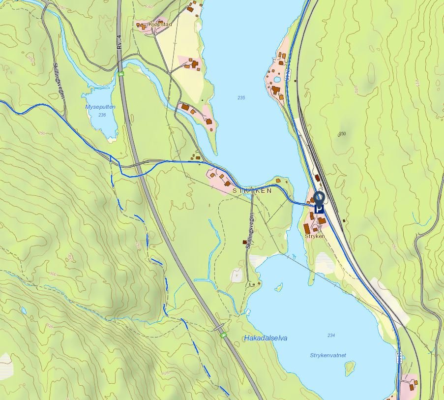Hvor du skal gå fra Stryken avhenger jo om du vil gå på vei eller over på sti. Her er kart fra Skiforeningen.no og deres turplanlegger (appen Imarka er også ok, der kan du velge mellom løyper i rødt og sykkelruter i blått, men stier er tegnet inn som stiplet svart i begge versjoner). Uansett, så anbefaler jeg sterkt et turkart på papir! F.eks Nordmarka 1:50.000.
