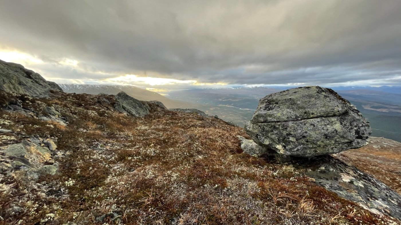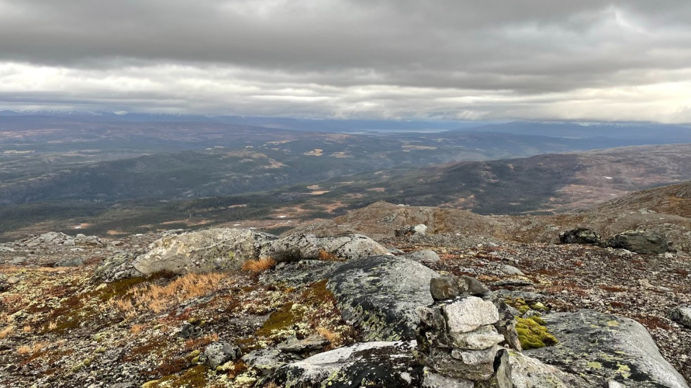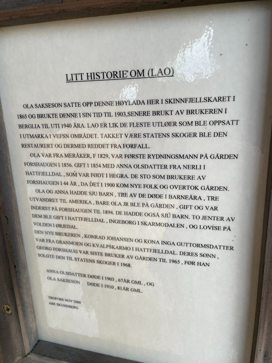 Nok en liten bilderapport fra min selvpålagte tidligferie på hytta. Jeg har sett at enkelte steder er veldig lite omtalt, og kanskje mindre besøkt enn andre steder. Mange lokale er kjent med disse stedene, men for andre er det kanskje usikkert om veien er kjørbar. Jeg må innrømme at jeg var usikker på om veien opp til Skinnfjellskardet var kjørbar med min personbil, men det gikk bare bra. Det er første gangen jeg er her, men det blir ikke den siste. Bilen parkert - der man ikke skulle tro det fantes en vei! I tidligere tider var det nok andre transportmidler, og skardene heter blant annet Sommervegskardet eller Vintervegskardet eller Storvegskardet.. Et mye brukt område i tidligere tider - spesielt av urfolket. Jeg har absolutt ikke noe mål med turen, men hadde kanskje et lite håp om å komme meg over skogsgrensen innover skardet. Noen av disse skardene er kupert, der de små bekkene fra fjellet har gravd dype furer i morenelandskapet, men her innover er det veldig lett å gå. Noe myr som vanlig. Det drives aktivt skogbruk, så det er nok derfor det er vei helt opp hit - på ca 400 moh. Det står en lae her - som er fra 1865. Den har sett dine beste dager, men imponerende at de bygde dette så langt til fjells..Rikholdig boks med gjestebøker fra mange mange år tilbake viser at dette er et vanlig turmål for de lokale. Multemyrene står vel også tett her i rette sesongen. Etter som jeg vandrer innover skardet bestemmer jeg meg for å gå oppover fjellsiden mot Skinnfjellet. Selve toppen på 1323 ser jeg er inntyllet i tåke, men regner med at det kan bli bra utsikt i mot nord. Litt av et juletre så høyt til fjells! Innover Skinnfjellskardet Jeg går over kanten og ser mot Hattfjelldal og Røssvatnet. Ved ca 1000 moh. Det er helt flatt oppå her og veldig lett å gå - hadde jeg hatt bedre tid (det er langt på dag), kunne jeg siktet mot toppen, men den får vente til en annen gang.. Oppå toppen ligger det en stor stein som isen har lagt igjen helt på vippen. Hele Fiplingdalen ligger sørover her, med de 2 vannene langt der sør. Solen prøver å bryte i gjennom, men lite å se til den. Jeg tar meg en god pause her på toppen med kakao og brødskive. Det ble en flott tur denne dagen også.