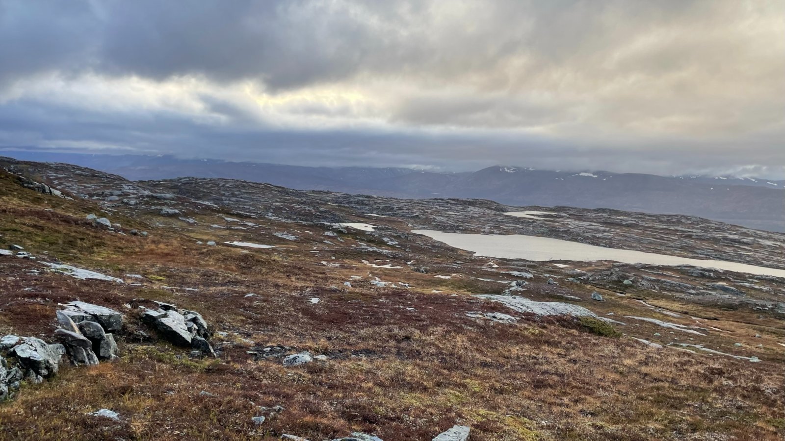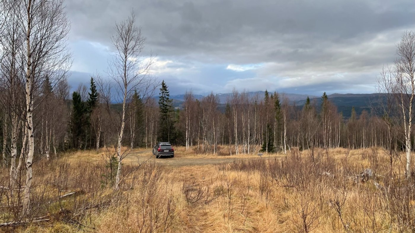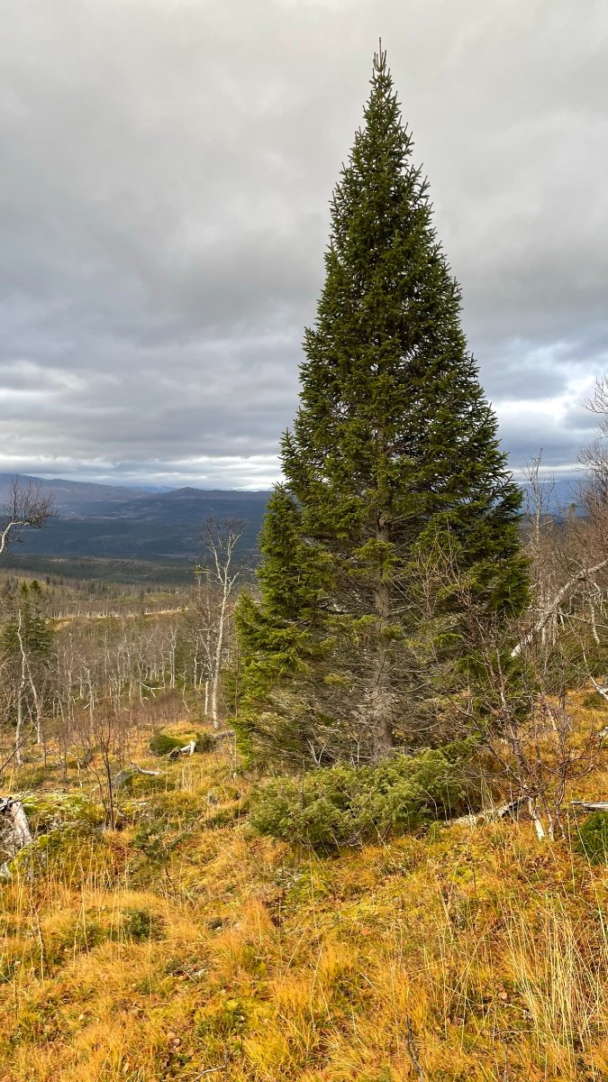 Nok en liten bilderapport fra min selvpålagte tidligferie på hytta. Jeg har sett at enkelte steder er veldig lite omtalt, og kanskje mindre besøkt enn andre steder. Mange lokale er kjent med disse stedene, men for andre er det kanskje usikkert om veien er kjørbar. Jeg må innrømme at jeg var usikker på om veien opp til Skinnfjellskardet var kjørbar med min personbil, men det gikk bare bra. Det er første gangen jeg er her, men det blir ikke den siste. Bilen parkert - der man ikke skulle tro det fantes en vei! I tidligere tider var det nok andre transportmidler, og skardene heter blant annet Sommervegskardet eller Vintervegskardet eller Storvegskardet.. Et mye brukt område i tidligere tider - spesielt av urfolket. Jeg har absolutt ikke noe mål med turen, men hadde kanskje et lite håp om å komme meg over skogsgrensen innover skardet. Noen av disse skardene er kupert, der de små bekkene fra fjellet har gravd dype furer i morenelandskapet, men her innover er det veldig lett å gå. Noe myr som vanlig. Det drives aktivt skogbruk, så det er nok derfor det er vei helt opp hit - på ca 400 moh. Det står en lae her - som er fra 1865. Den har sett dine beste dager, men imponerende at de bygde dette så langt til fjells..Rikholdig boks med gjestebøker fra mange mange år tilbake viser at dette er et vanlig turmål for de lokale. Multemyrene står vel også tett her i rette sesongen. Etter som jeg vandrer innover skardet bestemmer jeg meg for å gå oppover fjellsiden mot Skinnfjellet. Selve toppen på 1323 ser jeg er inntyllet i tåke, men regner med at det kan bli bra utsikt i mot nord. Litt av et juletre så høyt til fjells! Innover Skinnfjellskardet Jeg går over kanten og ser mot Hattfjelldal og Røssvatnet. Ved ca 1000 moh. Det er helt flatt oppå her og veldig lett å gå - hadde jeg hatt bedre tid (det er langt på dag), kunne jeg siktet mot toppen, men den får vente til en annen gang.. Oppå toppen ligger det en stor stein som isen har lagt igjen helt på vippen. Hele Fiplingdalen ligger sørover her, med de 2 vannene langt der sør. Solen prøver å bryte i gjennom, men lite å se til den. Jeg tar meg en god pause her på toppen med kakao og brødskive. Det ble en flott tur denne dagen også.