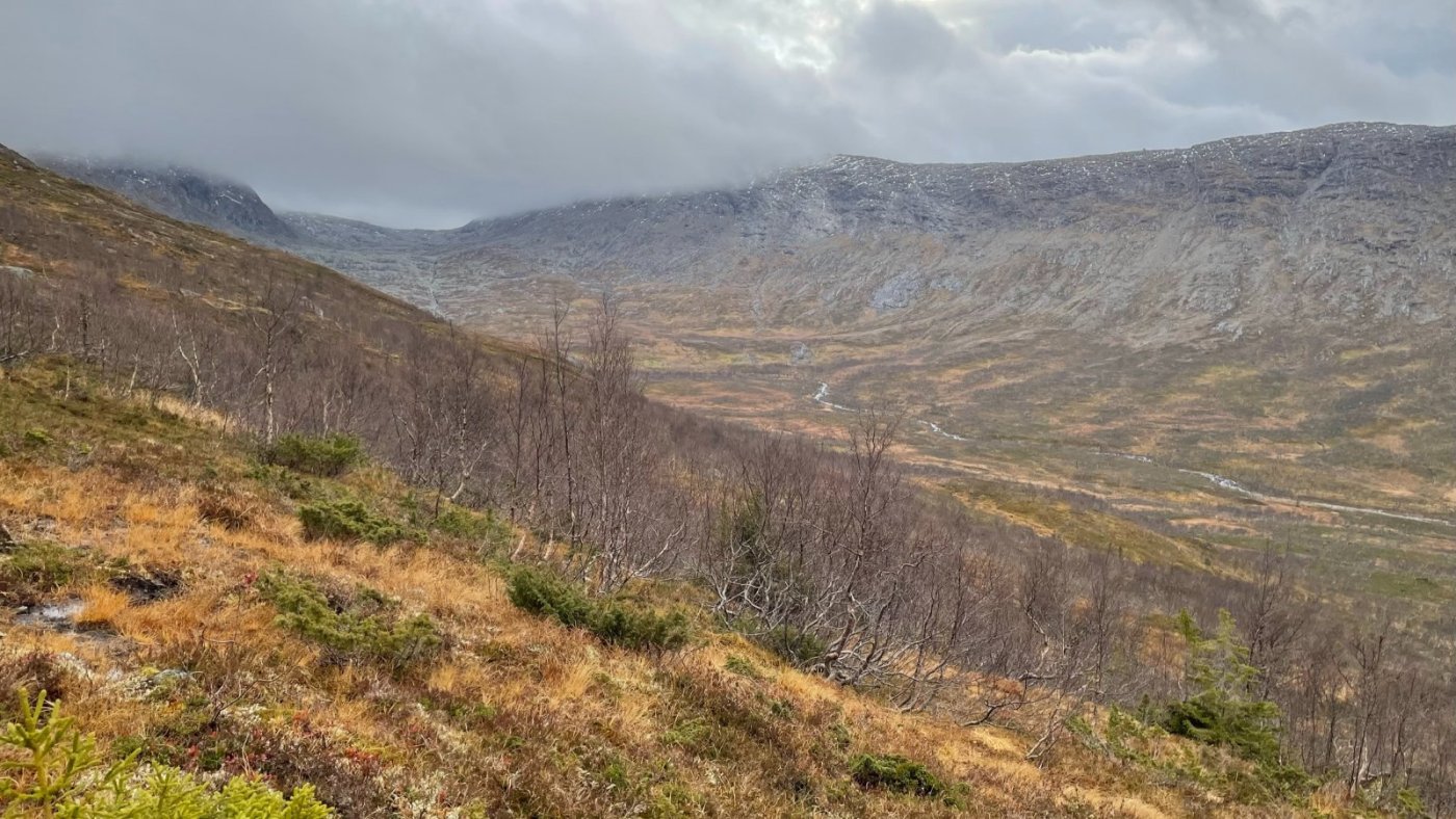 Torsdag 3/11 22 På hjemmebane er det mye hosting for tiden, så for å holde meg unna lumske virus har jeg evakuert til hytta Siden vinteren er såpass mild er det fortsatt flott barmarksføre og noe må man vel finne på når det ikke er skiføre.. Turmålet er Bolkskardet. I tidligere tider brukte Leirskolen ved Børgefjellskolen å ha overnatting med telt i Simskardet og så gikk ungene til skolen via Bolkskardet - det er en ganske krevende tur. Jeg skulle gå motsatt vei og distansen er ca 20 km som en rundtur. Starten er på 360 moh, og det høyeste partiet er ved 1100 moh. Det er en nydelig dag og fortsatt mye lys. Eneste jeg kan klage på er at det er mye lyng, mose og myr, som gjør selve traskingen tung. Det er vått i terrenget og ingen sti. Det blåser en østlig bris, men det er mange varmegrader - helt unormalt varmt. Etter som jeg trekker oppover får jeg bedre utsikt i mot kysten og fjellene i Bindal og mot Lomsdal/visten - kjente turområder for meg. Hele tiden er det et lokk med skyer rett over hodet på meg, og skyene truer med å komme ned. Vinden vil heller ikke gi seg her i høyden, så det frister ikke med en pause heller. Når jeg kommer på det høyeste punktet i skardet ligger skyene godt rundt meg, Snøen bærer bare sånn delvis - heldigvis har jeg gamasjer på - det trengtes i dag. Her kommer jeg over til Golverskardet. Dette er også et lite besøkt område. Kan vel slenge en og annen jeger i ny og ne. Det går en del rein og beiter her. Reinsamlingen er ferdig, men de samler vel på nytt når snøen kommer. Nede i skardet løyer det med vinden og jeg finner en stor stein jeg kan ta en pause bak. Turens eneste pause Fra Golverskardet - Simskardet til venstre (mot Simskardvatnet), Biseggskardet (med Kvigtinden i skyene) og Rørskardet til høyre. Simskardet har fått nye benker, handikappstier og det skal komme nytt toalett osv.. Det kalles vel utvikling. Jeg får en lang marsj tilbake til bilen - 4 km på grus og 4 km på asfalt. Godt å komme til bilen var det. Hele siste delen av turen gikk jeg uten jakke, lue eller votter. 8 grader varmt og lite vind.
