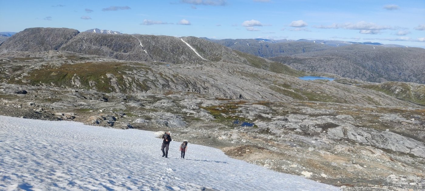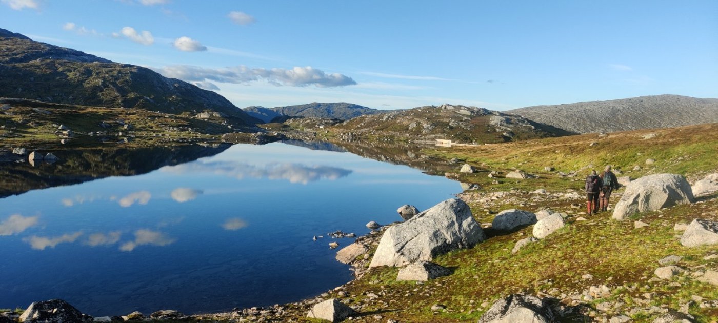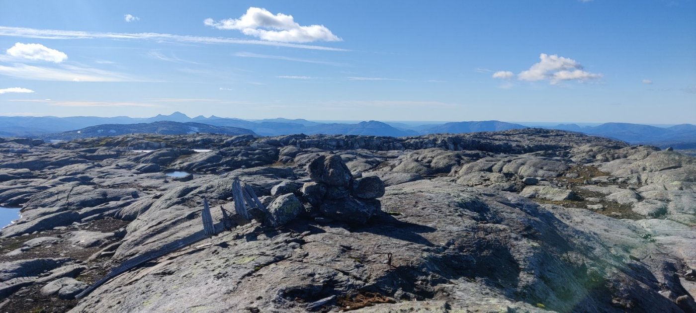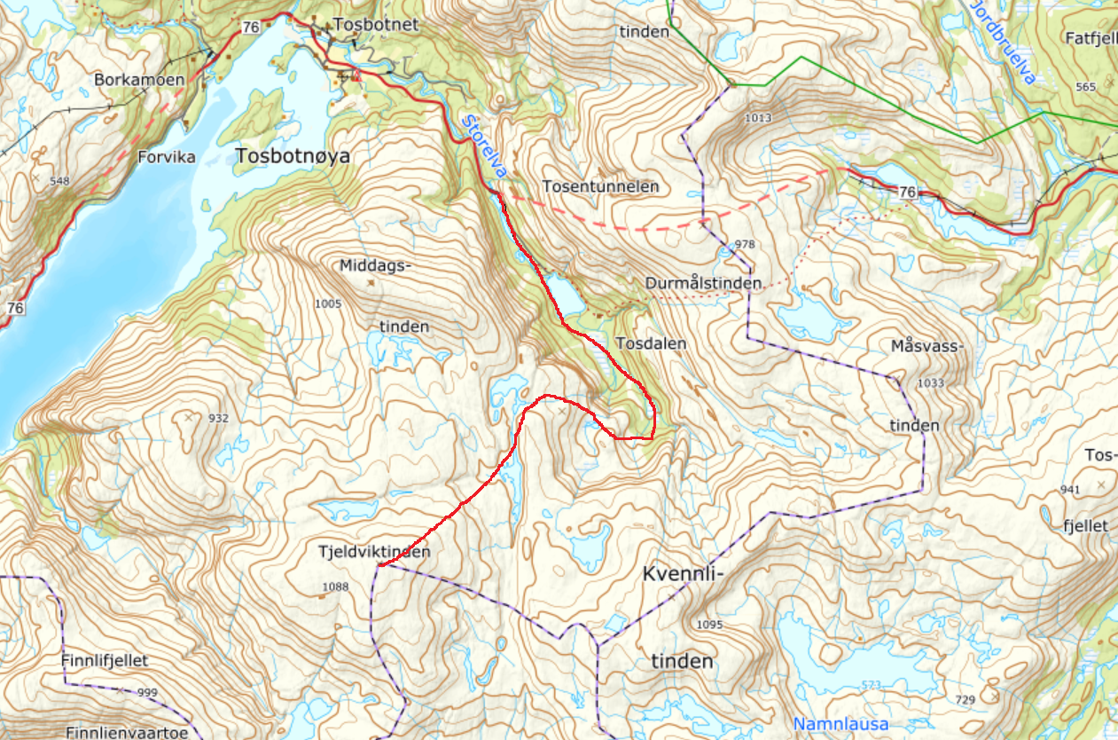 12. Lørdag 3/9 2022 skulle vi ta tur nummer to og denne gangen var turmålet Tjeldviktinden i Bindal. Dagen før var vi på Oksskolten og det ble ikke mange timene i seng siden det er mye kjøring. Kl 1030 var vi klare for tur fra nedsiden av Tosentunnellen. Det er en lang og krevende tur - 25.5 km t/r med ganske mange høydemetre i tungt og umerket terreng. Det er i de senere år anlagt en vei innover dalen her som er stengt med bom, men som er fin å vandre. Tidligere var det ofte behov for båt for å komme seg innover her. Veien er for tiden ikke inntegnet på noen kart. Vi har med to venner på tur så vi er fire som skal slite oss oppover lia denne flotte sensommerdagen. (de fleste bildene er tatt av @graham ) Vi forlater etterhvert stien - bekker nok å finne drikkevann i denne dagen! Mer myr og våtere terreng. Petter er særs aktiv om dagen Etter hvert som stien snor seg oppover blir det mindre vegetasjon og man får den flotte utsikten ut over Tosdalen. Denne utsikten er verdt turen i seg selv! Starten av turen er ved vannet lengst nord midt i bildet. Dette er første pausen vi tar. Videre herifra får man et mer åpent og nydelig fjell-landskap opp i mot Storfjelltjønna, som nå er oppdemt. Vi sliter oss oppover snøfonnene her Vi følger terrenget så godt som mulig videre innover fjellet og i mot toppen. Det er jo litt ironisk at denne toppen, som er så flat, er høyere enn mer berømte Heilhornet 1058 i samme kommune. Toppvarden er ikke akkurat av det staselige slaget heller - litt stusselig kommunetopp, men det er en av de mer krevende å bestige for de som samler på slike. Vi har oss en god pause her på toppen Vi finner noen snarveier ned igjen som gjør at vi sparer noen høydemetre. Nede ved dammen igjen Vi får en nydelig tur ned fra fjellet - men det var godt å komme til bilen etter en usedvanlig lang dag. Gårsdagens tur til Oksskolten og lite søvn gjorde vel også sitt til at formen ikke var 100%, men vi utnyttet i hvertfall godværet når det endelig kom!