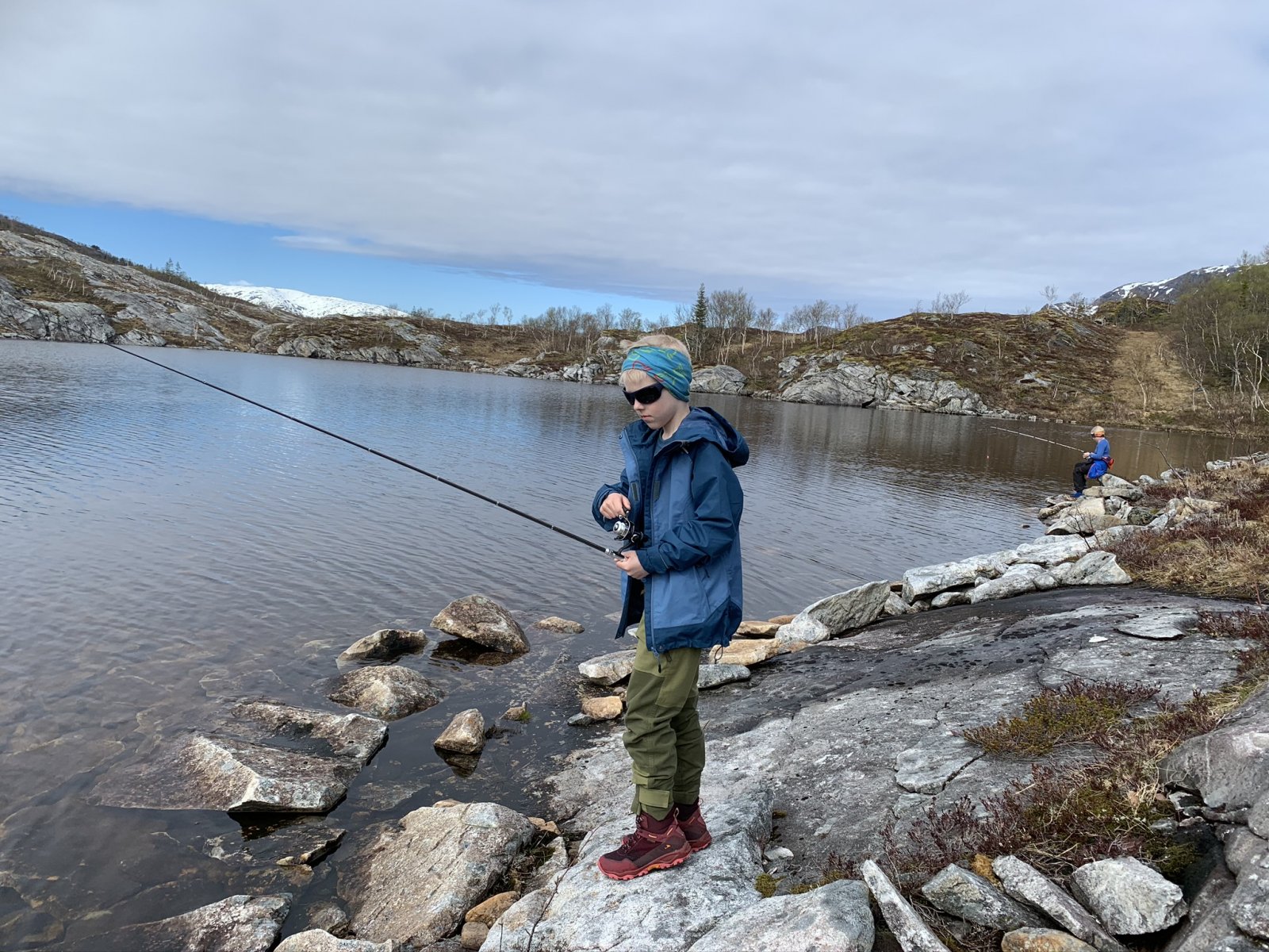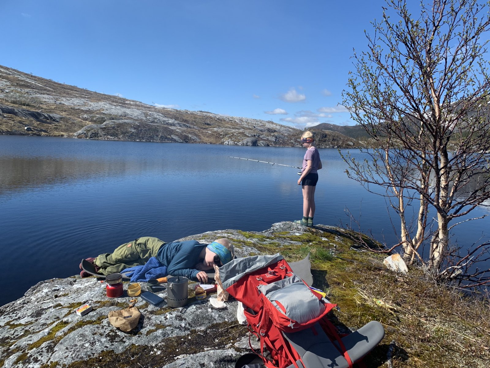 Jenta ønsket kun en ting til 10 års dagen i morgen - telttur! Så vi fant oss et vann. Broren kjøpte skikkelig fiskestang som ble overlevert jubilanten ved ankomst. Hun klarte å sette fast to ganger med nystanga så fadern måtte sjekke badetempen Nå lukter det mat.
