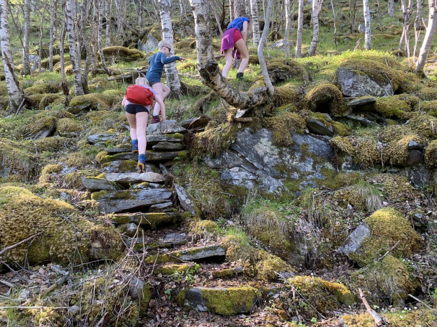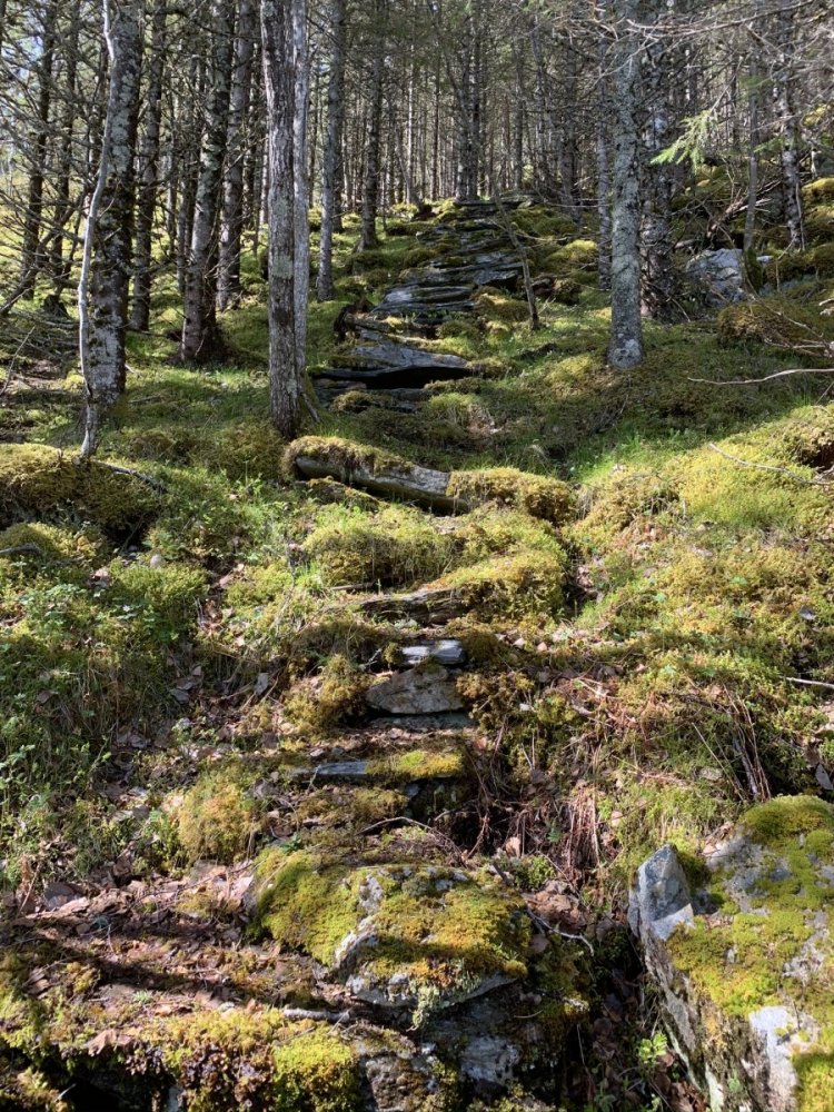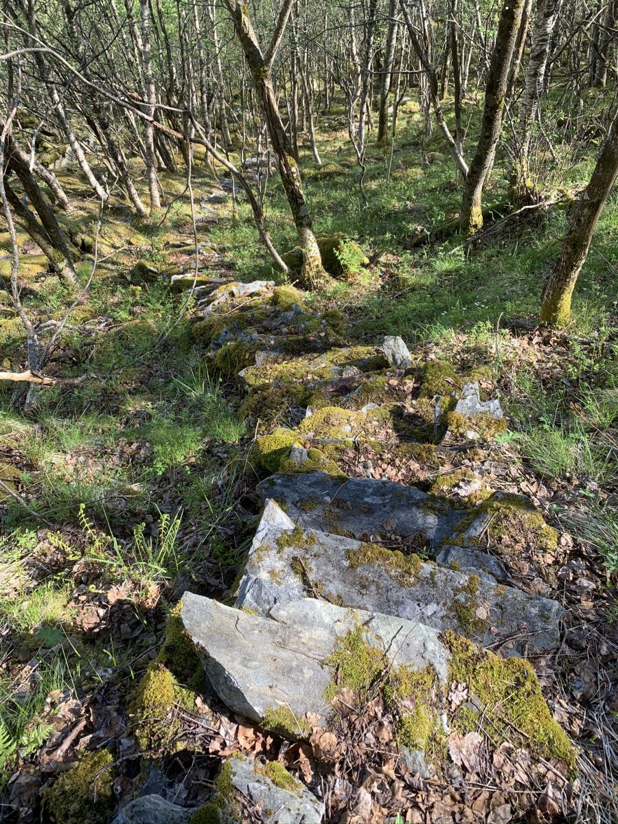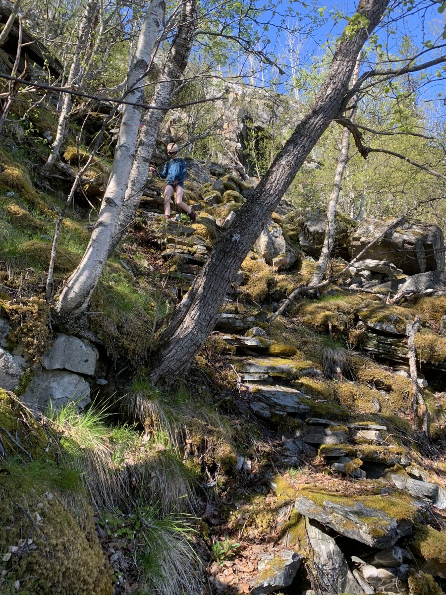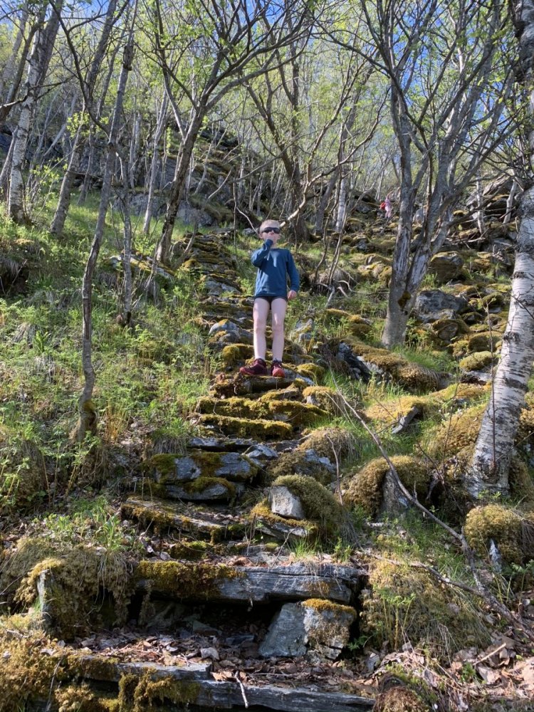 De fleste kulturminnene vi har i Norge er promotert på ymse vis. Ikke minst er trapper i vinden. Sherpatrappen i Mosjøen og Vegatrappa er lokale varianter, men den trappa vi besøkte i helgen er svært lite besøkt og lite promotert. Det er nok mange år det aldri går folk i denne trappa, og den er vanskelig å finne. 450 trinn av det hardeste fjell er bygd for å vare, men mange er vaklevorne og man må trå rett på hvert et trinn! Jeg anbefaler ikke besøk hit siden den er i svært bratt terreng, og at man må ha rimelig gode forhold for å komme seg ned og opp igjen og mange av steinene er altså helt løse. For å komme seg hit går man i gjennom et nydelig fjellterreng med trange skar der snøsmeltingen lager små bekker som renner i sikksakk bortover gress-slettene. Et skikkelig eventyrterreng for lek med å sende drikkekoppene nedover "strykene". Det er steinmurer i terrenget - beite eller "Bogastelle" - ikke vet vi, men at det har ferdes mye folk her før er det ikke tvil om. Vi finner etter hvert den forlatte fjellgården høyt oppe i lia, nå gjengrodd, og det er vanskelig å se for seg hva de kunne ha av beiteland rundt her. Når var det fyr i denne primusen sist mon tro. Så er det å finne trappa i bratta og den er nesten umulig å finne, men vi finner den til slutt takket være lite vegetasjon på denne årstiden. 450 trappetrinn ned de bratte flågene - et helt utrolig byggverk fra tidlig 1800 tall. Helt til vi er ved Tosenfjorden. For et slit de har hatt de som livnærte seg og klarte seg på slike steder. Det står det all respekt av.