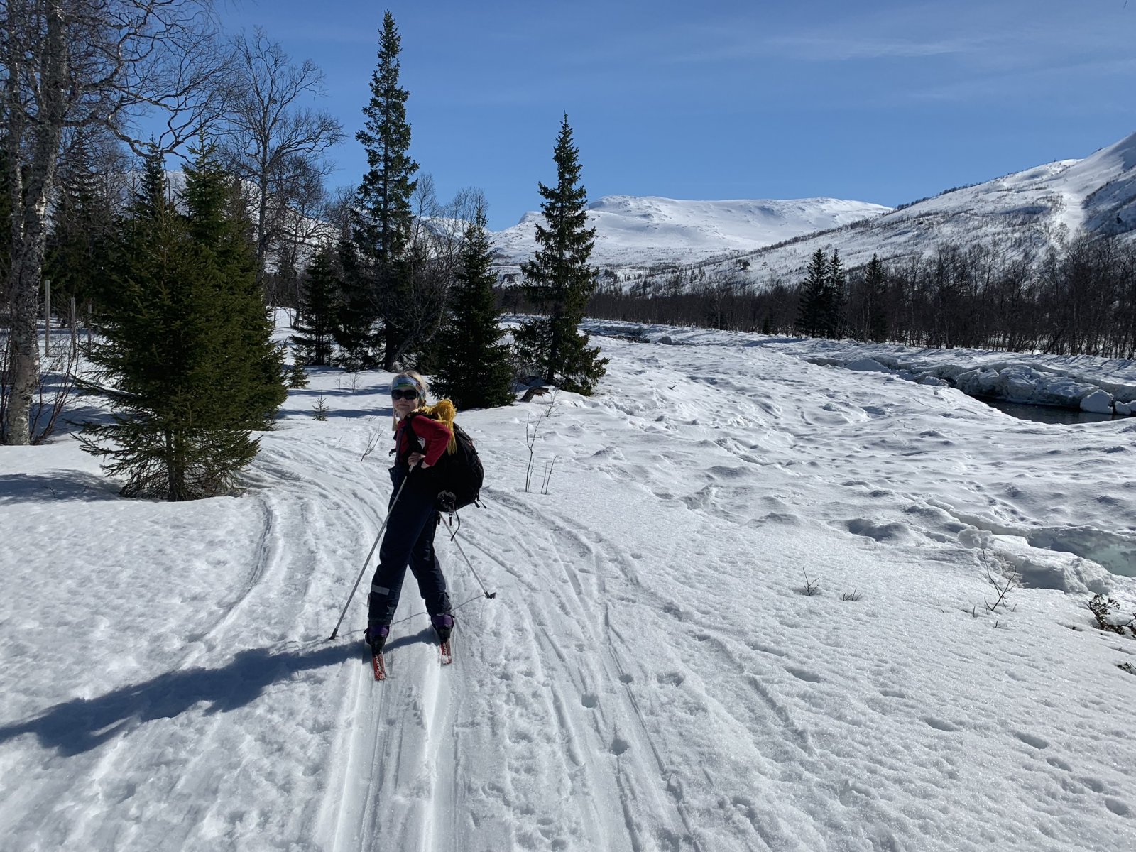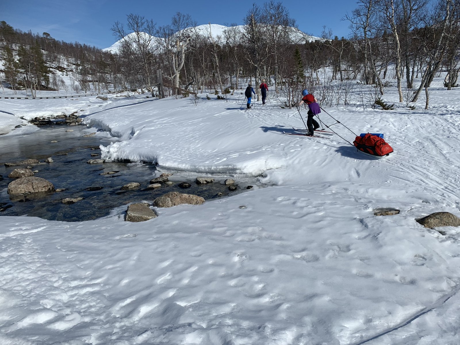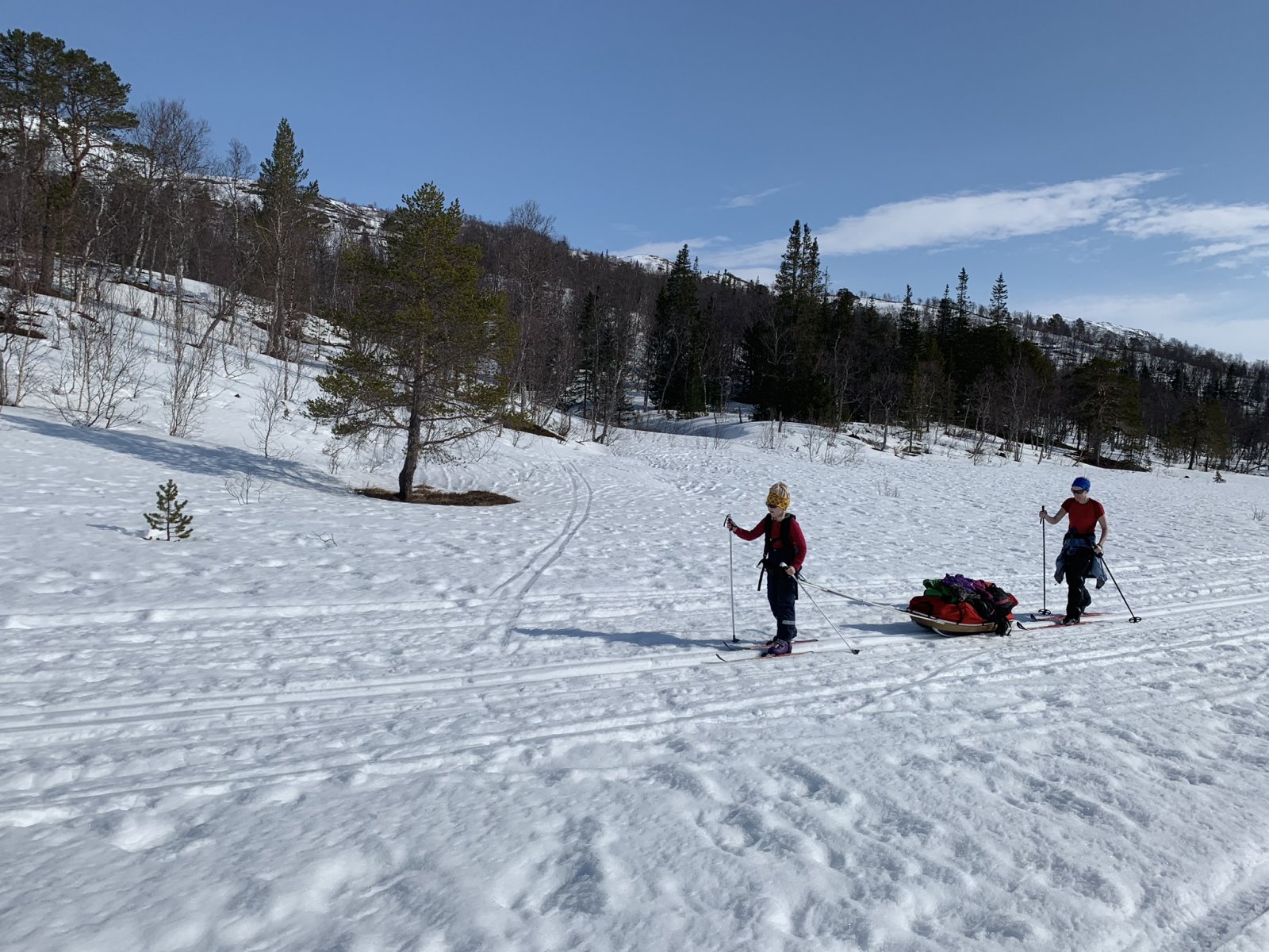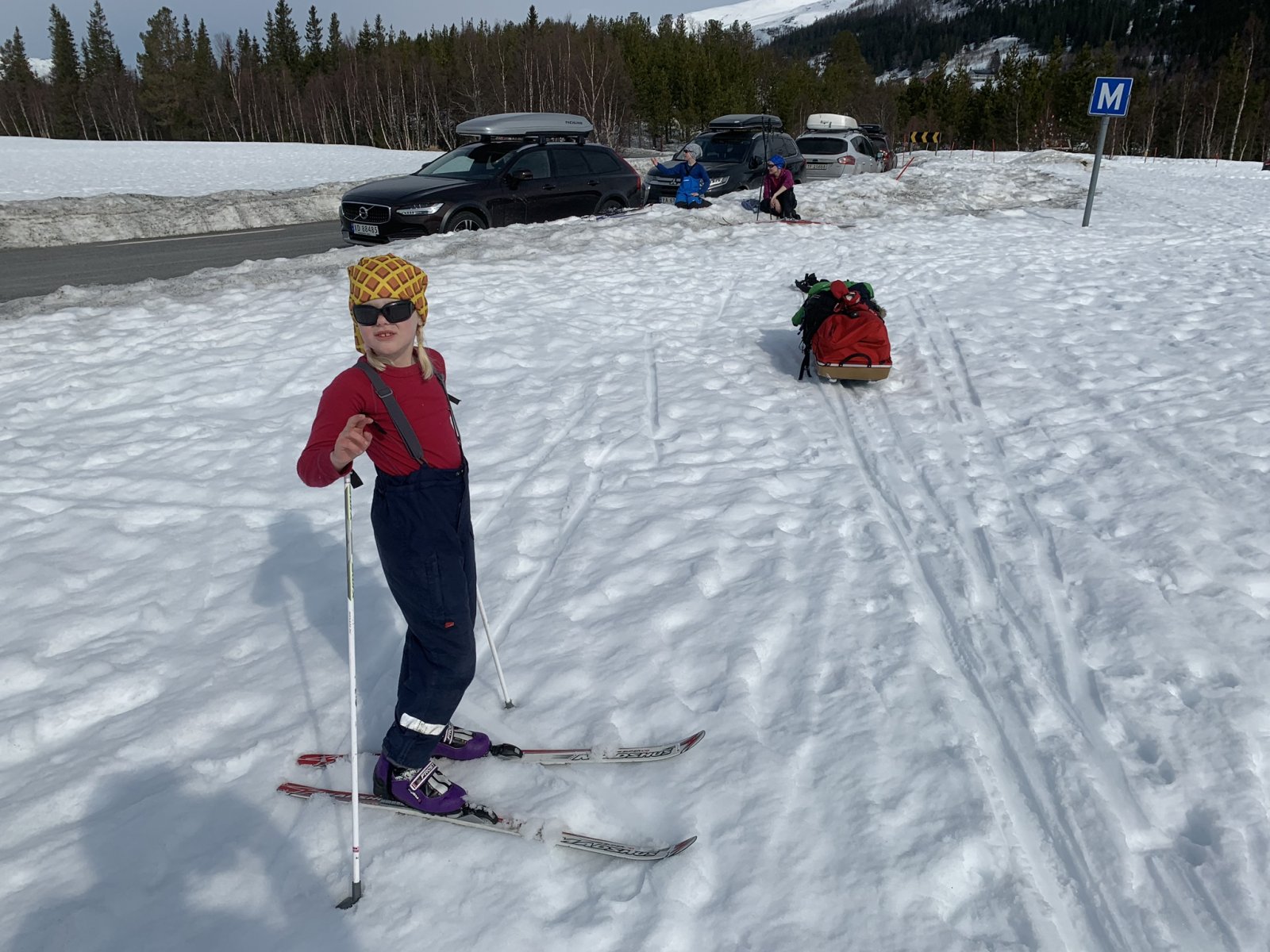 Vi har tilbragt mye tid inne på land den siste tiden. Selve Børgefjell er som vanlig ikke så lett tilgjengelig, og det er jo en dags marsj å komme inn til et fiskevann der inne. For oss er ikke fiske hovedmålet, vi fisker mye ellers, men å komme oss på tur og lufte teltet litt som en avveksling. Det er egentlig mye styr å pakke for vintertur med 2 barn, og det tar like mye tid om man skal være ute 2 dager som 7 dager. Det er bare maten som er forskjellen stort sett. Vi har fundert på alternativer, men finner ut at vi skal klare å gå ruten Simskardet, Simskardvatnet - Måsskardvatnet, Biseggskardet og ned igjen. Så det er planen når vi legger av gårde tirsdag morgen. Vi holder god fart og er snart ved sommerparkeringen der det er drikkepause. Vi har 2 pulker som er ganske lette, og en 8 åring på pinneski og rødswix og en 10 åring på Åsnes Mountain Jr (og senere kortfeller). Ho med rød-swix holder best fart, med egen sekk og dukke i sekken. Biseggen og Kvigtinden i bakgrunnen. Vi kommer til Golverskardelva - hytta til Statsskog ligger overfor her.. Det er virkelig flott natur her inne og furuene er et flott skue. Noe å titte på når man tråkker oppover i varmen. Vi finner en teltplass en km etter hytta. Vi innser at pulkene blir for tunge for oss, for å klare runden som planlagt. Vi tenker heller å telte her og ta en dagstur inn til Simskardvatnet dagen etter. Vedlagte kart viser omtrent hvor vi gikk. Simskardvatnet er for øvrig fisketomt i henhold til Lars Monsen sin bok fra Børgefjell, men han om det... Vi tar kveld i teltet veldig tidlig og når solen begynner å varme i teltet dagen etter er det godt å få i gang primusen og kaffen. Det er frost om natta, men ikke mange minusgrader. Vi pakker en pulk med termoser og sitteunderlag og legger avgårde med mål om å se Simskardvatnet, der jeg har vært mange ganger før. Gutten med sine Åsnes Junior har en stor fordel oppover her med sine kortfeller, så vi må vente på ho med rød swix, men ingen klager! Solen steker veldig, så snøen blir stadig mykere. Etter litt mer slit er vi oppe ved Simskardvatnet - hele 920 meter står vi på, og det er med en viss stolthet jenta kaster skiene. Det er et flott skue der oppe, og vi bruker lang tid på lunsj her oppe. Full vinter enda her oppe. Det er nesten naturstridig å stå her i april og savne shorts og T skjorte. Solen er hard og vi drar på buff og luer for å skjerme solbrillene. Etter en lang pause oppå her satte vi kursen nedover igjen. Nå venter en spennende nedkjøring, og spesielt for henne med 1 meter lange ski er dette en ny utfordring. Vi holder godt driv nedover og skiferdighetene er på topp. Eller forholdene er veldig gode. Selv med pinneski går det i god fart. Neste dag renner vi ned til bilen - ca 7-8 km. Føret er skarpt på morningen etter frostnatta, men det går bra Jenta tar pulkem et godt stykke. Denne pulken er lett å trekke, i motsetning til den andre. Ved nasjonalparkgrensen er det en lang furustokk som ungene bruker å disse på, så de vil absolutt ha en pause her. Rett etter denne pausen treffer vi slekt som er på tur med 2 hunder som drar jenta med pulken på slep helt til bilen. En minneverdig og artig påsketur.