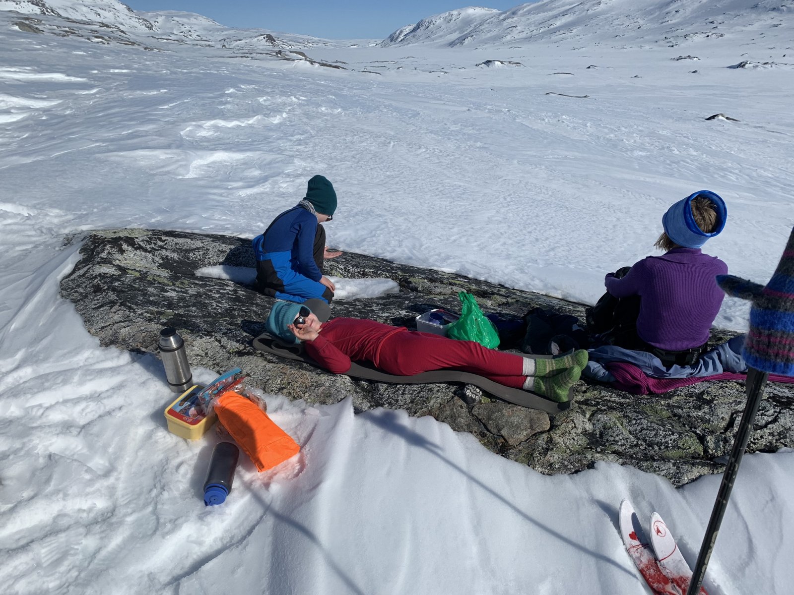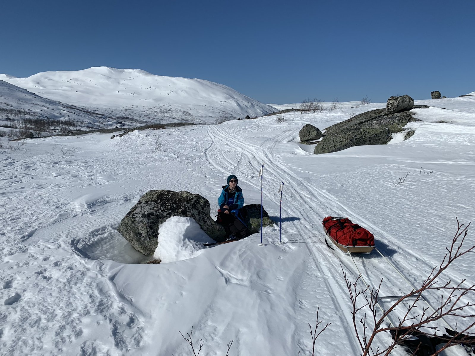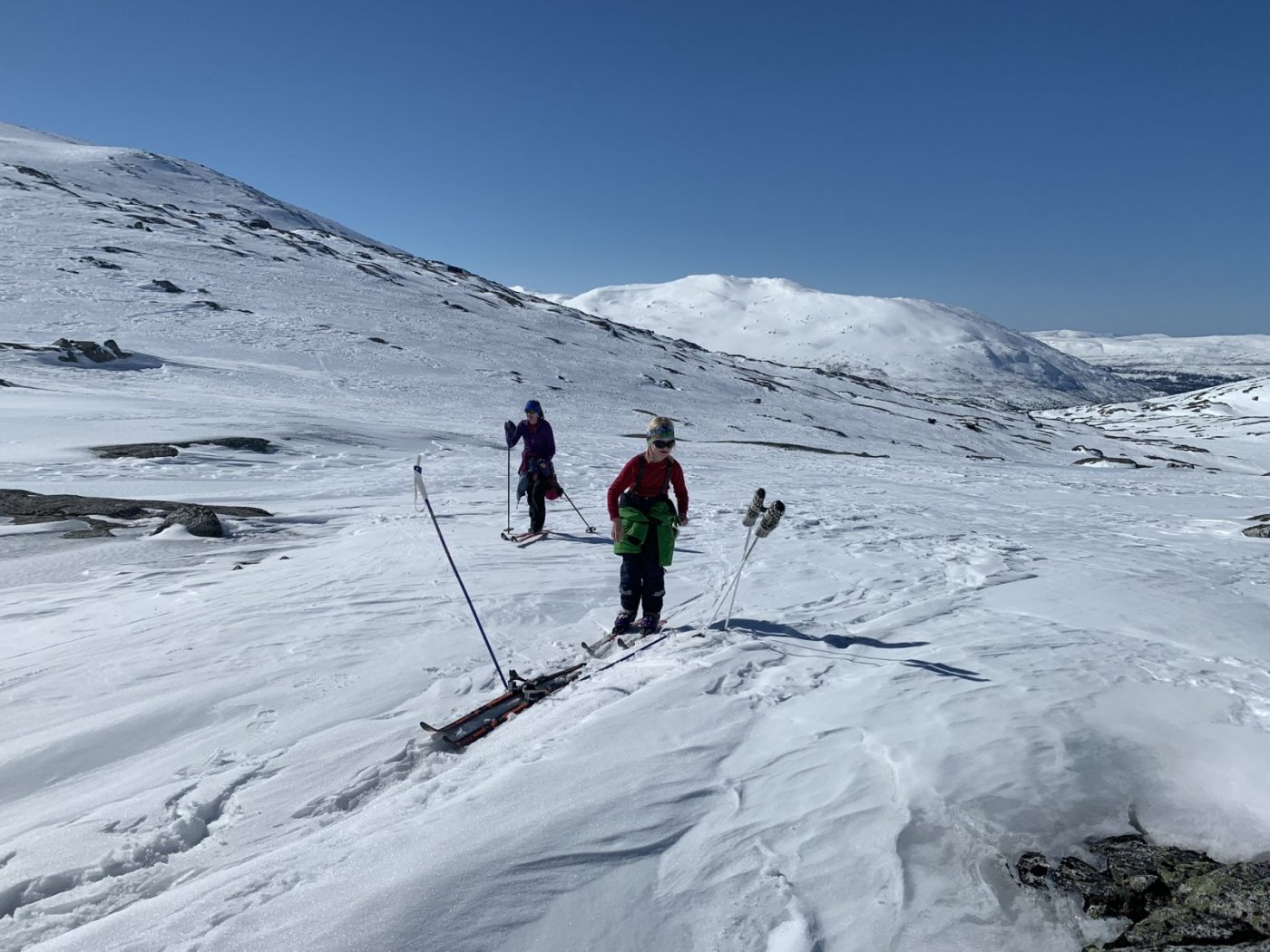Vi har tilbragt mye tid inne på land den siste tiden. Selve Børgefjell er som vanlig ikke så lett tilgjengelig, og det er jo en dags marsj å komme inn til et fiskevann der inne. For oss er ikke fiske hovedmålet, vi fisker mye ellers, men å komme oss på tur og lufte teltet litt som en avveksling. Det er egentlig mye styr å pakke for vintertur med 2 barn, og det tar like mye tid om man skal være ute 2 dager som 7 dager. Det er bare maten som er forskjellen stort sett. Vi har fundert på alternativer, men finner ut at vi skal klare å gå ruten Simskardet, Simskardvatnet - Måsskardvatnet, Biseggskardet og ned igjen. Så det er planen når vi legger av gårde tirsdag morgen. Vi holder god fart og er snart ved sommerparkeringen der det er drikkepause. Vi har 2 pulker som er ganske lette, og en 8 åring på pinneski og rødswix og en 10 åring på Åsnes Mountain Jr (og senere kortfeller). Ho med rød-swix holder best fart, med egen sekk og dukke i sekken. Biseggen og Kvigtinden i bakgrunnen. Vi kommer til Golverskardelva - hytta til Statsskog ligger overfor her.. Det er virkelig flott natur her inne og furuene er et flott skue. Noe å titte på når man tråkker oppover i varmen. Vi finner en teltplass en km etter hytta. Vi innser at pulkene blir for tunge for oss, for å klare runden som planlagt. Vi tenker heller å telte her og ta en dagstur inn til Simskardvatnet dagen etter. Vedlagte kart viser omtrent hvor vi gikk. Simskardvatnet er for øvrig fisketomt i henhold til Lars Monsen sin bok fra Børgefjell, men han om det... Vi tar kveld i teltet veldig tidlig og når solen begynner å varme i teltet dagen etter er det godt å få i gang primusen og kaffen. Det er frost om natta, men ikke mange minusgrader. Vi pakker en pulk med termoser og sitteunderlag og legger avgårde med mål om å se Simskardvatnet, der jeg har vært mange ganger før. Gutten med sine Åsnes Junior har en stor fordel oppover her med sine kortfeller, så vi må vente på ho med rød swix, men ingen klager! Solen steker veldig, så snøen blir stadig mykere. Etter litt mer slit er vi oppe ved Simskardvatnet - hele 920 meter står vi på, og det er med en viss stolthet jenta kaster skiene. Det er et flott skue der oppe, og vi bruker lang tid på lunsj her oppe. Full vinter enda her oppe. Det er nesten naturstridig å stå her i april og savne shorts og T skjorte. Solen er hard og vi drar på buff og luer for å skjerme solbrillene. Etter en lang pause oppå her satte vi kursen nedover igjen. Nå venter en spennende nedkjøring, og spesielt for henne med 1 meter lange ski er dette en ny utfordring. Vi holder godt driv nedover og skiferdighetene er på topp. Eller forholdene er veldig gode. Selv med pinneski går det i god fart. Neste dag renner vi ned til bilen - ca 7-8 km. Føret er skarpt på morningen etter frostnatta, men det går bra Jenta tar pulkem et godt stykke. Denne pulken er lett å trekke, i motsetning til den andre. Ved nasjonalparkgrensen er det en lang furustokk som ungene bruker å disse på, så de vil absolutt ha en pause her. Rett etter denne pausen treffer vi slekt som er på tur med 2 hunder som drar jenta med pulken på slep helt til bilen. En minneverdig og artig påsketur.