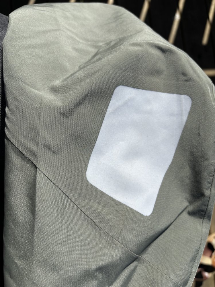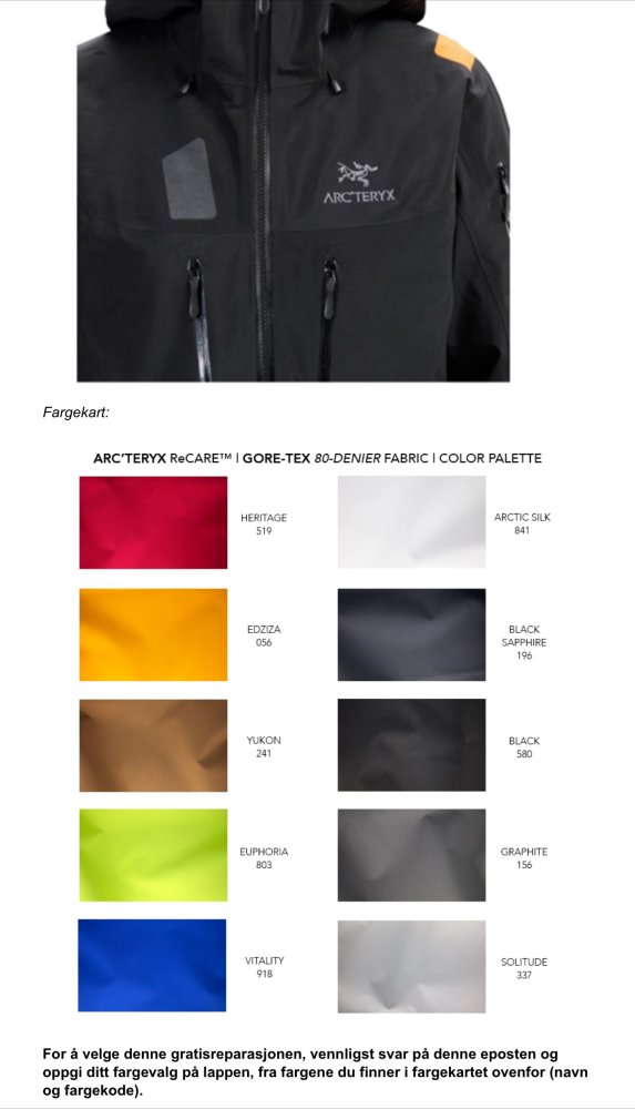 Jeg falt på en fjelltur og ødela min arcteryx alpha sv bak høyre albu. Ikke store riften men surt siden det var en ganske ny jakke fra 2022. Jeg kontaktet Arcteryx og sendte bilder. De trengte jakken inn for vurdering og jeg sendte den til Barents Outdoor som nå er norsk representant. Etter at de mottok jakken fikk jeg Mail om alternativ og jeg måtte selv velge lapp-farge på boten ut i fra nedenstående fargekart Det er ingen av disse fargene som ligner på min jakkes farge så jeg valgte den lyse. Jeg fikk jakken i dag og er svært godt fornøyd med resultatet! Det er proft utført og med bot både inni og på utsiden. Kostet selvfølgelig ingenting. Jeg tror ikke denne boten vil bety noe for min videre bruk av jakken, men det kan være greit for andre å vite om denne begrensingen i farge på boten.