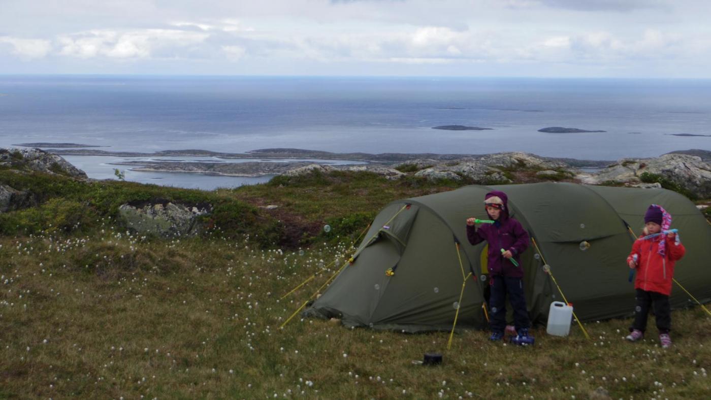 Værvarselet fra Yr kan vel ikke ta feil? Meldt sol med litt småskyer inn i mellom... Overnatting på toppen av Torghatten er målet for turen. Så snart jobb og barnehage/skole er ferdig denne fredagen - setter vi kursen mot Torget og oppstigningen. Jeg kjenner dette fjellet som min egen bukselomme - og denne gangen går vi en litt annen trase enn vanlig, for å skape litt variasjon. Vi går rett opp fra vest inntil vi treffer på stien som går langs med lysmastene opp. Jeg har pakket en brutal tung sekk til meg selv - uten omsyn til vekt. 4 soveposer, 4 liggeunderlag, 1 ekstra sovepose, 1 tarp, 4 manns telt, 1 liter saft, 2 bokser pils, 1 fl rødvin (fredagsvin het den og på plastikk) 3 liter vann, alt av kokeutstyr og middag - frokost og også en del brødmat i tilfelle, 2 brennere og 2 gassbokser, kaffekjel - blant mye annet. Jeg tar teltet i bunnen av sekken - enkelt å få tak i først når vi kommer frem. Lill tar en 5 litersdunk med vann samt klær og noe annet stæsj. Ungene har bare med en sekk som de deler på - med kosedyrene sine i samt noe småtteri. 264 meter klyving opp med tung vekt på ryggen burde gå bra. Jeg og ungene på 6 og 7 er kjappest opp mot aksla. Jeg klarer ikke å ta det med ro mens vi går oppover - det er mer slitsomt å stå og vente på de andre enn bare å gå opp uten å stoppe. Lill er ute av trening og gikk langt bak hele veien opp. Det er en stadig krangling om hvem som skal gå først mellom ungene - altså det motsatte av det mange andre sliter med tror jeg. Vi blir enige om at den som bærer sekken skal gå først. Det regner ganske mye når vi går opp her - vi hadde optimistisk nok ikke tatt regntrekk på noen av sekkene, men det går heldigvis bra for den korte oppstigningen. Hurtigruten passerer - og det er egentlig et ganske kult motiv med den regnbuen - men vi fikk ikke opp kameraet tidsnok til å få tatt noe bra bilde.. Vi har vært oppe på toppen av dette fjellet noen ganger vi nå, men jeg anbefaler ikke turen opp "langs kjettingene" som er strekt opp - for unger som ikke er vante med å gå/klyve i fjellet. Vi har hatt noen turer opp her og som nevnt er problemet heller krangling om hvem som skal gå først. Jeg tar ingen bilder opp her - har nok med å klare meg selv - og jeg og Kasper kommer opp til toppunktet først. Det kommer samtidig et ungt svensk par som sier at vi definitivt har valgt oss en fin teltplass! Sekken slengt i fra seg i gresset - det kommer en ganske kraftig regnbyge akkurat når vi kommer opp, men det går veldig fort å få opp teltet. Vi klarer akkurat å få opp ytterteltet før jentene kommer. Begynner å få trening og ungene er virkelig hjelpsomme med å komme i ordning. Teltet ved varden - vi er grunneiere selv her. De klarer fint å blåse opp liggeunderlagene selv nå - med Exped bag'en. Det er tydelig at ungene er slitne for den ene morsomheten etter den andre kommer - blant annet sier de at om noen kommer for å grave seg ned til Kina fra teltplassen vår vil få seg en overraskelse når bare kommer ned i Torghatthullet! Vi lager oss en luksuriøs middag - derfor vi har med såpass mye vann - det blir tidlig stille i teltet. Det er ungenes natt nummer 6 i telt i år mener jeg. Det regner ganske godt om natta - men med enkelte glimt av sol - som er ganske typisk for årstiden. Ungene fyller ut toppturboka dagen etterpå - altså i dag Lørdag.. Mens jeg pakker inn saker og ting inni teltet - herjer ungene med såpebobler. Når jeg selv var "liten" gikk vi ofte ut på kantene av dette fjellet - som er svært loddrett. Jeg tror at jeg den gangen ble kurert for å gjøre det igjen. Derfor har jeg nedsatt forbud mot løping når vi er på denne toppen - og de må holde seg i nærheten av teltet. jeg bruker aldri å ta de med ut mot stupene. Jeg velger å gå en rute ned som er litt mindre ambisiøs enn den kjettingruta, men det innebærer allikevel ganske heftig klyving - og 2 steder må vi helt av med sekkene og lange de til hverandre nedover. Det finnes ikke antydning til høydeskrekk hos noen av dem - selv om stien mange ganger går rett ved bratte stup - så har det ingen betydning. Vi kommer helskinnet ned også denne gangen - og nå har vi gjort det. Men vi gjør det ikke en gang til akkurat her!