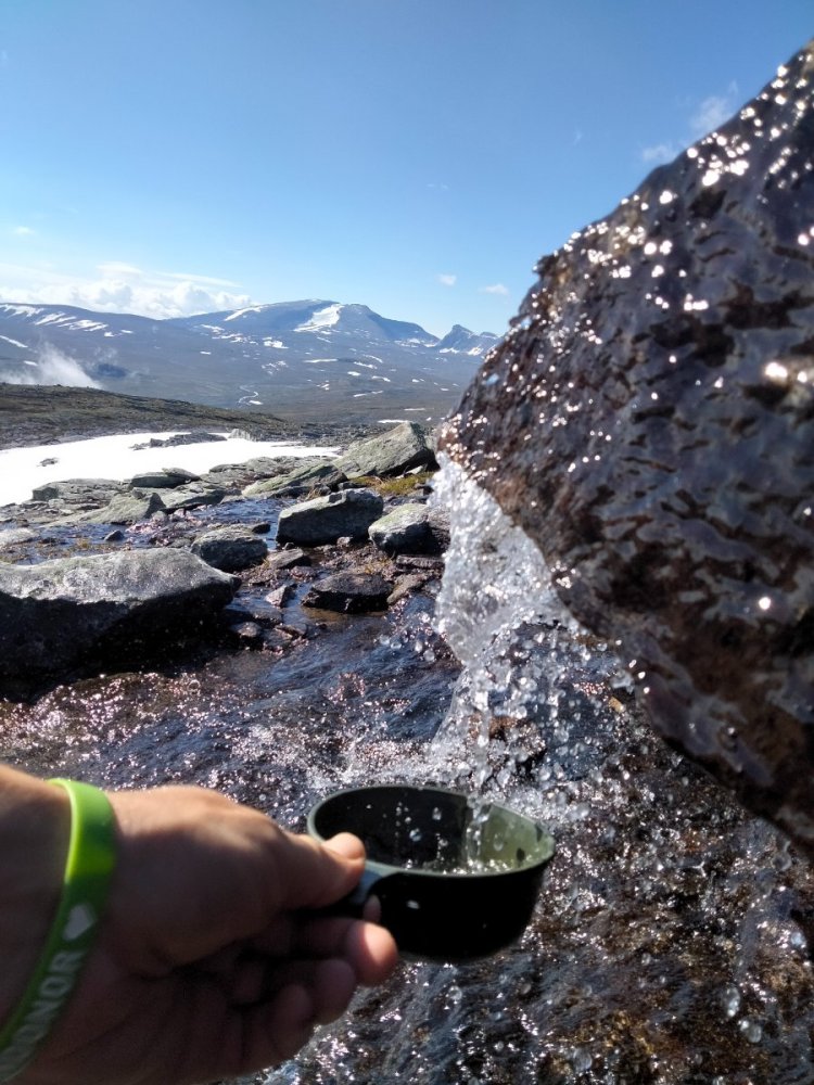 Nå når solen har «snudd» begynner tankene å vandre mot lysere tider, lange sommernetter og flotte teltturer i nye terreng. Da passer det godt både å starte planleggingen av nye turer og se tilbake til turene som har vært. Sommeren i år, om den kan kalles sommer, stod to uker drømmetur på planen. Jeg skulle ved hjelp av apostlenes hester vandre på kryss og tvers av Dovre OG Trollheimen, helt hjem til min egen ringe bolig. Vel, nå ble det bare én uke, og bare Dovre, mer om det siden. Etter å ha prøvd begge deler har jeg fått en forkjærlighet for A til B-turer (kontra rundreiser). Da er man garantert nytt terreng hver dag. Det er god motivasjon for trøtte bein! Ruten Områdene for sommerens «langtur» var valgt av ulike grunner. Dovrefjell er ukjent terreng for meg, det har egentlig bare vært et område man passerer på tur sørover. Det store trekkplasteret er moskus. Jeg har siden jeg var barn vært fascinert av disse urdyrene, og hadde store forhåpninger om å få sett dem på (ikke for) nært hold. Ellers har området plenty med fiskevann og ikke altfor mange turrapporter (noe som indikerer lite folk). De fleste som vandrer her, går nok etter toppene. Jeg går rundt toppene. Alltid. Speiding etter moskus, med blikket rettet mot Kjelsungdalen. Målet var å bruke turiststiene i minst mulig grad. Dette gir to store fordeler: man unngår folk og man får orientert. Begge deler er positive parametere. Starten gikk fra Nysætre like nord for Fokkstugu. Herfra gikk jeg Kjelsundskardet videre gjennom Kjelsungdalen, vestover til Tverråbotn før kursen gikk nordover mot Leirsjøtelet og Åmotsvatnet. Derfra ble det mye turiststi til Flatbekktjønna og Snøfjellstjønna før turen ble avsluttet i Dindalen etter åtte fine dager på tur. Grøna bød på utfordringer. Til slutt måtte jeg krype til korset og vade over. En frisk opplevelse. Åmotsdalshytta. Vannet kan krysses der det nesten deles i to, i sær om man er smart nok til å bruke høye støvler. Dyrelivet Som sagt var et av de store ønskene med turen å få sett moskus. Om jeg fikk et glimt av villreinen var det naturligvis et pluss. Fjellrev var minst sannsynlig, men hadde helt klart ikke sagt nei takk. Allerede fra bilturen til start satt jeg med blikket festet vestover, på speiding etter svarte «klumper» i terrenget. Første camp ble ved Vindbustjønne (for øvrig mistenker jeg at den er uten fisk), og jeg vurderte frem og tilbake om jeg skulle ta Kjelsungdalen eller Mjogsjødalen, jeg endte opp med førstnevnte og sjelden har jeg vært så fornøyd med veivalget. På dag to vadet jeg Grøna, en frisk opplevelse, og steg inn i Kjelsungdalen. En på alle måter vakker dal. Grønne sletter, fine fiskevann og stupbratte fjell. Vinden og regnet pisket i ansiktet der jeg svettet meg oppover bakkene med 30 kilo på ryggen. Jeg var i zombie-modus, men lot blikket vandre fra tid til annen. Plutselig blir jeg var en mørk skygge i lien ovenfor meg. Man skulle jo tro jeg ble euforisk over å endelig få sett dette dyret på nært hold, men hjernen jobber på høygir sånn omtrent slik: «Å dæven døtte, der står moskus-far. Max 50 meter fra meg». Blikket går febrilsk for å se etter to ting: -hvor er familien? -og hvor kan jeg søke dekning? Moskusokse på tur. Bilde tatt etter at jeg har trukket meg et godt stykke unna. Det var naturligvis ikke så mye som en steinblokk i kilometers omkrets, så her var det bare å legge om kursen uten noen videre dikkedarer. Først når jeg får en avstand på minst 150 meter tør jeg stoppe opp og se hvordan det ligger an. Moskusoksen har naturligvis hatt full kontroll på meg lenge. Nå rister han på hamsen og vandrer bort fra meg. Omsider roer pulsen seg og jeg kan knipse et (ikke veldig bra) bilde. Snakk om naturopplevelse, og selveste jackpoten allerede på dag 2! Du må zoome hardt for å se dyrene, men dette var langt mer behagelig avstand! Et par kilometer lenger oppe i dalen får jeg se en hel familie, inkludert et par kalver, som pludrer rundt på en slette 2-300 meter nedenfor meg. Mye mer behagelig avstand, og jeg setter meg godt til rette på en stein og bare nyter synet – lenge. Som om ikke moskus-bonanzaen var nok vekker jeg en flokk på 15-20 reinsdyr som krysser dalen et stykke foran meg. Det er en lykkelig mann som stabber seg videre oppover dalen og topper den herlige naturopplevelsen med to ganger 4 hekto steikfisk i siste vann før vannskillet. Dag 2 på denne turen er den mest klokkeklare terningkast 6 jeg noensinne har hatt på en fjelltur. En fjellfant forsøker å fordøye dagens inntrykk ved Kjelsungvatnet 1329. I ettertid viser regnskapet at jeg de første 6 dagene så flere moskuser enn mennesker. Det sier jeg meg fornøyd med! Været Været var begredelig, men det glimtet da til innimellom. Våren ’22 var særdeles snørik i dette området, og selv om jeg dro ut i midten av juli fulgte jeg spent med på snø- og is-smelting de siste par ukene. Det gikk akkurat, og det ble lite snøgåing. Dog var sommerværet av det begredelige slaget. Sur nordvest, ensifret antall grader og hyppige regnbyger. Om nettene var temperaturen ned på 1-2 grader. Dette innebar MYE teltliv, og det aller meste av matlaging ble gjort i fortelt. Jeg er glad i teltet mitt, og hadde med meg en knakende god bok, men jeg kjente på savnet av camplivet, hvor man kan koke seg litt kaffe, fiske litt, slappe av i solskinn… Det var først på dag 7 jeg tok frem solkremen og kunne lette noe særlig på antrekket. Da ble også mat tilberedt utendørs, fiske ble tatt, jeg forspiste meg på nystekt ørret og rullet rundt i lyngen – altså slike dager som man drømmer om på forhånd! Fikk også sjekket værmeldingen mellom solkremsmøringen, og når den meldte minst like dårlig vær neste uke var saken klar – jeg stanser på Oppdal! Det ble MYE teltliv. Da kommer man langt med kaffe og en god bok (og kartlesing naturligvis, mye kartlesing). Solen viser seg frem, og om man kla