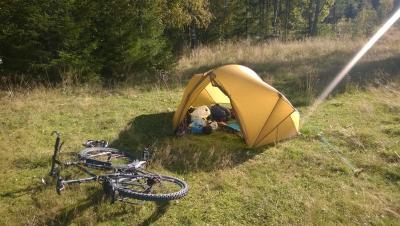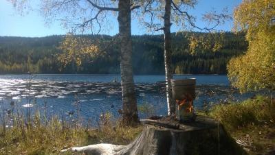 Helgen tur kommer nu som turrapport! Lagom tills det är helg igen (hurra!)... Så, efter många om och men så kom jag mig äntligen iväg på tur för att testa mitt tält som det var avsett: För cykelcamping. Givetvis blev jag uppehållen på jobbet på fredagen, så jag hann inte ens handla mat på vägen hem. Det löste sig genom att svänga in på Kiwi på väg ut på turen på lördag morgon. Färden gick vidare till Sørkedalen där jag tog en specialfruktost på kaféet/butiken som finns där. Bra ställe. Gulrotskakan är nästan, men inte riktigt, i klass med Gupu gårds. Så hade dom något slags smörgåsar också, med salladsblad och någon klet på. Kleten visade sig vara räksallad och troligen den bästa räksallad jag ätit. Färden gick vidare till Kikut. Mycket folk i området och vid Kikut var det fullt med cyklister.Det verkar som att vanligt folk också upptäckt dom fina cykelmöjligheterna i Nordmarka. Inte bara kolfibercyklar har utan även helt vanliga. Och så jag, med full packning och en Kona Cinder Cone från 1989... Planen att åka till Katnosa ändrades till Gjerdinge damm, i första hand, kanske med fortsättning norrut. Vid ett vägskäl tar jag sedan fel väg. Inser snart att något är galet eftersom det är nedför och solen kommer från höger istället för rakt bakifrån som den borde. Vänder tillbaka till korsningen. Troligen har skylten, om det någonsin suttit någon där, avlägsnats i samband med det otäcka kallhygget som nyligen gjorts i området. Vid nästa korsning tar jag en rövare och provar en annan väg til Gjerdinge damm än den jag cyklat förut. Detta visar sig fungera bra. Framme. Sol och fint, men en del vind. Jag känner mig sliten men bestämmer att det räcker med cykling för idag, fast klockan bara är 14-någonting. När jag skall sätta upp tältet upptäcker jag att jag på något sätt bara fått med mig 5 pluggar istället för dom 6 som behövs. Snabbt och elegant DIY-ar jag mig en ny plugg av en pinne som praktiskt låg i skogskanten. Det fungerade ganska bra med tältet bortsett från kondensen. Men vad annat är att vänta i ett endukstält, vid en strand, med temperatur runt nollan? Klart som fan att det blir kondens. Men det här var i mesta laget. Lärdom: Vid liknande plats och temperatur så bör man ha 2-dukstält eller tarp. Och eftersom det är bikepackning vi talar om här så blir ett 2-dukstält på tok för tungt och stort. Tarp alltså. Skall testas inom kort, men på annan plats. Dagen efter började fint med bacon till brödet och kaffet. Någon hade ställt upp ett bord med sittplatser vid stranden. Trevligt. Nu gick färden till Katnosa. Planen var att låna en kanot och paddla lite, om bara vinden gav sig. Men det gjorde den inte, snarare tvärtom. Så jag torkade mitt tält och lite annat i solen på läsidan om huset. Några gånger tänkte jag "fan, det blåser ju inte mycket nu, och varmt och skönt, jag skall nog paddla lite i alla fall." Så gick jag runt hörnet på huset ut i nordanvinden och konstaterade att, nej, det skall jag inte alls. Så småniongom gav jag mig av söderut och tog lunch vid sjön där man svänger ned mot Sørkedalen. Eftersom jag hade så lite bensin kvar i köket och det fanns torr ved så plockade jag fram mitt pocket-stove. Så kom det till nytta också... Så, ja... Efter lunch så var det bara att rulla hem då. Kikut. Massa folk som tagit sig dit. Framme! ... och tältet uppe! Kvällssol We're on the road to nowhere... Kyparn, kan vi få in en bacon, tack! Katnosa. Oerhört elegant med kablen dragen just där alla skall ta foto... Lunch. Pocket stove igång. Ett litet djur landade på min svettiga sko...