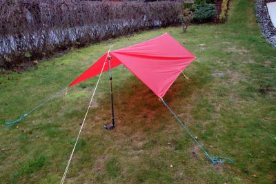 Tanken har länge funnits på en liten, lätt tarp att ta med för att ha om det t.ex. råkar börjar regna just när man skall ha lunch eller kaffe. Ett rastskydd, först och främst. Men det visade sig att den i nödfall även går att använda för övernattning, speciellt om man sätter upp den lågt. Klassisk A-konfiguration. Satt opp på tvären. Det är så här den är tänkt att användas, ungefär. Eller om man har några träd tillgängliga så använder man dom. Men som ett enkelt litet rast-rengskydd, alltså. Här är den oppsatt på diagonalen. Detta var knepigt, men det är den konfiguration som ger mest plats under. Luftigt och syddar mot regn. Kan använas t.ex. istället för yttertätlet över Hilleberg Akto. Man sparar ett halvkilo + en massa plats på det jämfört med yttertältet. Duger i skogsterräng. Vikten på tarpen är ca 200 gram inkl linor. Sorleken ca 250×150cm. Stor som en 0,5L dricka-flaska, så den passar bra i sidofacket på ryggsäcken. Materialet är silikonbelaggd nylon.