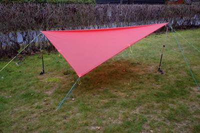 Tarpen jag använde på min hitills enda tarp-övernattningstur köptes på biltema för en famtilapp. Den väger dock 90gram/m². 750 gram för hela grejjen. Finns i vit eller en diskret grön kulör. Eftersom jag cyklade ut till camping-stället kunde jag ju strunta i vikten. Dessutom hade jag den redan innan. Barduner och tältpinnar tillkommer och kostar nog någon 100-lapp totalt. Men 150NOK skall man nog kunna klara sig på. Den går inte sönder i alla fall. Det är en sak som är säker. Dovrefejll och Helsport håller bra dom också. Är lite lättare, och inte så jättedyra dom heller. Jag har gjort egan tarp-dukar senare, som ligger på 40gram/m². Materialet kostar inte mycket, men det tar en del tid att göra en.