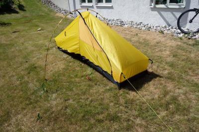 6. Hilleberg säljer ett kit så man kan sätta upp enbart innertältet. Problemet är att kitet är svårt att få tag i och portot om man skickar efter det kostar lika mycket som själva sakerna. Så jag gjorde en kopia. En stopper för var ände av tältbågen. Ett snöre emellan och ett elastiskt snöre som lindas runt tätltbågen upp till försa slingan på innertältet. Precis som på hillbergs orginal. Man sparar väldigt mycket plats i packningen om man klarar sig med innertältet. Och det gör man i skyddad terräng om det inte regnar. Nästa: Nytt yttertält till Akto, i 40g/m². Räknar med att få ned vikt och packvolym radikalt jämför med orginalet.