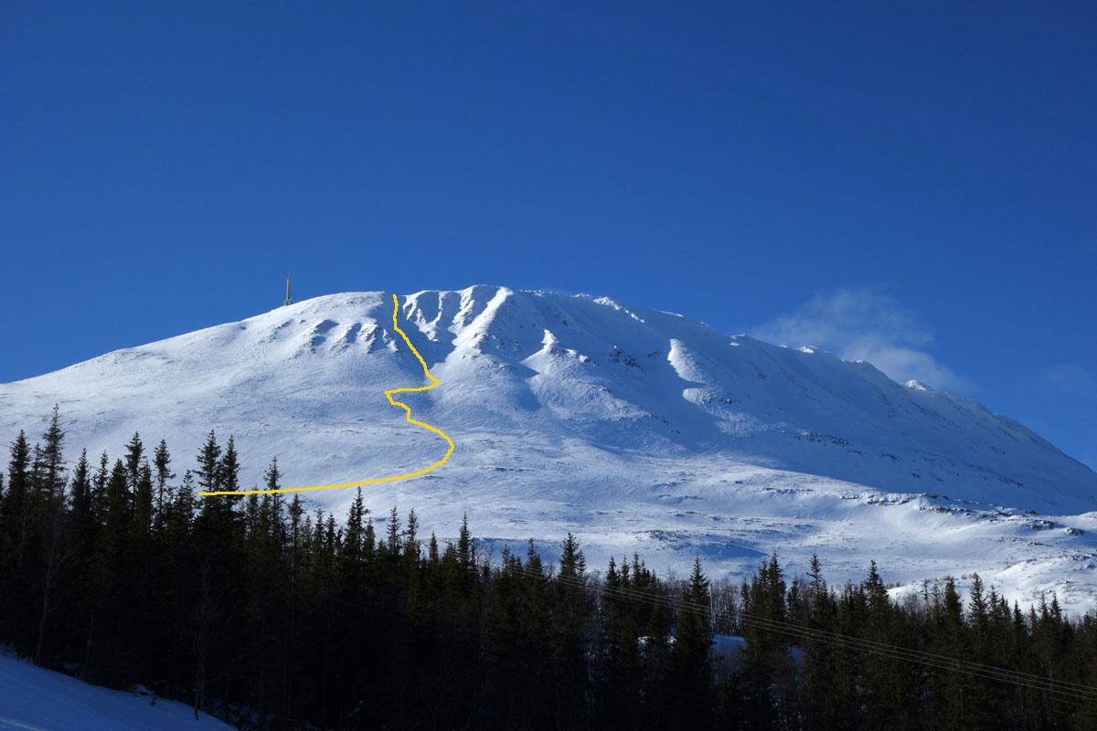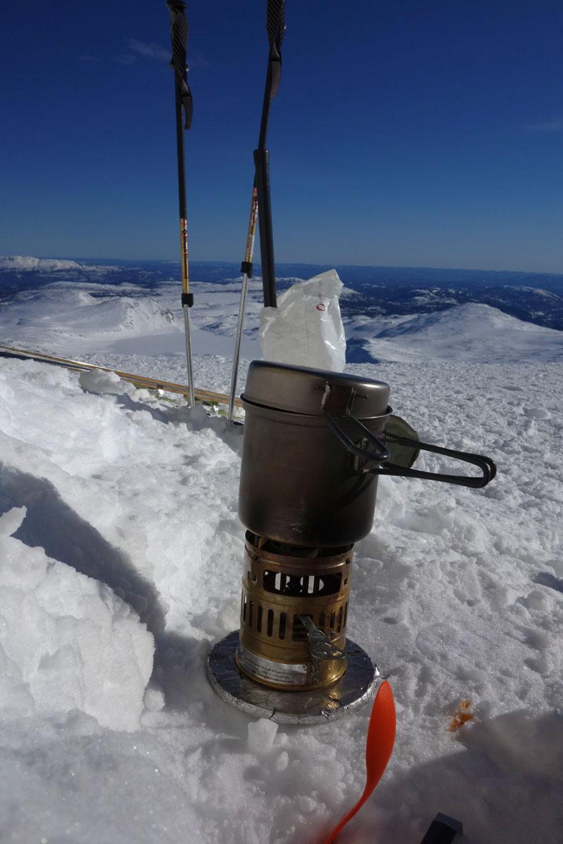Fann ett bra. Brant som fan, men det borde gå. Efter att ha varit på toppen och vänt, så blev det lunch. Jag hade kvällen innan enorma problem att bestämma mig för vilket kök jag skulle ha med, men valet föll på Optimus Svea. Så dags för nedkörningen... Precis när jag skulle åka ned så kom det lite moln (som bildas runt toppen av och till) och solen bröt igenom. I molnet bildades en halo, men min egen lilla skugga. Jag funderade om om detta var ett gott eller dåligt tecken från vädergudarna. Eftersom jag kom ned i ett stycke så antar jag att det var ett gott tecken. Trots vissa problem på vägen ned. Men vam fan har sagt att allt ska gå så lätt hela tiden? Nåja. Skidor på, så började jag nedfärden. Gled lite hit, lite dit. Provade en sväng. Popp! Där for ena skidan av. Tur att jag hade fångstrem. Lite knepigt att plocka upp skidan och få den på foten igen när man halvligger i en 50 graders sluttning, men det gick. Inga flera kracher på vägen ned, men det var usel snö och brantare än jag trodde. Det som såg ut att plana ut till ca 30 grader visade sig vara ca 45... OK, det går ju, speciellt om snön är bra (vilken den alltså inte var) men ingen bra åkning. Å andra siden, med den snökvalitet som var på väg upp så var det ingen bra åkning någonstans på det berget och det var väl lite därför jag tog rännan; det blir inte bra någon annanstans, så varför inte testa, så är det gjort. Nåväl, längre ned på begret var det vindpåverkat och solpåverkat om vart annat, så man fick navigera sig fram ned till skogen. Inga konstigheter. Så, efter ca 4 timmar var jag tillbaka nede vid bilen igen. Inte illa. Soligt och fint + att jag nu varit på gaustatoppen. Jag hade bara varit till antennen tidigare.