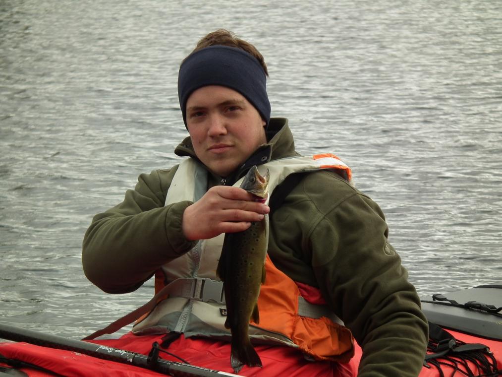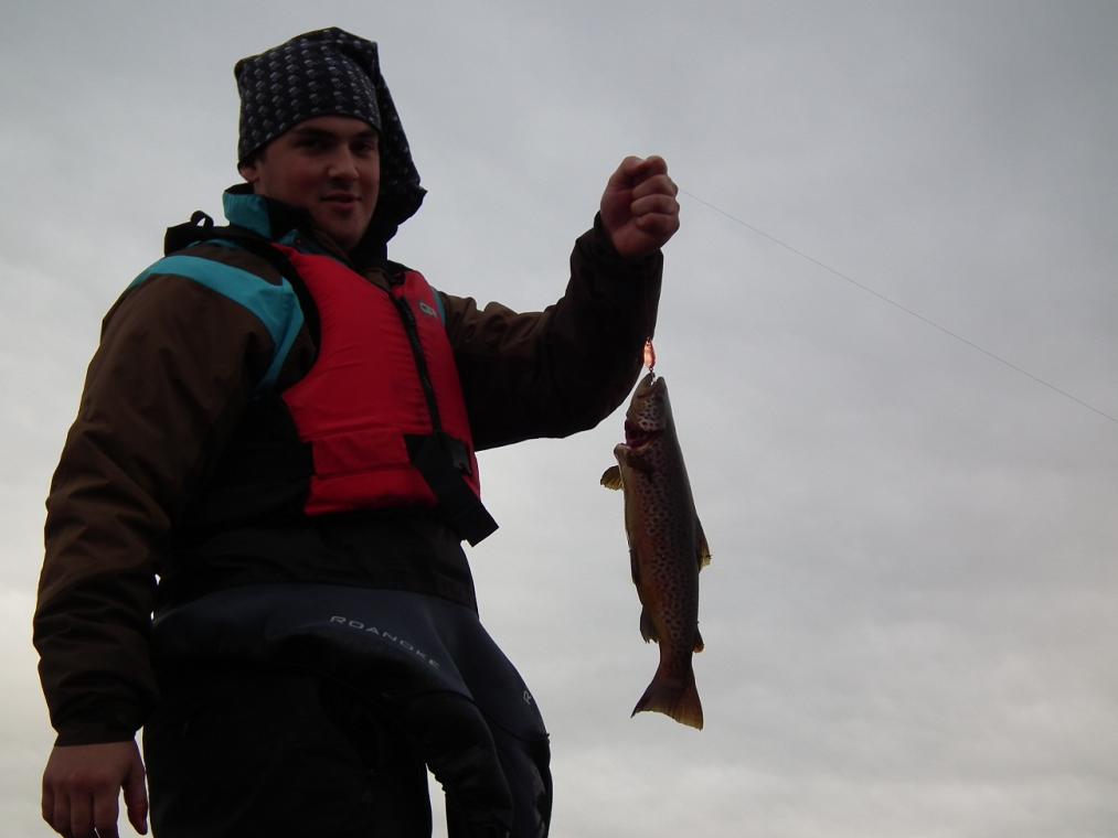 Jeg legger ut først med samme sluken jeg hadde god resultat med i fjor. 200m fra lang passerer jeg en holme, og midt i sundet der hogger noe i snøret. En sprelsk og hissig ørret blir forsiktig sveivet inn og blir trygt tatt hand om av fiskeren, altså meg. Vekta ligger på 700gr. Showet er i gang.