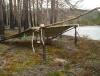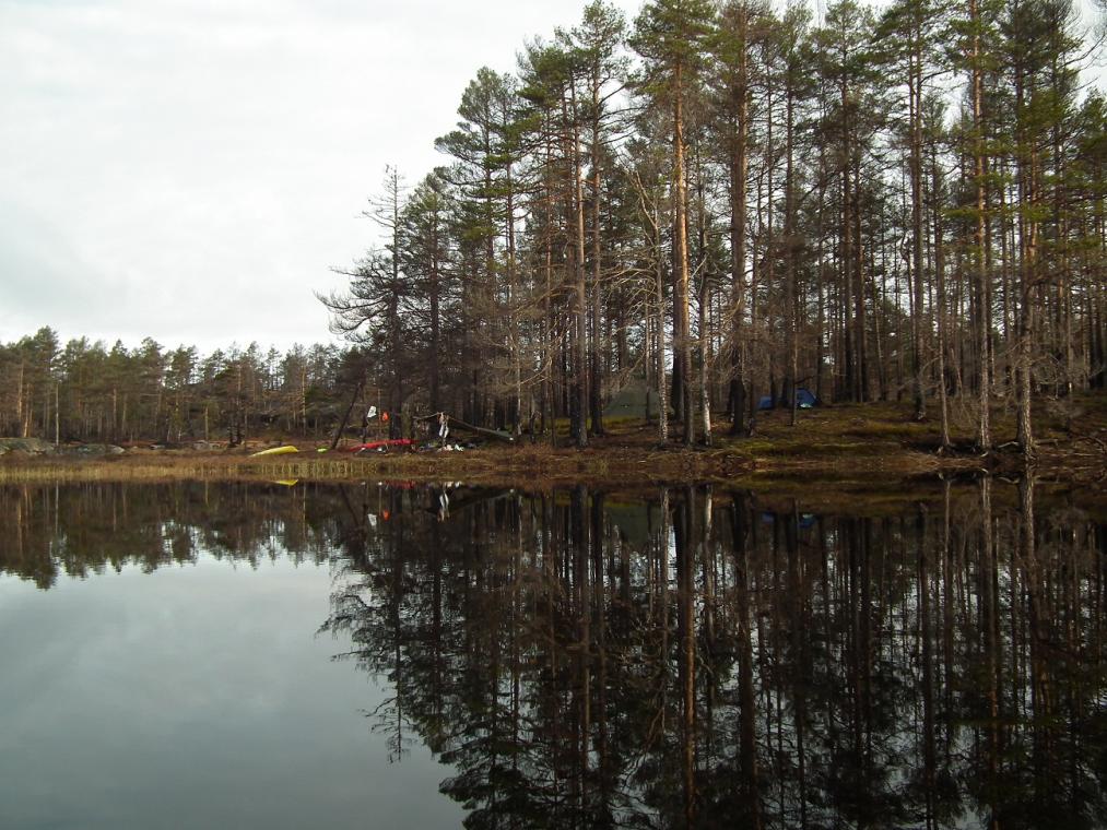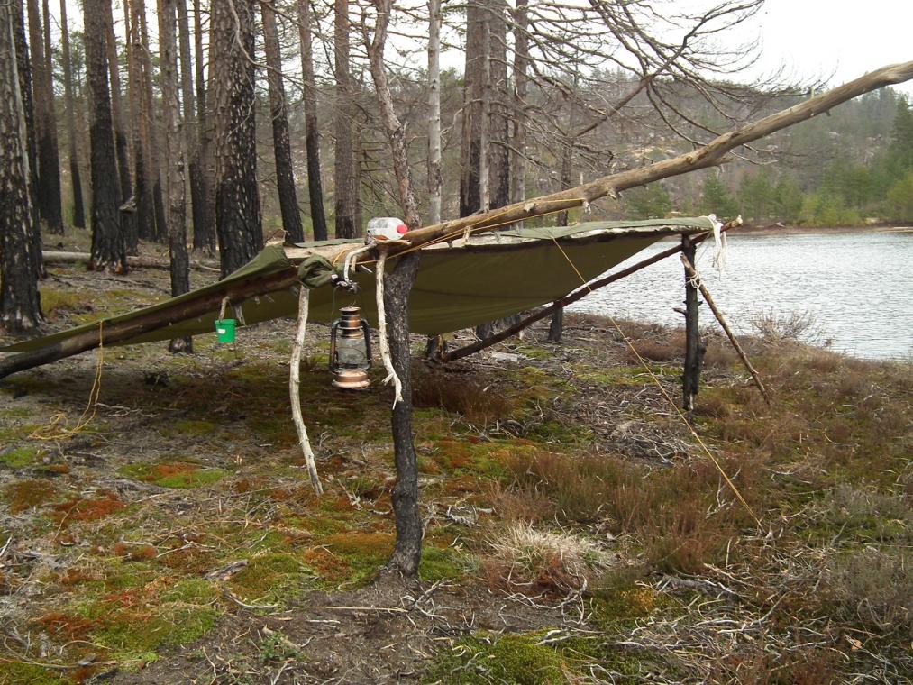 Det første vi gjør er og sette opp lavoen og teltet. Når de er oppe henger vi opp tarpen nede ved vannkanten for å ha noe og trekke under om de skulle sige på noe regnvær under matkosen.