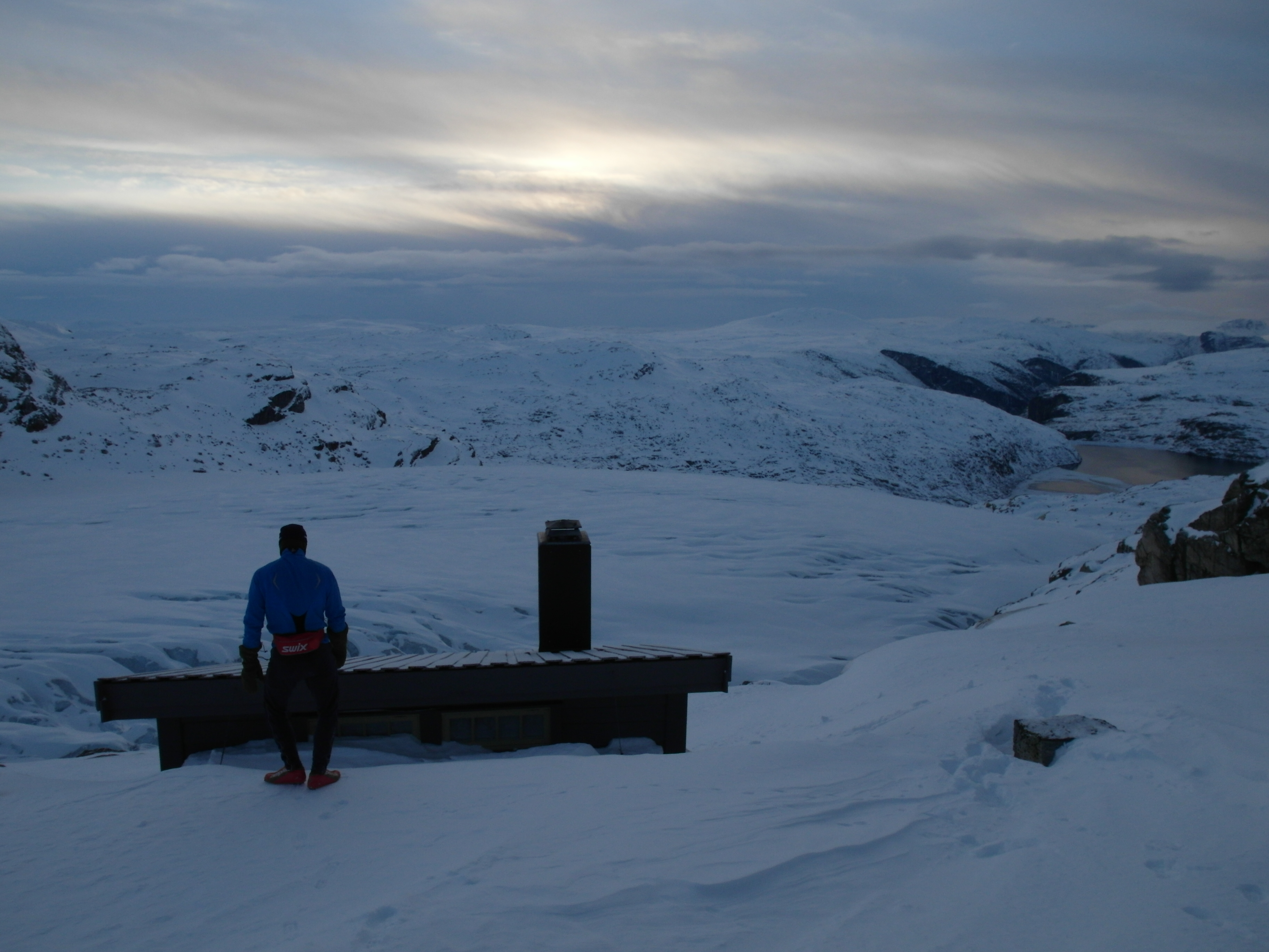 Denne turen gikk for ganske nøyaktig tre år siden, desember 2012. Jeg hadde gått mye på ski i marka, men hadde veldig begrenset erfaring med skiturer på fjellet. Det var jeg og min samboer som hadde planlagt turen, og vi hadde lagt en veldig ambisiøs plan. Slik var planlagt rute: Dag 1: Ankomme Finse stasjon med toget klokka 13:00, deretter gå til Demmevasshytta via vestsiden av Hardangerjøkulen (ca 16 km) Dag 2: Være på Demmevasshytta, evt gå til Rembesdalseter Dag 3 og 4: Her hadde vi ikke noe spikra, men hadde Hallingskeid (ca 20 km fra Demmevasshytta) som et alternativ (og derfra eventuelt gå tilbake til Finse på nordsiden av jernbanen (ca 22 km), eller bare ta toget fra Hallingskeid). Et annet alternativ vi så for oss var å følge ruta til turstien fra Rembesdalseter tilbake til Finse på vestsiden av Ramnabergnuten. Toget vårt gikk fra Finse klokka 14:00 på dag 4. Her er en røff skisse av ruta og muligheter vi så for oss: Ingen av oss hadde fjellski, så vi gikk på vanlige langrennski. Ellers hadde vi med oss én spade, normal vinterutrustning, DNTs turkart over Finse (1:50 000) og mat for de fire dagene. Vi følte oss ganske sikre på kart og kompass, og tenkte at det var store kjennetegn på turen. Vi hadde begge to tursekker, og ingen pulk. Klar til avgang fra Finse dag 1, på vei mot Demmevasshytta Vi startet i nydelig vær, dyp puddersnø og rundt -20 grader. På første halvdel av Finsevatnet gikk det ganske greit, her hadde noen gått med ski og pulk før oss. Men da pulksporet forsvant skjønte vi at det her blir tungt, langrennskiene gikk dypt ned i snøen og sekkene sørget for at balansen var en utfordring. Det ble ganske mye frustrasjon opp bakkene fra Finsevatnet mot kanten av Hardangerjøkulen. Da vi endelig kom opp på breen var det blitt mørkt, og vi begynte å innse at det kommer til å bli veldig vanskelig å nå Demmevasshytta denne kvelden. På kartet vi hadde var det merket av en nødbu som heter Ramneredet på østsiden av Ramnabergnuten, og vi begynte å speide etter denne. Etter vært ble vi helt klare over at Demmevasshytta var det bare å glemme, men vi så heller ingen tegn til Ramneredet selv om vi så hele østsiden av Ramnabergnuten (det var helt mørkt, dog stjerneklart så vi hadde litt sikt). Klokka var nå rundt 20-21, og jeg foreslo forsiktig at vi bør kanskje tenke på å grave oss ned (min svært beskjedne erfaring fra å sove i snuhule var fra første året på VGS, som begynte å bli noen år siden da). Dette var ganske uaktuelt for min samboer, og hun var klar til å finne Ramneredet. Etter en stund til uten noe tegn til Ramneredet og begge begynte å bli ganske utslitte og kalde, gikk hun med på snøhuleforslaget. Så da gravde vi på tur med den ene spaden vi hadde, der den ene gravde snø ut av hula mens den andre skuffa det videre ut med hendene. Etter hvert knakk skaftet på spaden, så vi hadde bare bladet igjen og følte at situasjonen var litt håpløs. Men etter hvert fikk vi en ganske romslig snøhule, og vi fikk til slutt varmet opp Real Turmat og sovnet kjapt i soveposene våre. Jeg vet ikke helt nøyaktig hvor vi gravde oss ned, men et sted på kanten av breen: Da vi våknet dagen etter var det overskyet, og fortsatt veldig kaldt. Planen nå var å komme seg til Demmevasshytta. Fra der vi sov og til Demmevasshytta var det flatt eller nedover (bortsett fra siste kneika opp til hytta), men terrenget var brattere en til nå så det var litt krevende til tider i den dype snøen, men etter litt kaving nådde vi ned til Nedre Demmevatnet. Vi viste at hytta nå var like rundt fjellknausen, men vi skjønte ikke helt hvordan vi skulle komme oss rundt. Alternativ 1 var å gå opp på breen fra vannet, men breen hadde store og dype sprekker, så dette så utrygt ut; Alternativ 2 var å klatre opp fjellsiden sør-vest for vannet og følge høyden rundt til hytta. Vi gikk for alternativ 2, festet skia til sekken og begynte å sparke spor oppover i relativt løs snø. Vi kom ganske langt opp, men det ble brattere og vi anså at snøen ikke var hard nok, og vi ville heller ikke ta risikoen på å falle ned om vi skulle miste balansen med sekk og ski, så vi gikk ned igjen. Det gjensto da et forsøk på alternativ 1, breen. Her gikk vi i sikksakk mellom sprekkene, og etter noen nervepirrende minutter kom vi oss til fjellsiden der vi kunne klyve opp ganske greit og omsider komme frem til hytta. Jeg har seinere lest om andre som har kommet til hytta og beskrevet det som å gå inn i et museum, og akkurat den følelsen fikk vi også når vi gikk inn stua, og utsikten var virkelig fantastisk. Kvelden ble brukt til å tilberede en fiskemiddag vi hadde med oss, og til å bare slappe av. Vi bestemte oss ganske kjapt for å skrinlegge videre skiturer, og heller ta en fridag på Demmevasshytta og samme rute tilbake på siste dagen. Neste dag var det strålende sol igjen (men fortsatt bitkaldt). Vi gikk opp til Luranuten (toppen bak Demmevasshytta), bakte boller (vi kjøpte en 1-2-3 bollepose som lå der, og hytta har gassovn) og nøt av den utrolige utsikten. På kvelden leste vi i heftet som forteller historien om Demmevasshytta, der det blant annet står om katastrofene som oppsto da Rembedalskåka brast (brearmen som man kan se fra hytta, den samme vi gikk på siste biten istedenfor å klatre opp fjellsiden) og historien om de tre skigåerne som døde på vei over Hardangerjøkulen til Demmevasshytta etter å ha kommet i skikkelig uvær. Denne hytta har sjarm og en spennende historie bak seg (den originale Demmevasshytta var en anleggsbrakke for arbeidere som lagde tunell i fjellet som skulle regulere vannstanden i Nedre Demmevatnet, for å forhindre katastrofer der breearmen brast (fenomenet er kalt jøkulhlaup)). Utsikten fra hytta mot Simadalen Utsikt mot Rembedalskåka Hytta. Legg merke til stålvaierne på hver side som er slått over taket. Bollene står til heving Toget gikk fra Finse klokka 14:00 den siste dagen, vi tok 