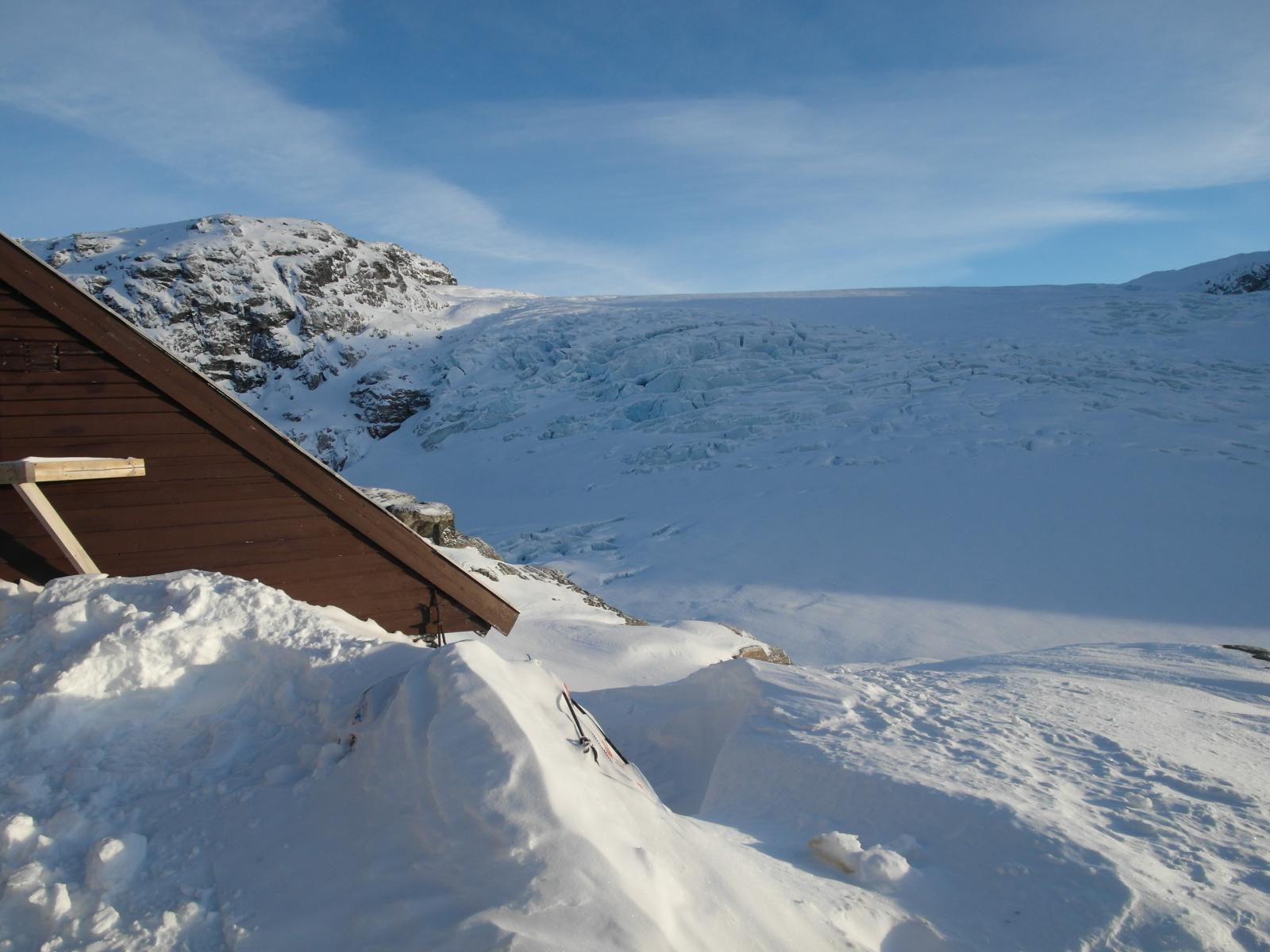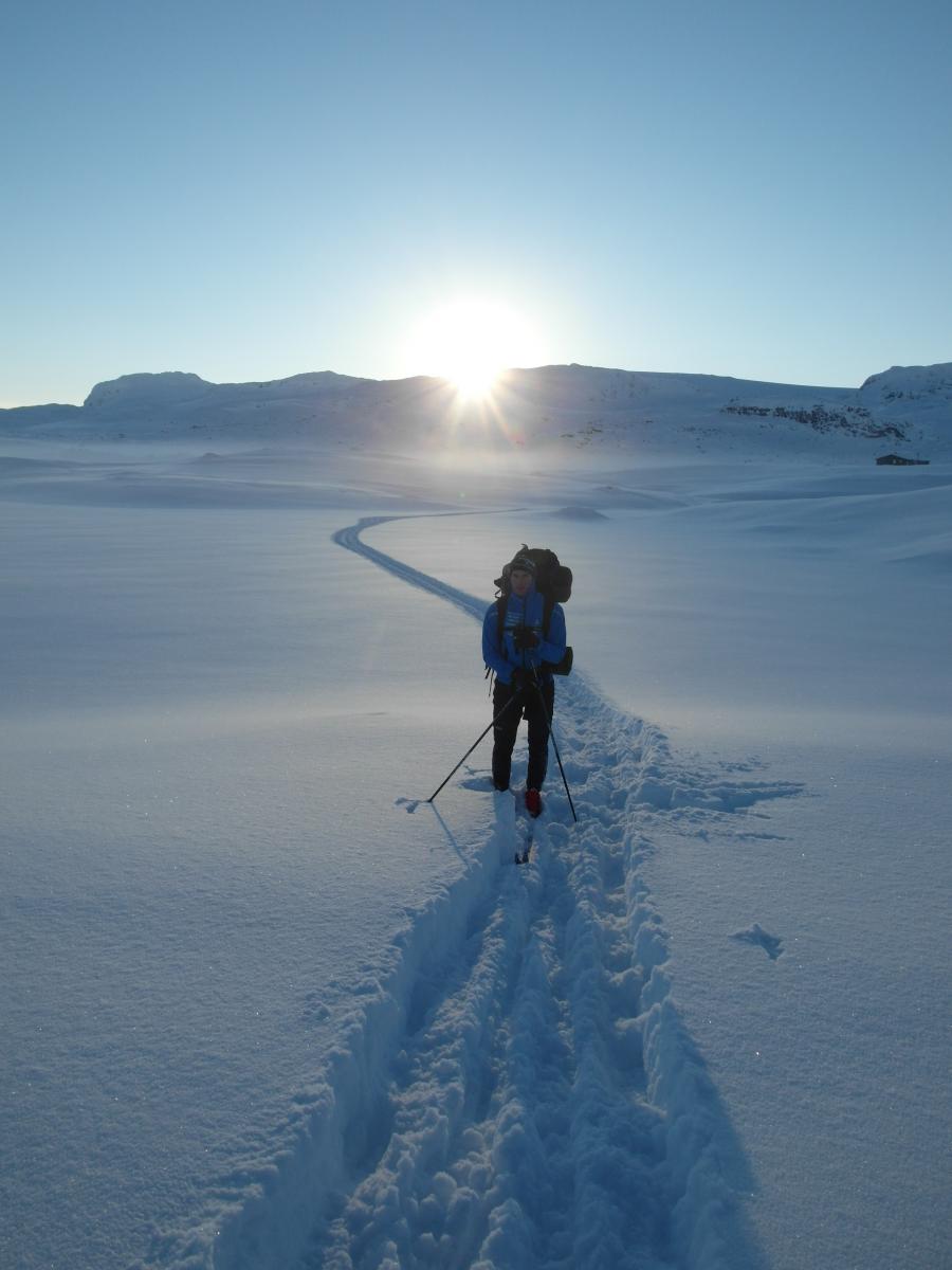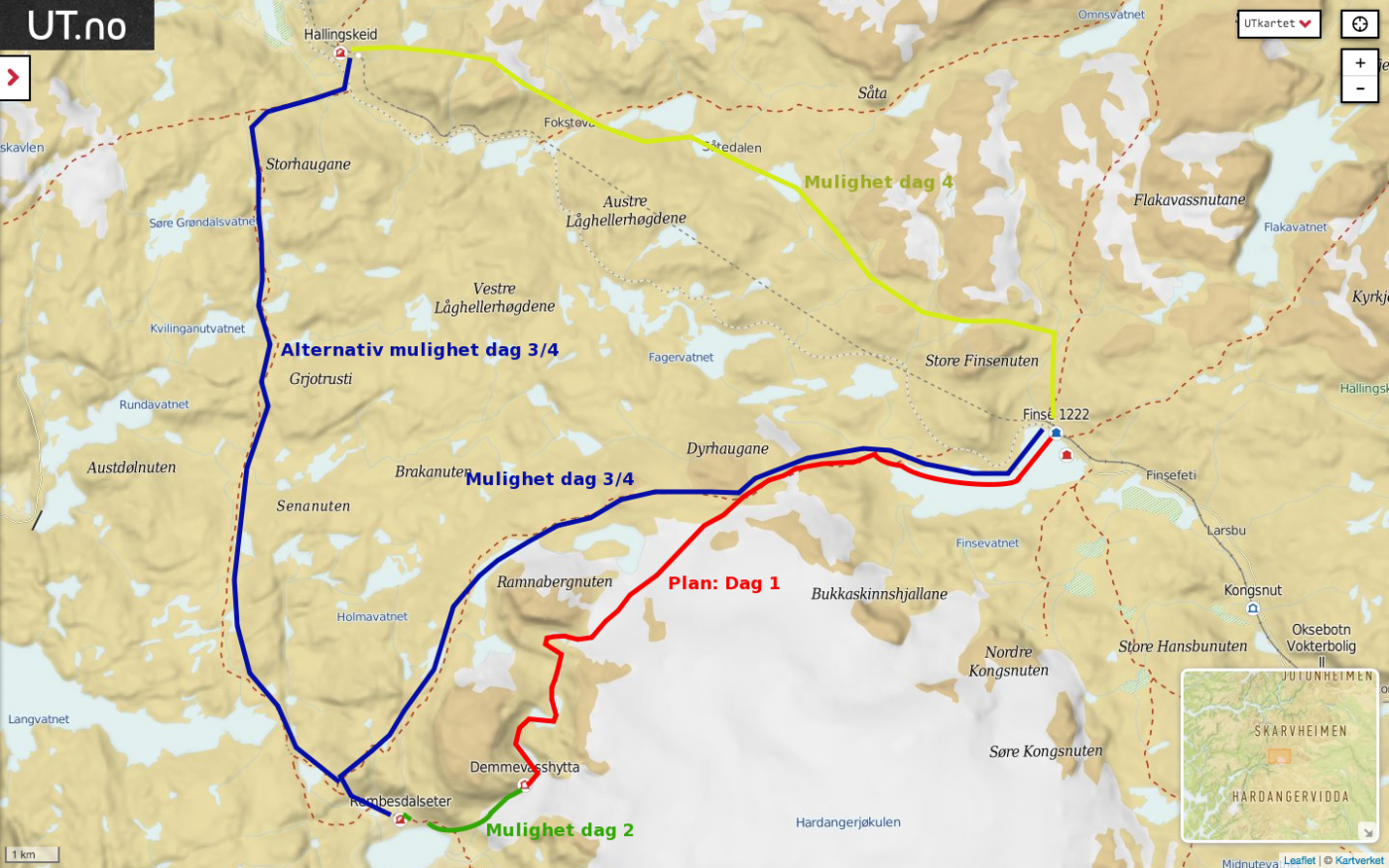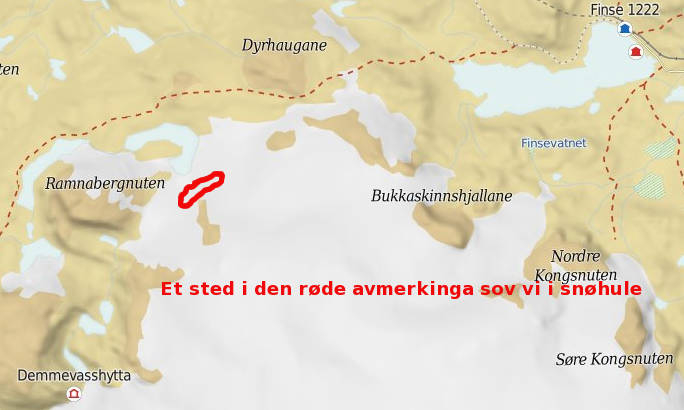 Denne turen gikk for ganske nøyaktig tre år siden, desember 2012. Jeg hadde gått mye på ski i marka, men hadde veldig begrenset erfaring med skiturer på fjellet. Det var jeg og min samboer som hadde planlagt turen, og vi hadde lagt en veldig ambisiøs plan. Slik var planlagt rute: Dag 1: Ankomme Finse stasjon med toget klokka 13:00, deretter gå til Demmevasshytta via vestsiden av Hardangerjøkulen (ca 16 km) Dag 2: Være på Demmevasshytta, evt gå til Rembesdalseter Dag 3 og 4: Her hadde vi ikke noe spikra, men hadde Hallingskeid (ca 20 km fra Demmevasshytta) som et alternativ (og derfra eventuelt gå tilbake til Finse på nordsiden av jernbanen (ca 22 km), eller bare ta toget fra Hallingskeid). Et annet alternativ vi så for oss var å følge ruta til turstien fra Rembesdalseter tilbake til Finse på vestsiden av Ramnabergnuten. Toget vårt gikk fra Finse klokka 14:00 på dag 4. Her er en røff skisse av ruta og muligheter vi så for oss: Ingen av oss hadde fjellski, så vi gikk på vanlige langrennski. Ellers hadde vi med oss én spade, normal vinterutrustning, DNTs turkart over Finse (1:50 000) og mat for de fire dagene. Vi følte oss ganske sikre på kart og kompass, og tenkte at det var store kjennetegn på turen. Vi hadde begge to tursekker, og ingen pulk. Klar til avgang fra Finse dag 1, på vei mot Demmevasshytta Vi startet i nydelig vær, dyp puddersnø og rundt -20 grader. På første halvdel av Finsevatnet gikk det ganske greit, her hadde noen gått med ski og pulk før oss. Men da pulksporet forsvant skjønte vi at det her blir tungt, langrennskiene gikk dypt ned i snøen og sekkene sørget for at balansen var en utfordring. Det ble ganske mye frustrasjon opp bakkene fra Finsevatnet mot kanten av Hardangerjøkulen. Da vi endelig kom opp på breen var det blitt mørkt, og vi begynte å innse at det kommer til å bli veldig vanskelig å nå Demmevasshytta denne kvelden. På kartet vi hadde var det merket av en nødbu som heter Ramneredet på østsiden av Ramnabergnuten, og vi begynte å speide etter denne. Etter vært ble vi helt klare over at Demmevasshytta var det bare å glemme, men vi så heller ingen tegn til Ramneredet selv om vi så hele østsiden av Ramnabergnuten (det var helt mørkt, dog stjerneklart så vi hadde litt sikt). Klokka var nå rundt 20-21, og jeg foreslo forsiktig at vi bør kanskje tenke på å grave oss ned (min svært beskjedne erfaring fra å sove i snuhule var fra første året på VGS, som begynte å bli noen år siden da). Dette var ganske uaktuelt for min samboer, og hun var klar til å finne Ramneredet. Etter en stund til uten noe tegn til Ramneredet og begge begynte å bli ganske utslitte og kalde, gikk hun med på snøhuleforslaget. Så da gravde vi på tur med den ene spaden vi hadde, der den ene gravde snø ut av hula mens den andre skuffa det videre ut med hendene. Etter hvert knakk skaftet på spaden, så vi hadde bare bladet igjen og følte at situasjonen var litt håpløs. Men etter hvert fikk vi en ganske romslig snøhule, og vi fikk til slutt varmet opp Real Turmat og sovnet kjapt i soveposene våre. Jeg vet ikke helt nøyaktig hvor vi gravde oss ned, men et sted på kanten av breen: Da vi våknet dagen etter var det overskyet, og fortsatt veldig kaldt. Planen nå var å komme seg til Demmevasshytta. Fra der vi sov og til Demmevasshytta var det flatt eller nedover (bortsett fra siste kneika opp til hytta), men terrenget var brattere en til nå så det var litt krevende til tider i den dype snøen, men etter litt kaving nådde vi ned til Nedre Demmevatnet. Vi viste at hytta nå var like rundt fjellknausen, men vi skjønte ikke helt hvordan vi skulle komme oss rundt. Alternativ 1 var å gå opp på breen fra vannet, men breen hadde store og dype sprekker, så dette så utrygt ut; Alternativ 2 var å klatre opp fjellsiden sør-vest for vannet og følge høyden rundt til hytta. Vi gikk for alternativ 2, festet skia til sekken og begynte å sparke spor oppover i relativt løs snø. Vi kom ganske langt opp, men det ble brattere og vi anså at snøen ikke var hard nok, og vi ville heller ikke ta risikoen på å falle ned om vi skulle miste balansen med sekk og ski, så vi gikk ned igjen. Det gjensto da et forsøk på alternativ 1, breen. Her gikk vi i sikksakk mellom sprekkene, og etter noen nervepirrende minutter kom vi oss til fjellsiden der vi kunne klyve opp ganske greit og omsider komme frem til hytta. Jeg har seinere lest om andre som har kommet til hytta og beskrevet det som å gå inn i et museum, og akkurat den følelsen fikk vi også når vi gikk inn stua, og utsikten var virkelig fantastisk. Kvelden ble brukt til å tilberede en fiskemiddag vi hadde med oss, og til å bare slappe av. Vi bestemte oss ganske kjapt for å skrinlegge videre skiturer, og heller ta en fridag på Demmevasshytta og samme rute tilbake på siste dagen. Neste dag var det strålende sol igjen (men fortsatt bitkaldt). Vi gikk opp til Luranuten (toppen bak Demmevasshytta), bakte boller (vi kjøpte en 1-2-3 bollepose som lå der, og hytta har gassovn) og nøt av den utrolige utsikten. På kvelden leste vi i heftet som forteller historien om Demmevasshytta, der det blant annet står om katastrofene som oppsto da Rembedalskåka brast (brearmen som man kan se fra hytta, den samme vi gikk på siste biten istedenfor å klatre opp fjellsiden) og historien om de tre skigåerne som døde på vei over Hardangerjøkulen til Demmevasshytta etter å ha kommet i skikkelig uvær. Denne hytta har sjarm og en spennende historie bak seg (den originale Demmevasshytta var en anleggsbrakke for arbeidere som lagde tunell i fjellet som skulle regulere vannstanden i Nedre Demmevatnet, for å forhindre katastrofer der breearmen brast (fenomenet er kalt jøkulhlaup)). Utsikten fra hytta mot Simadalen Utsikt mot Rembedalskåka Hytta. Legg merke til stålvaierne på hver side som er slått over taket. Bollene står til heving Toget gikk fra Finse klokka 14:00 den siste dagen, vi tok 