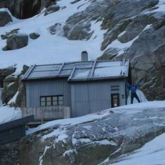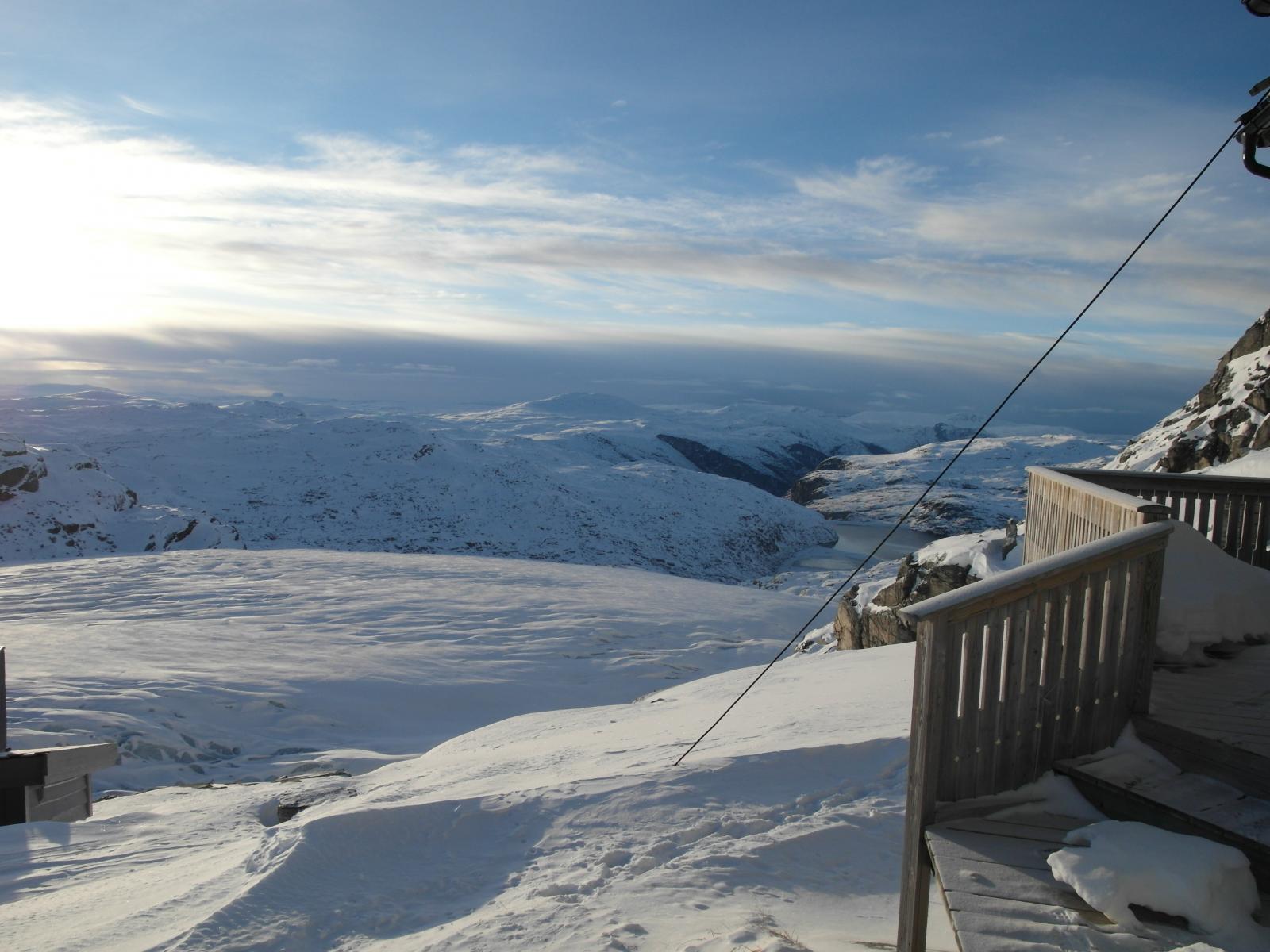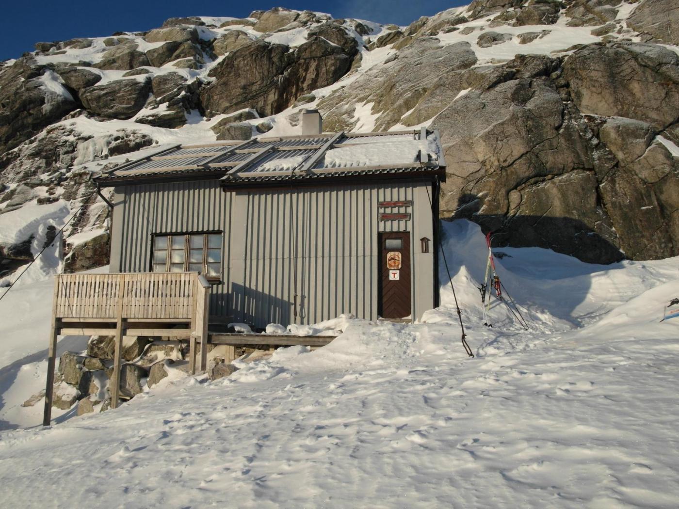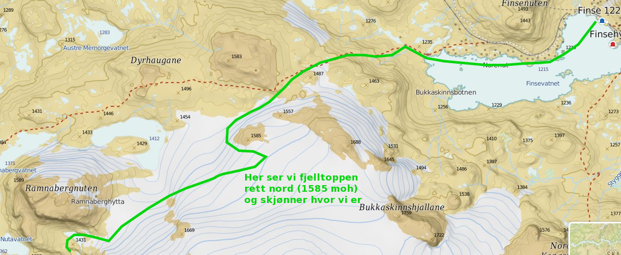 Denne turen gikk for ganske nøyaktig tre år siden, desember 2012. Jeg hadde gått mye på ski i marka, men hadde veldig begrenset erfaring med skiturer på fjellet. Det var jeg og min samboer som hadde planlagt turen, og vi hadde lagt en veldig ambisiøs plan. Slik var planlagt rute: Dag 1: Ankomme Finse stasjon med toget klokka 13:00, deretter gå til Demmevasshytta via vestsiden av Hardangerjøkulen (ca 16 km) Dag 2: Være på Demmevasshytta, evt gå til Rembesdalseter Dag 3 og 4: Her hadde vi ikke noe spikra, men hadde Hallingskeid (ca 20 km fra Demmevasshytta) som et alternativ (og derfra eventuelt gå tilbake til Finse på nordsiden av jernbanen (ca 22 km), eller bare ta toget fra Hallingskeid). Et annet alternativ vi så for oss var å følge ruta til turstien fra Rembesdalseter tilbake til Finse på vestsiden av Ramnabergnuten. Toget vårt gikk fra Finse klokka 14:00 på dag 4. Her er en røff skisse av ruta og muligheter vi så for oss: Ingen av oss hadde fjellski, så vi gikk på vanlige langrennski. Ellers hadde vi med oss én spade, normal vinterutrustning, DNTs turkart over Finse (1:50 000) og mat for de fire dagene. Vi følte oss ganske sikre på kart og kompass, og tenkte at det var store kjennetegn på turen. Vi hadde begge to tursekker, og ingen pulk. Klar til avgang fra Finse dag 1, på vei mot Demmevasshytta Vi startet i nydelig vær, dyp puddersnø og rundt -20 grader. På første halvdel av Finsevatnet gikk det ganske greit, her hadde noen gått med ski og pulk før oss. Men da pulksporet forsvant skjønte vi at det her blir tungt, langrennskiene gikk dypt ned i snøen og sekkene sørget for at balansen var en utfordring. Det ble ganske mye frustrasjon opp bakkene fra Finsevatnet mot kanten av Hardangerjøkulen. Da vi endelig kom opp på breen var det blitt mørkt, og vi begynte å innse at det kommer til å bli veldig vanskelig å nå Demmevasshytta denne kvelden. På kartet vi hadde var det merket av en nødbu som heter Ramneredet på østsiden av Ramnabergnuten, og vi begynte å speide etter denne. Etter vært ble vi helt klare over at Demmevasshytta var det bare å glemme, men vi så heller ingen tegn til Ramneredet selv om vi så hele østsiden av Ramnabergnuten (det var helt mørkt, dog stjerneklart så vi hadde litt sikt). Klokka var nå rundt 20-21, og jeg foreslo forsiktig at vi bør kanskje tenke på å grave oss ned (min svært beskjedne erfaring fra å sove i snuhule var fra første året på VGS, som begynte å bli noen år siden da). Dette var ganske uaktuelt for min samboer, og hun var klar til å finne Ramneredet. Etter en stund til uten noe tegn til Ramneredet og begge begynte å bli ganske utslitte og kalde, gikk hun med på snøhuleforslaget. Så da gravde vi på tur med den ene spaden vi hadde, der den ene gravde snø ut av hula mens den andre skuffa det videre ut med hendene. Etter hvert knakk skaftet på spaden, så vi hadde bare bladet igjen og følte at situasjonen var litt håpløs. Men etter hvert fikk vi en ganske romslig snøhule, og vi fikk til slutt varmet opp Real Turmat og sovnet kjapt i soveposene våre. Jeg vet ikke helt nøyaktig hvor vi gravde oss ned, men et sted på kanten av breen: Da vi våknet dagen etter var det overskyet, og fortsatt veldig kaldt. Planen nå var å komme seg til Demmevasshytta. Fra der vi sov og til Demmevasshytta var det flatt eller nedover (bortsett fra siste kneika opp til hytta), men terrenget var brattere en til nå så det var litt krevende til tider i den dype snøen, men etter litt kaving nådde vi ned til Nedre Demmevatnet. Vi viste at hytta nå var like rundt fjellknausen, men vi skjønte ikke helt hvordan vi skulle komme oss rundt. Alternativ 1 var å gå opp på breen fra vannet, men breen hadde store og dype sprekker, så dette så utrygt ut; Alternativ 2 var å klatre opp fjellsiden sør-vest for vannet og følge høyden rundt til hytta. Vi gikk for alternativ 2, festet skia til sekken og begynte å sparke spor oppover i relativt løs snø. Vi kom ganske langt opp, men det ble brattere og vi anså at snøen ikke var hard nok, og vi ville heller ikke ta risikoen på å falle ned om vi skulle miste balansen med sekk og ski, så vi gikk ned igjen. Det gjensto da et forsøk på alternativ 1, breen. Her gikk vi i sikksakk mellom sprekkene, og etter noen nervepirrende minutter kom vi oss til fjellsiden der vi kunne klyve opp ganske greit og omsider komme frem til hytta. Jeg har seinere lest om andre som har kommet til hytta og beskrevet det som å gå inn i et museum, og akkurat den følelsen fikk vi også når vi gikk inn stua, og utsikten var virkelig fantastisk. Kvelden ble brukt til å tilberede en fiskemiddag vi hadde med oss, og til å bare slappe av. Vi bestemte oss ganske kjapt for å skrinlegge videre skiturer, og heller ta en fridag på Demmevasshytta og samme rute tilbake på siste dagen. Neste dag var det strålende sol igjen (men fortsatt bitkaldt). Vi gikk opp til Luranuten (toppen bak Demmevasshytta), bakte boller (vi kjøpte en 1-2-3 bollepose som lå der, og hytta har gassovn) og nøt av den utrolige utsikten. På kvelden leste vi i heftet som forteller historien om Demmevasshytta, der det blant annet står om katastrofene som oppsto da Rembedalskåka brast (brearmen som man kan se fra hytta, den samme vi gikk på siste biten istedenfor å klatre opp fjellsiden) og historien om de tre skigåerne som døde på vei over Hardangerjøkulen til Demmevasshytta etter å ha kommet i skikkelig uvær. Denne hytta har sjarm og en spennende historie bak seg (den originale Demmevasshytta var en anleggsbrakke for arbeidere som lagde tunell i fjellet som skulle regulere vannstanden i Nedre Demmevatnet, for å forhindre katastrofer der breearmen brast (fenomenet er kalt jøkulhlaup)). Utsikten fra hytta mot Simadalen Utsikt mot Rembedalskåka Hytta. Legg merke til stålvaierne på hver side som er slått over taket. Bollene står til heving Toget gikk fra Finse klokka 14:00 den siste dagen, vi tok 