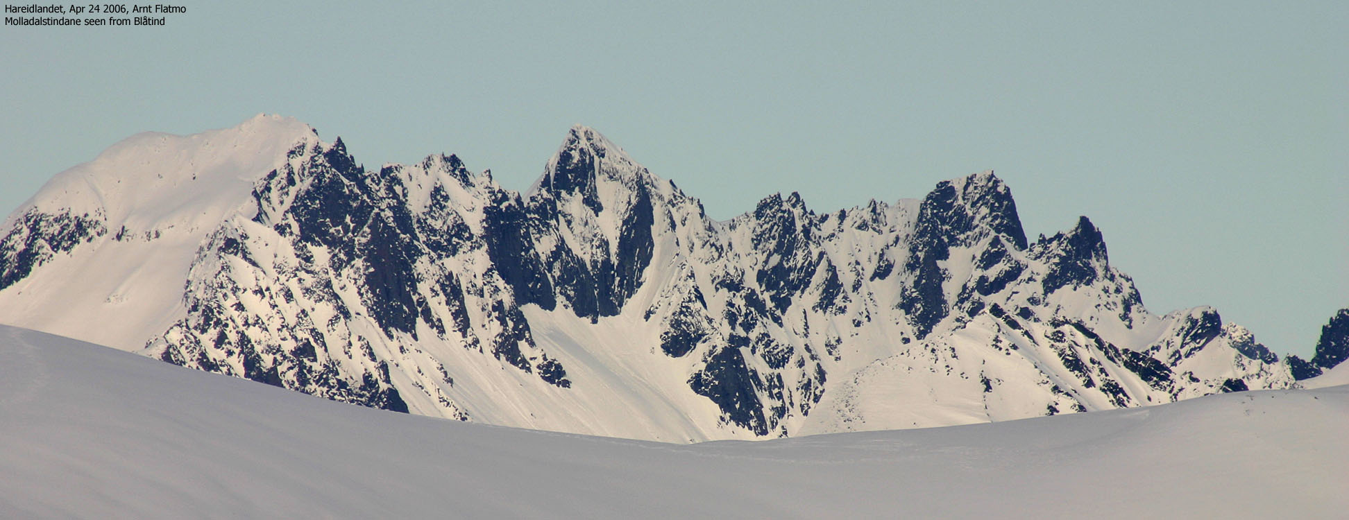 .. koselig liten topp på Hareidlandet hvor boysa med stor motor skremmer vannet av deg på riksveien. Men nå fikk jeg for første gang litt utsikt mot Voldaområdet, og hvis noen har noe interesse av det, kan de klikke inn her; http://impact.ii.uib.no/arnt/Peaks/blaatind.html Molladalstindane og Liadalsnipa er fine fra denne siden.