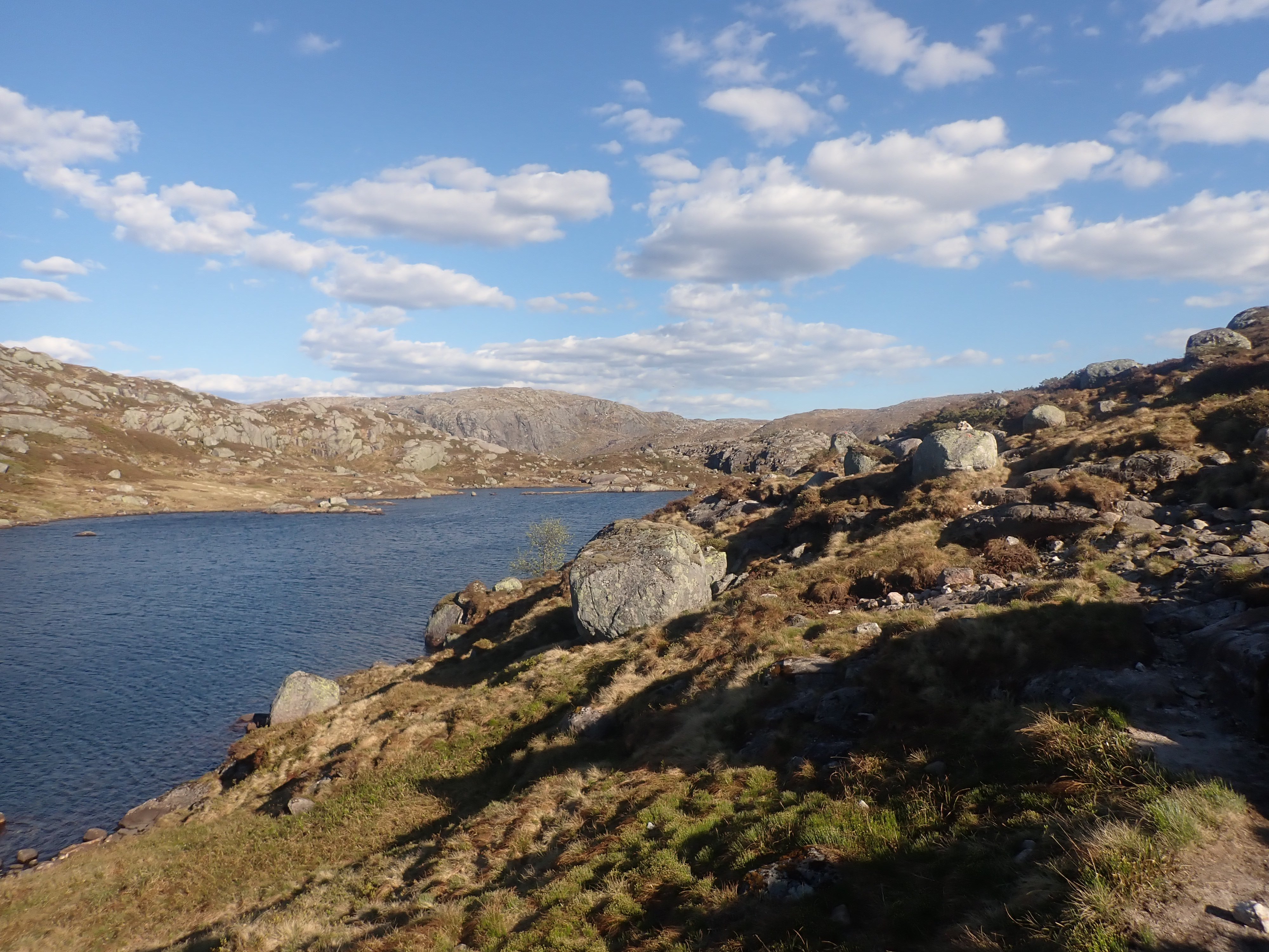 En praktfull dag i heia – tidlig i november. Turen inn til Blåfjellenden hadde vært bedre enn ventet. Regnet både YR og Storm hadde meldt, holdt seg vekke, og det kom bare noen dråper på kvelden. En tør tur i heia i november, er egentlig en bonustur. Det kan lett være frost om det skinner opp, og det er ofte mange dager med regn i november. Jeg var godt fornøyd første dag på tur. Det blir selvsagt tidlig mørkt. Alt i femtiden er det så pass lite lys at hodelykten må på utendørs. I åtte-tiden på morgenen, begynte det å lysne. Så sent på året når ikke sola ned til hyttene ved Høgaleitet ved Blåfjellenden. Hyttene ligger i skyggen av Grønafjellet, og bare en liten stund – enn så lenge – kommer sola inn vinduene i firetiden. Dagen før hadde vært grå og trist. Morgenen kom med blå himmel og rosa skyer i sørøst. Det var fortsatt rundt ti grader nede i dalen, og sola ville gjøre det varmere der vinden ikke fikk tak. Værmeldingen var klar på at det ville bli bra vær med sol deler av dagen. Det var virkelig kjekt å sitte med frokosten å se sollyset krype langsomt nedover fjellsiden. Det så ut til å bli en skikkelig flott dag, og jeg hadde ingen ting som hastet. Jeg fikk noen flotte timer før jeg pakket og jorde meg klar til en tur mot Hunnedalen. En kald vind fra sør gjorde det litt utrivelig over kantene på min vei sørover. Nå er det noen bakker oppover til å begynne med, og selv om det var skygge, så ble jeg svett. Oppe i høyden fikk jeg sola i ansiktet, og måtte ned med skyggen på lua. Heia lå å badet i sol. Det er ikke mye grønt å se. Det meste er vissent og gulbrunt. Sola gjorde at det meste fikk et gyldent skjær. I sola tørket fjellet opp og det ble til og med litt mindre sorpe. Det ble lett å gå. Det var ikke dagen for å haste over heia. Her var det bare å få med seg mest mulig av en skikkelig flott dag. Jeg stoppet opp noen ganger bare for å se utover. Det ble tatt noen bilder, og de skal bli greie å se på over vinteren. Vinden som hadde gjort det litt kaldt over kantene å vei over heia, forsvant nedover mot Hunnedalen. Nedre Fossebekktjødnet lå speilblankt. En fin dag ble enda flottere. Denne dagen var det spor i sorpa, Andre enn meg var på tur – eller jakt. Jeg hadde ventet å treffe folk som ville inn til hytta for å overnatte. Først nede ved Fossebekken kom det to i mot. De ville innover for en natt, og håpet at været dagen etter ville bli like bra. Litt senere kom to karer og tre hunder i mot. Det var sauefolk som ville inn til Blåfjellenden (gården og ikke STF-hytta) for å lete etter sauer. De manglet fortsatt noen få stykker. Det er ikke alltid ettersankingen går i så flott vær som denne dagen. Nede i Hunnedalen var det helt greit å skifte fra svettevåte klær til tørre. Selv om bilen sto i skyggen – sola når ikke ned her heller, så var det fortsatt 8-9 grader.