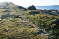 15. Det var ikke mulig å ta en tur i heia på lørdag. Været var det aller beste, men noe hvitt hadde lagt seg over landet, og gradestokken hadde blå lepper og fått på seg et skjerf av snø. Det ble en tur langs sjøen - tilsammen over tre timer, og med litt såre fotblad på slutten. Det blir ofte det om det er frost i bakken. På turen går jeg på restene av en gammel vei mellom Hå og Varhaug. Stor deler av veien er selvsagt ødelagt av fremskrittet, men spesielt opp Kommedelen er det tydelige rester av den gamle hulvei. Jeg lurte på om det finnes mange slike igjen ut over i landet?