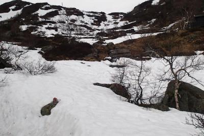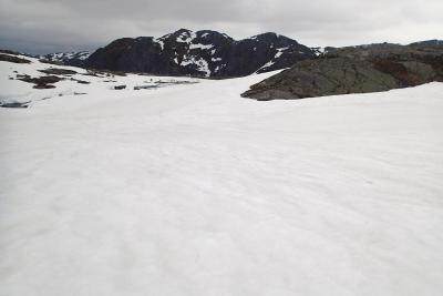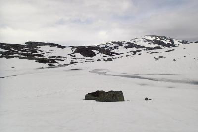 Oppdatering på forholdene i heia. Lørdag 17, mai. At snøkartet ikke var riktig viste jeg, men at det tok feil så til de grader var greit å finne ut av. Det er ikke sommerføre, det er skiføre. Bare 50-60 meter høyere enn Høgaleitet i Hunnedalen (600moh) var det snø. Og i masser. Fra litt oppe i Oleskaret måtte trugene på, og de tok jeg ikke av før helt nede ved slettene ved Blåfjellenden. Det hadde gått folk innover – på beina, etter sporene å dømme, men det virket også som om noen av skisporene heller ikke var eldre enn en uke. Jeg hadde håpet at det minket på snøen, men oppe i høyden er det fortsatt snødekke, og enkelte fenner er mer en 5 meter dype. Det vil ta tid før all snøen er vekk, men om værmeldingen slår til vil mye være smeltet til neste helg. Det var mer enn 90% snødekke, det var enkelte strekk hvor det hadde vært mulig å gå på beina, men aldri lenger enn et par hundre meter. Enkelte plasser gikk jeg på fenner, og rett over småvann. Det var bare det at vannet ikke viste i det hele tatt. På vei inn til Blåfjellenden passeres to – tre bekker. Fossebekken som den største. Alle disse ble passert på snøbruer. Det er litt sånn passe morsomt og gå over ei elv, og høre den fosse under. Det blir litt Peter Pan – kun lette tanker…- 11 svar