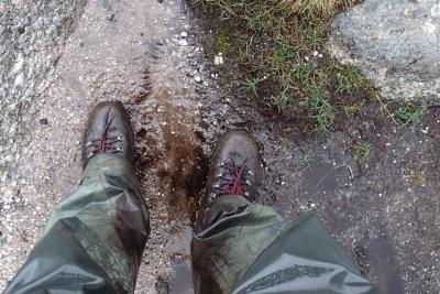 Etter fire timer i bilen var vi ved startstedet for helgeturen, og skulle ta på fjellskoene..... Eh... Hvor var de? Redningen ble et par gummistøvler jeg hadde glemt i bilen etter en båttur.