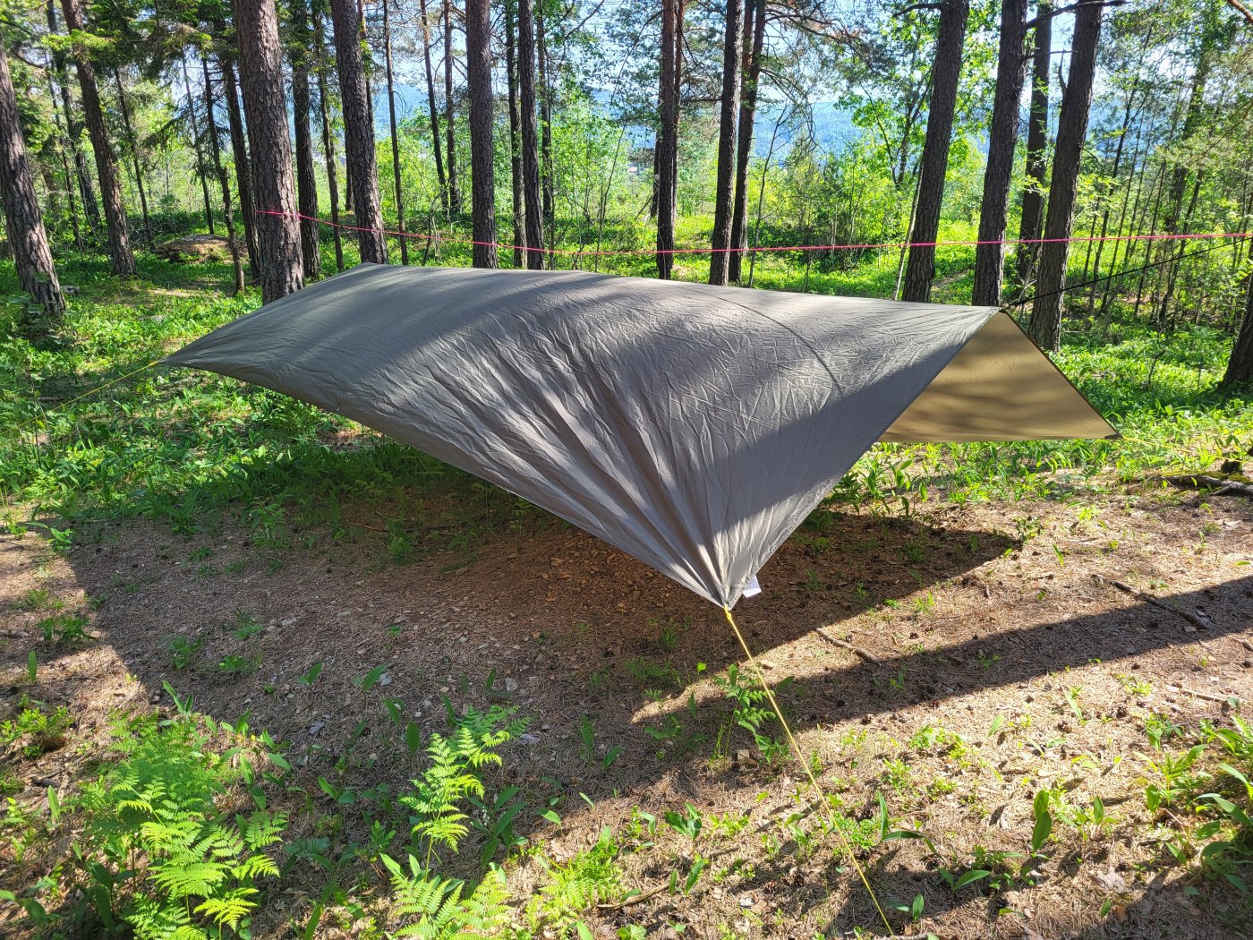 Mangla litt på gratis frakt, og tarpen var på tilbud. Hvorfor ikke teste en som ikke er firkanta. Ble jo riktig så billig. Den er ikke så fleksibel med tanke på oppsett, og asymmetrien gjør at du må huske hvilken side som er kort/lang 😑, men funker helt greit. Firkantet med mange fester er mer fleksibelt til å lage ly til lunc når du ser styrtregnet komme inn over nærmeste topp.
