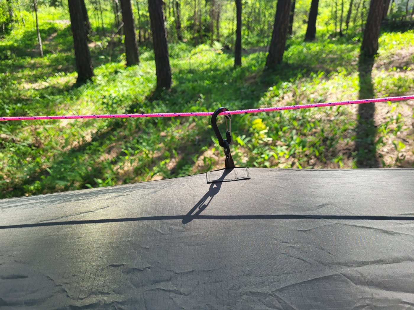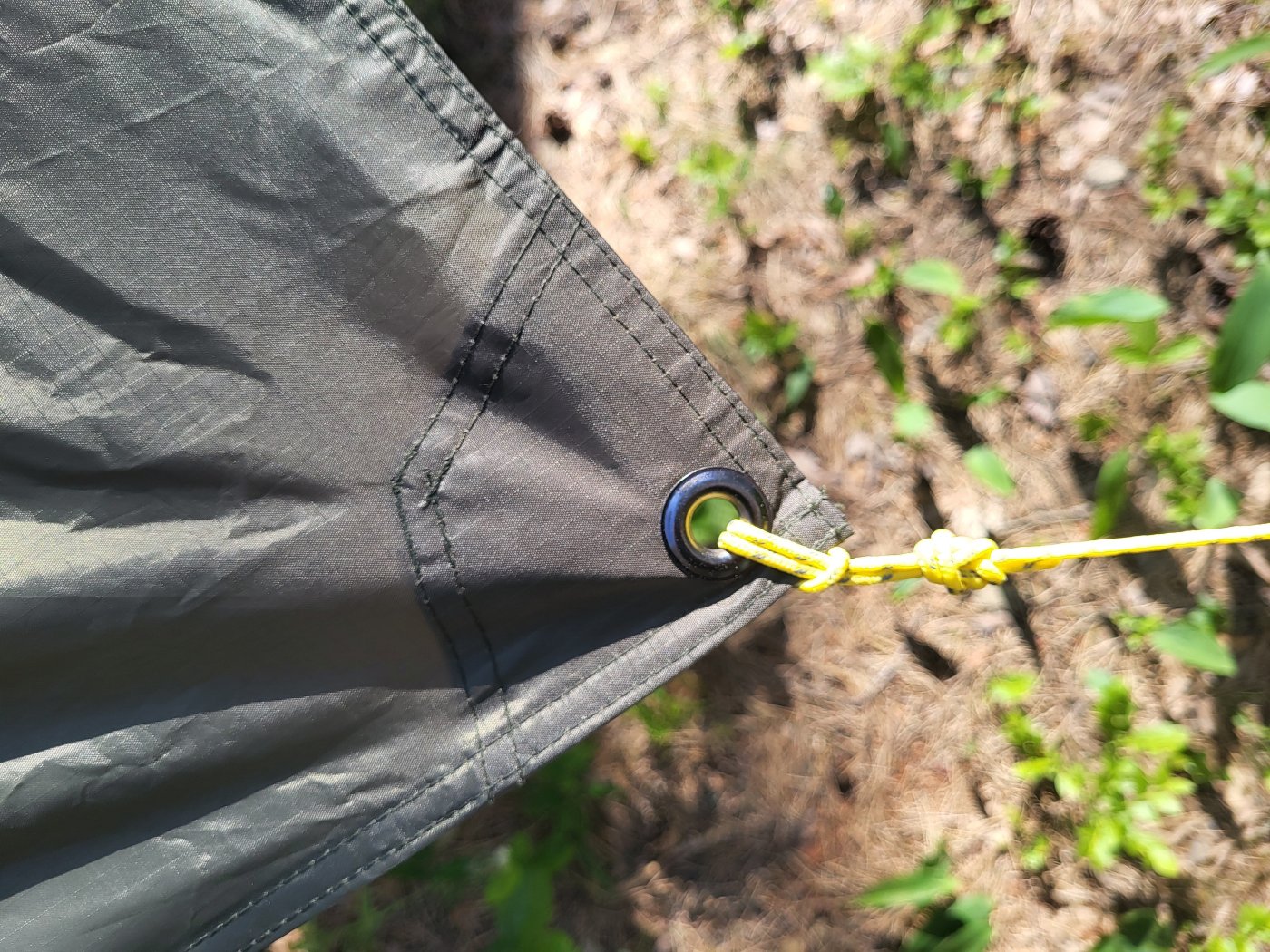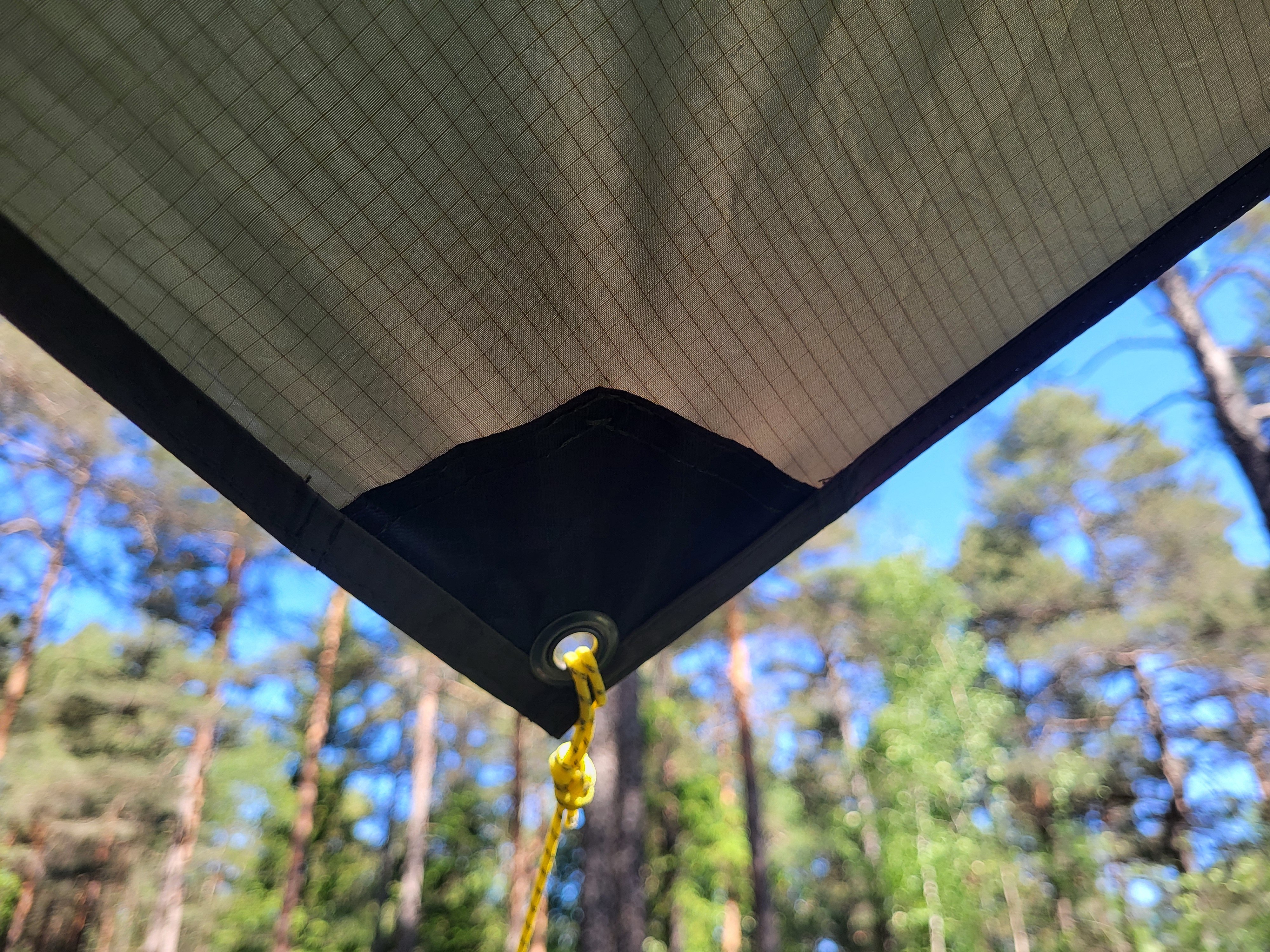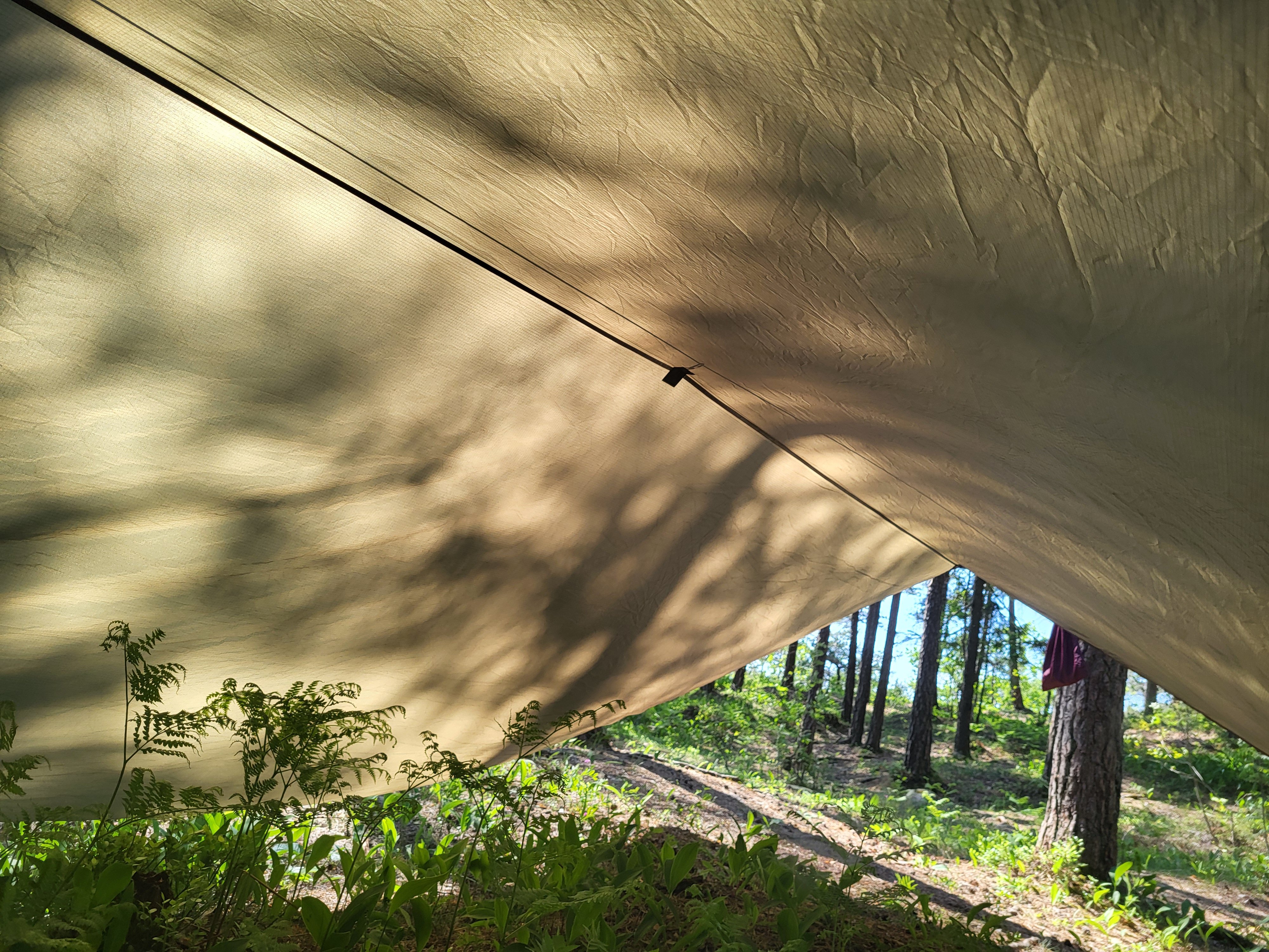 Her satt opp med mønesnor og klemknuter av strikk. Rotert 90 grader på lengeretning for anledningen. Har primært brukt denne som ly for regnskurer på dagstur med barna. Konstruksjon: Bardunfester på hjørner og sider. To like lange sider med tilsynelatende katenærkurver mellom bardunfestene. To sider av ulik lengde hvor midtfestet stikker litt lenger ut. Oppsett: Noe merkelige dimensjoner da det virker som det er meningen at mønesnora skal følge kortsidene. Den er rotert 90 grader på dette i bildet. Dette fungerer og fint. Hvis et festepunkt ikke strammes opp vil det henge og flagre, så alle 8 festepunktene må strammes opp. Størrelse: 240cm kortsider med langsider 360cm front og 314cm bak. Noe asymmetrisk med andre ord. Materiale: 210T ripstop polyester/PU, 70D. Kjennes tykt og robust ut. Vekt: 892g med fastsydd pakkpose og medfølgende barduner. Barduner og fester: 8 barduner og forsterkede fester med løkler, maljer og oppsamlerlommer. Løkkene et påsydd med 2 små sømmer og en kraftig søm på tverrs av lastretningen. Løkkene kunne med fordel vært litt større for lettete å bruke plugger. Bardunene og strammere er helt greie. Sømmen til forsterkningen av bardunfestet på ene hjørnet er noe slitt etter bare litt kåling i hagen og et par dagsturer Ikke avbildet, men det er faktisk mulig å bare stappe den ned i den påsydde pakkposen. De medfølgende posene er ofte ubrukelige. Denne er akkurat innafor.