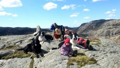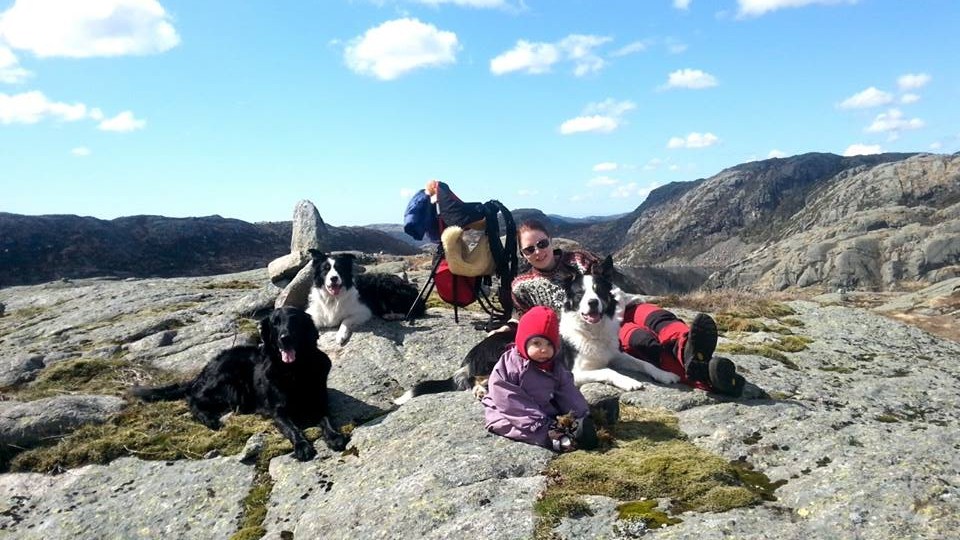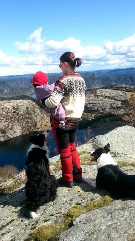 01-02 Mai Det er rart og tenke på kontrastene. For omlag 10 år siden var det aller viktigste og komme seg på en fest på denne datoen, nå er det viktigste og ha gode opplevelser i naturen,skape gode minner,trygghet og glede til friluftlivet for vår lille snuppe som nå runder 10 mnd om få dager. Man kan trygt si at hun har fått inn friluftlivet med morsmelken! 01 Mai betyr altså langhelg og denne skulle utnyttes til det maksimale! Vi var klare for Aurora sin aller første overnatting til fjells. Klokka 13 på Fredag var alt pakket: Kløver til bikjene,ryggsekk og bæremeis. Lillemor har sittet svært lite i bæremeis og dette ble hennes første skikkelige tur. Vi hadde med bæresjal for sikkerhets skyld, i nødsfall om sjefen bestemte seg for at meis ikke var helt tingen. Vi trillet ut av tunet her rett før kl 1330, og med bare knappe 10 minutter i bil frem til utganspunktet for turen var vi alle MER enn klare. Bikjene vet at dette betyr mye morro, så de skalv av iver da vi åpnet luka, fant frem kløvene og ba de vente i tur og orden. Aurora ble plassert på saueskinn i bæremeisen, da kom hun litt høyere og jeg følte hun satt bedre og mykere. Hun hadde også med seg "kosen" sin som trygghet. Da alt var klart og vi skulle til å gå,begynte det å dryppe urovekkende fort fra himmelen. Pøsregnet var fort ett faktum. Vi hadde ingen regntrekk til bæremeisen, og det var ikke akkurat noe alternativ og la snuppa bli klissbløt på sin første fjelltur i meis! Heldigvis gjelder det og tenke litt ut av boksen, jeg kom nemlig på at regntrekket til vogna lå i bilen. På med regntrekket,og dette var jo helt perfekt. Dekket føtter,kropp og over hodet, samtidig som annsiktet var fri og hun kunne se rundt seg. Smilet var påplass hos oss alle, og vi kunne for alvor starte på veien opp i fjellet! Det tok ca 1,5 time opp, i rellativt god stigning hele veien. Jeg er usikker på hvor mange høydemeter denne turen bærer oss, men med jevn og forholdsvis god stgning i 1,5 time så vil jeg tro det blir litt,uten at vi på noen måte er over tregrensen. Tror GPSen skal medbringes for å se hvor høyt vi er neste gang vi skal opp. Vår bekymring om at snuppa ikke skulle like bæremeisen viste seg og være en bekymring for mye. Hun satt og snakket og lo hele veien, ikke så mye som en eneste episode med sutring og missnøye. Vi hadde utstyrt oss med "maispopps" også for å være sikre, sånn om det ble aktuelt med bestikkelser for å komme oss frem. Dette ble heller ikke nødvendig. Var nok kjekt å sitte i høyden og studerer trær,bikjer,pappaen sin, mitt hode og ellers alt som kunne krype og gå! Da vi kom opp var det bare å få på snuppa redningsvesten, vi må ro en liten bit over ett vann for å komme frem til Stølen, plassen vi skulle være, i foten av "pappegøyefjellet"! En litt eldre robåt ligger klar, så et var bare å få årene påplass,utstyr og bikjer med, og sette igang. Aurora syns vannet var dypt fasinerende, og brukte de 10-15 minuttene det tok over på å nøye studere all bevegelse årene ga. Vel over kjente vi nok begge en glede over å være fremme og at alt hadde gått bra, og ikke minst gleden av å være tilbake her! Det er over 1 år siden sist, og jeg var "ganske" gravid ved vår siste tur opp. Plassen eies av nære venner av min mann sin familie, og vi er så heldige og få benytte denne plassen så mye vi måtte ønske. Det er i utgangspunktet en gammel støl, hvor gjetere søkte ly for vær og vind. Denne er nå bygget opp igjen, etter gamle mål og de har forsøkt å beholde alt slik det var for så mange år siden. Det og stoppe opp, se på byggene og tenke seg til hvordan det var her for 100 år siden, det er en merkelig,rørende og spesiell følelse. Vi fikk bært alt utstyr inn, bikjene fikk litt mat for energipåfyll og lillemor sa klart ifra om at NÅ var det tid for mat! Vi voksene skulle ha taco (det var jo trosalt Fredag!) men lillemor var ikke helt interessert i og vente på å få stekt kjøttdeig, så hennes reddning ble 2 grove skiver med noe så enkelt som smør. Hun slukte det med stor iver, og tenkte nok ikke så mye over herremåltidet hun gikk glipp av i form av Fredagstaco. Hun var generøs med delingen, så litt skive ble det på meg også. hehe. Etter maten hadde hun full oppdagelsesferd inne på stølen, mens jeg og mannen lagde ferdig Taco. Etter vi hadde spist var lillesnupp stuptrøtt etter alle intrykkene, og sovnet på saueskinnet sitt i jervehiet på gulvet. Hun sov som en stein resten av kvelden og natten, kun avbrutt av en stor flaske med melk, før hun sov videre! Jeg og mannen benyttet stillheten til og spille kort og drikke kaffe. Herlig, rett og slett! Etterhvert ble det også tid for oss å finne søvnen, og det tok ikke mange minuttene før også vi var i drømmeland. Vi våknet til en gang iløpetav natten. Temperaturen hadde blitt -3 grader og vi måtte pakke på lillemor ett ekstra ullteppe for sikkerhets skyld, samt krype ned i soveposene selv også, kontra ullteppene vi hadde hatt over oss da vi sovnet. Etter dette sov vi alle 3 videre til 0830! Uthvilte og våkene kunne vi konstantere at det ikke var en sky på himmelen! Det var sol, strålende vær og vindstille! Det og nyte frokosten til denne utsikten er ikke feil: Etter frokost ble det tid for å ta ut hundene. De hadde sovet i vedboden og antagelig hatt en god natt de også, det hadde allefall ikke vært lyd i dem. Da vi kom ut var det dette som møtte oss: Bikjene fikk i seg frokost de også, og vi koste oss ute i solen før vi bestemte oss for å gå opp på "pappegøyefjellet". Det tar ca 30 min opp fra Stølen og gir utsikt over store deler av Lund Kommune i rogaland, og mot vest agder. Vi satt snuppa i bæremeisen og nok en gang var hun i storform. En smoothie før vi gikk opp var nok med på å gjøre henne i godt humør:) På vei opp var det både spor av hvitveis og andre blomster som kunne fortelle at nå er et faktisk vår for fullt! Vi kom oss til t