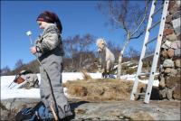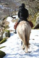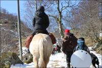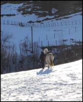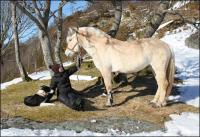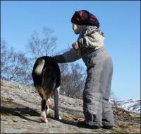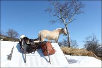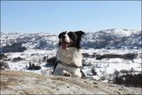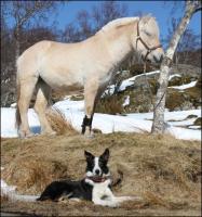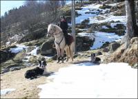 Søndag 30 Mars var vi klare for tur! Sekker,kløver og salveske sto klare i gangen, og da hundene våknet til liv utpå morgenkvisten og innså tingenes tilstand, var det ikke mange minuttene før vi også våknet. Hundene vet hva pakket kløv og sekker betyr, så de holdt jubelorkester i gangen kl 06.00 Søndag morgen Noen timr,kaffekopper og litt frokost senere, var det 3 utolmodige og overlykkelige hunder som satt i bilen klare for tur. Jeg og samboer hadde heldigvis våknet litt vi også Vi hadde avtalt å møte ett vennepar og dems 2 barn, så litt senere var vi på vei til fjells! Min hest ( 3 år gammel fjordings hoppe) står på fjellet, dermed ble det veldig logisk å legge turen ut fra stallen. En halvtime senere var vi fremme, ungene var nermest like lykkelige som bikjene, og de sprang,hoppet og sang nermest i kor! Min hest (og resten av flokken på utegangen) er roen selv,og gidder ikke løfte ett øre engang tiltross for hunder og barn som leker på andre siden av gjerdet. En god halvtime senere var Eira (hesten) klar for tur! Dette ble hennes aller første fjelltur med salveske, og den 10ende gangen jeg sitter i salen. Saltasken har hun trent med både tom,og med avispapir/lett vekt, så jeg viste hun var trygg på dette. Hundene har vært med på leieturer osv fra vi fikk henne for 1 år siden, så jeg viste hun var trygg på situasjonene rundt. Alikevel veldig spennende med en slik flokk på tur, bestående av: 1 Fjording på 3 år. 3 hunder på 7,4 og 2 år 2 barn på 7 og 5 år 4 voksene i alderen 25-33 år. Litt av en flokk å møte over fjellet skal jeg si dere! Turen startet opp ett bratt parti, jeg valgte å leie hesten slik at hun skulle få plassere seg så godt som mulig, uten hindring fra meg i salen. Bikjene vekslet på å leke,løpe, og utforske. Ungene forsøkte vekselsvis på å starte opp med akingen, men måtte fint innfinne seg med å vente LITT til. Vi voksene gjore det vi kunne for å ha en hvis kontroll på hele galskapen. haha Etterhvert kom vi inn på en ganske fin sti, da var det på tide å sette seg i salen og la hesten jobbe den lille halvtimen opp til varden med sitteplasser og bålplass! Det hele gikk langt over all forventning. Eira (hesten) arbeidetmed friskt mot, gikk i snø til langt over knærne ettpar plasser, stoppet når en av hundene kom kravlende forbi i dypsnø,og brydde seg ikke om den eldste ungen med akebrettet festet til sekken,som hoppet,spratt og sang rett ved henne. Hundene var også like greie som alltid, flinke å komme "påplass" tiltross at jeg satt på hesten, og dekket/kom på innkalling ved minste vink. Eira tok mine kommanderinger av hundene med stor ro, og passet stadig på hvor hun satte føttene for ikke åkomme nær hundene. Ungene fant stadig spor etter påskeharen, og vi fant fort ut at påskeharen hadde gått AKKURAT til samme plassen som vi var på vei. Det var en gjeng fornøyde barn,voksene,hunder og hest som ankom varden på toppen av fjellet! Nå var det bare å sale av hesten, få fyr i bålet, ta kløven av hundene og kose oss mens vi nøt utsikten og grillmat, til strålende påskesol! Vi lagde til en genial akebakke også, og tiltross for at denne var bare noen meter fra Eira,så sto hun like fint å spiste litt på røtter/gress og stubber. Dagen ble virkelig en minnerik opplevelse, med aking, grilling, hest,hunder og fornøyde små og store på 2 bein. Vi ble værende hele dagen,og var en sliten og fornøyd gjeng som kom hjem langt på kveld! Her er noen bilder fra turen: hele gjengen (nesten) på vei oppover! Meg og samboer. Både store og små koste seg med akingen