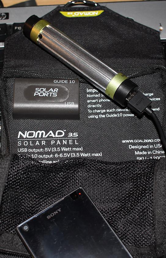 Har hatt denne i et par år http://www.goalzero.com/p/195/goal-zero-switch-8-nomad-3-5-kit Dette er det minste kitet til Goal Zero, veier 318 gram. Effekten på panelet er 3,5W. Har fungert greit som strømreserve på mine turer. Fungerer på telefon og på kamera (Sony RX100) Fordel med lav vekt og liten størrelse, men effekten på panelet er ganske lav. Driver å tester pwerbanken nå med lading av Xperia Z5C. Har ladet telefon fra 10% til 37% på 1 time, og da er powerbanken ned til 50% -