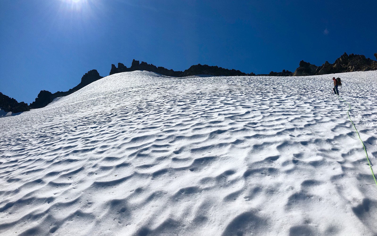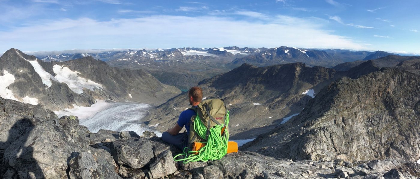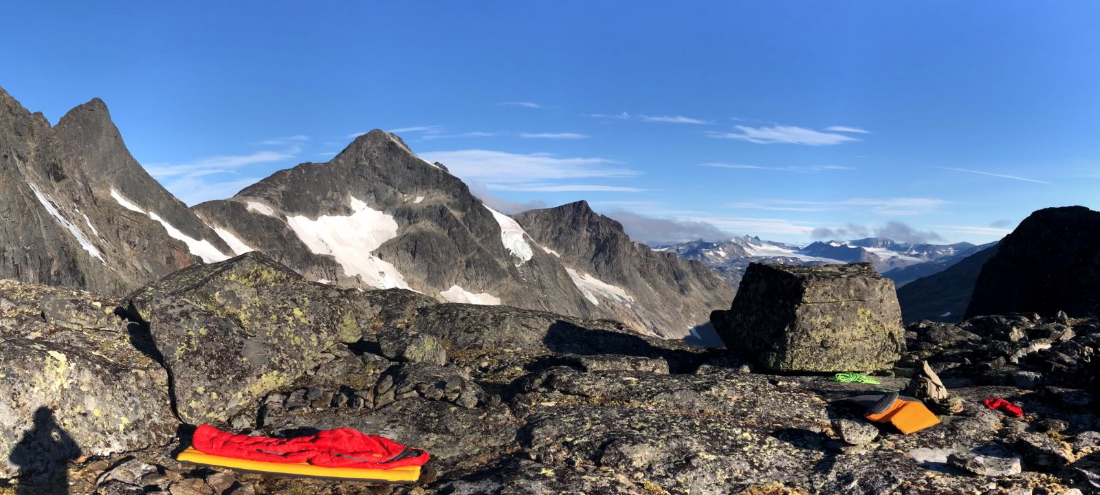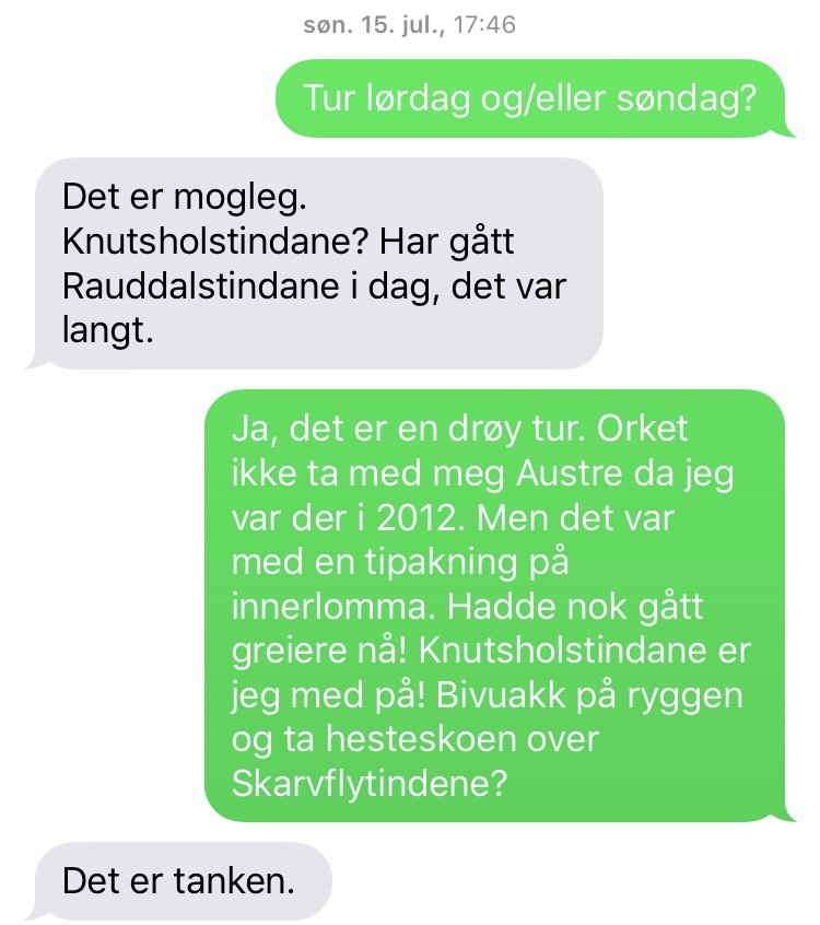 Forfatterens anmerkning Det umake paret Eggen og Omgåelsen befinner seg nå halvveis rundt en hesteskoformet fjellrygg i den sørøstre delen av Jotunheimen, bedre kjent som Gjendealpene. Hvis du lurer på hvordan de kom seg dit, kan del 1 av reiseskildringen leses her. Vi vender tilbake til skaret mellom Vestre og Austre Leirungstinden i det Omgåelsen blir vekket av sin venn etter en natt med varierende søvnkvalitet… Akt 2: Omgåelsen dro lua vekk fra øynene, kikket opp og så Eggens ansikt over seg omkranset av noe stort og blått. Han konkluderte i løpet av ganske få sekunder med at det var himmelen. Det neste han la merke til var glimtet i Eggens øyne. Det var tydelig at det ikke var snakk om noen pinlig retrett ut Leirungsdalen lenger. «Du har vært oppe en stund?», halvt spurte, halvt bekreftet Omgåelsen. Eggen nikket. «Jeg har funnet litt smeltevann ned mot breen». Omgåelsen var glad han ikke hadde kommet seg nærmere vertikal posisjon enn opp på siden, hvilende på albuen sin. Hvis han spilte kortene sine rett nå var det logisk at det var Eggen som skulle ned å fylle flaskene. Han strakk på seg og gjespet. La seg litt ned på ryggen igjen. Gned søvnen ut av øynene. Eggen gjorde ingen mine til å forflytte seg noe sted. «Hvis du stikker ned og fyller vann, så kan jeg koke kaffe med det som er igjen på flasken din fra i går?», kjøpslo Omgåelsen. Han var ganske desperat etter vann, men det var viktig å ikke gi uttrykk for det. Det ble et øyeblikk utkjempet en stille kamp mellom kaffetørsten til Eggen og den mer alminnelige vanntørsten til Omgåelsen, men kaffetørsten led snart et smertefullt nederlag. Omgåelsen hjalp til med å samle sammen flaskene og finne en pakkpose å bære dem i. Eggen forsvant, og Omgåelsen kunne sette seg rolig ned på en stein i den livgivende morgensolen og fokusere på den knallharde oppgaven det er å sørge for at vann koker riktig. Eggen kom ganske kjapt tilbake, og frokosten bestående av noen skiver og et par kopper kaffe ble inntatt i relativ fordragelighet. Eggen var nå fast bestemt på å rekke siste båten ut fra Gjendebu. Omgåelsen regnet kjapt på tidsbruken i hodet. Dette kom definitivt ikke til å bli noen kosetur. Men samtidig kjentes det trygt og godt. Det var sånn det skulle være på tur med Eggen. Du skal helst ha gangsperre og redusert psyke noen dager i etterkant. De pakket kjapt sammen etter frokosten og cirka kvart over åtte var de klare for avmarsj, Eggen selvsagt litt før sin noe mer makelig anlagte venn. Omgåelsen var, klok av skade, fast bestemt på å ta mer aktiv styring over rutevalget denne dagen. Som pedagog ved en barneskole visste han at det var viktig å forberede det nokså ensporede individet han hadde foran seg grundig, samt at det kunne være lurt å benytte seg av flere ulike innfallsmetoder for å trenge gjennom med budskapet. «Det ser ut som det er lurt å ta litt til høyre under den skrenten der oppe og så runde opp mot eggen igjen i en bue», sa han. Eggen stirret litt uinteressert opp mot toppen av Vestre Leirungstinden. Omgåelsen gikk til plan B og trakk frem mobilen. «Se her – jeg har tatt et bilde av kartet fra Norges fjelltopper over 2000 meter, det ser ut som det er den anbefalte ruta». «Det ser nå veldig fint ut rett opp her, da», svarte Eggen uanfektet og begynte å gå. Omgåelsen erklærte raskt Eggen for et håpløst spesialpedagogisk tilfelle og bestemte seg for å gi opp videre forsøk på omvending. I begynnelsen virket det allikevel som om Eggen hadde valgt å ta hensyn til Omgåelsens ønsker. I alle fall skrådde de på høyre oppunder skrenten. Men det gikk ikke mange minuttene før Eggen ikke klarte å styre seg lenger og simpelthen bare måtte tafse litt på det bratte berget. Her valgte Omgåelsen å trekke seg stille unna og inn i en grusrenne. Når de to vennene var ute av syne for hverandre, skrudde han opp tempoet betraktelig. Hvis Eggen ikke forsto at omgåelser hadde verdi i form av at de var teknisk enklere, måtte han i alle fall sette pris på dem om de var raskere. De hadde tross alt dårlig tid! Grusrenna ble fulgt på skrå oppover mot høyre, før en annen renne ledet ham opp igjen mot venstre til der det bratteste partiet flatet ut. Nå var det bare en kort spasertur opp langs ryggen til toppen. Han snudde seg og kikket bakover akkurat i det Eggen bikket over kanten på bratta. Omgåelsen hadde et knapt forsprang og ingen tid å miste. Han langet ut mot toppen av Vestre Leirungstind – fast bestemt på å holde turkameraten bak seg, noe han også klarte. Nå var dagens lengste motbakke unnagjort, og de hadde ikke brukt mer enn 40 minutter til toppen. Dette kunne gå! På toppen virket det som om Eggen gikk inn i en (så godt det lar seg gjøre for en sindig gudbrandsdøl) nærmest sakral sinnsstemning over omgivelsenes velde. Han satte seg ned og foreslo noe overraskende at han skulle ta et panoramabilde over fjellrekken med Omgåelsen i sentrum. Eggen har mange gode kvaliteter, men smidig omgang med nyere teknologi er dessverre ikke en av dem. Etter tre mislykkede forsøk ga Omgåelsen opp å lære Eggen panorama-funksjonen på mobilkameraet og tok grep selv. Det er en grunn til at forholdet mellom bilder av de to vennene på deres felles turer er 10:1 i favør Eggen. Omgåelsen var glad for å finne ut at de bratte nord-vendte svaene ned fra Vestre Leirungstind var snøfrie og tørre. Eggen danset lett og ledig nedover, men det var helt greit for Omgåelsen på dette tidspunktet. Han koste seg på tur nå, og virkelig nøt den enkle klyvingen over enda en av turens mange tulletopper. På den særdeles lettgåtte flata frem mot Skarvflyløyfttinden tok han sågar igjen Eggen, og de gikk sammen i kontrollert tempo opp mot denne. Livet var så herlig som det bare kan være i øyeblikkene før problemene oppstår. Livet er rart sånn. De kom seg greit ned og opp på Søre Skarvflytinden. Eggen ledet an rett på alle vanskelighet