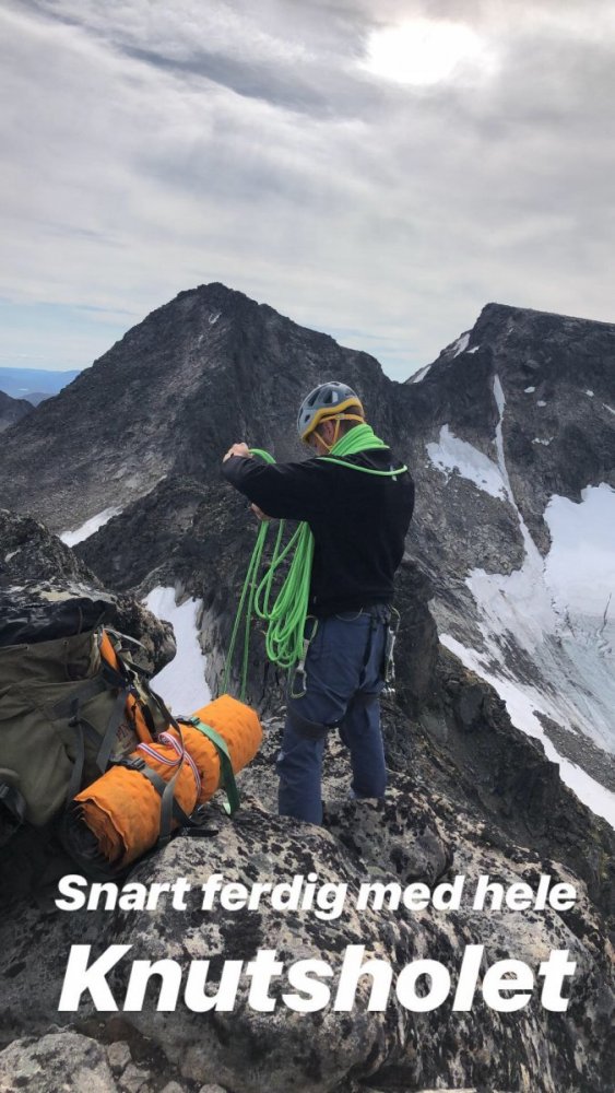 Forord Det har nå gått noen dager siden turen ble gjennomført, og jeg har fått mulighet til å bearbeide den og legge den noenlunde bak meg. Jeg vil derfor forsøke, med så stor grad av nøyaktighet som mulig (samt en selvutleverende sannferdighet på grensen til det Knausgaardesque) å beskrive de drøyt 30 timene jeg hadde på tur rundt Knutsholet. Når det er sagt kan jeg ikke garantere at enkelte situasjoner kan være over- eller underdrevet i denne fremstillingen, da jeg under store deler av turen var enten A) sliten, B ) dypt konsentrert eller C) redd. Mangelen på mentalt overskudd er også grunnen til at det ble tatt sjokkerende få bilder under denne langturen. Men før jeg går over til reiseskildringen må selvsagt persongalleriet presenteres. Jeg har valgt å anonymisere disse, men for den oppvakte leser bør det være åpenbart at en av dem er meg. Eggen er en mann som konstant er i sin beste alder, men som for tiden kanskje kondisjonsmessig er et stykke bak der vedkommende var i glansdagene, i størst grad grunnet forpliktelser på hjemmebane (fire av dem, for å være helt eksakt). Dette blir dog oppveid av godt over gjennomsnittlige klatreferdigheter og god psyke i fjellet (herunder evnen til å lide). Det går som regel litt tid mellom hver gang Eggen er på tur med den andre hovedrolleinnehaveren i denne to-akteren, men når de først befinner seg sammen i Guds frie natur er det ofte store porsjoner smerte og som regel også en del frykt involvert (sistnevnte kanskje mest for én av dem). Eggen lar seg i liten grad lokke ut på tur for å bestige en obskur krumning på jordflaten i en eller annen gudsforlatt del av landet – nei, han sparer turdagene sine til turer som virkelig betyr noe – det bør helst være langt, hardt og bratt. Eggen går på tur under mottoet «light and fast» og selv om det noen ganger kan virke som om sekken hans er vel «light» har det i skrivende stund fremdeles ikke gått galt. Bakgrunnen for navnet han er gitt i denne fortellingen er hans hang til å alltid gå rett på vanskelighetene. Omgåelsen er også en mann i sin beste alder, og denne alderen ser faktisk ut til å bli bedre og bedre for hvert år som går. Man kan kanskje si at han er i sitt livs form. Omgåelsens sekk er som regel velfylt (men ikke for tung). Hederlige unntak er den gangen han glemte solbrillene sine på en april-bestigning av Holåtindene (med noe varig svekket mørkesyn som utfall) og da han ikke fant vindvottene sine når han dro på Hesthøe i 20 blå (med fingre som begynner å valne så snart sola går ned som resultat). Uansett: han har lært, og stiller alltid beredt. Dette gjelder også research til rutevalg. Omgåelsen leter alltid etter enkleste vei og trives godt i løse grufsrenner (fortinnsvis når han får gå først opp/sist ned). Det er relativt enkelt å se når Omgåelsen ikke trives på tur. Da kan han for eksempel si ting som «Dette liker jeg faen meg ikke!», «Hæ?!? Hvordan kom du deg dit?» eller rett og slett bare «Nei, nå må du hjelpe meg for helvete!». Men Omgåelsen har også innsett at eksponeringsterapi må til, at denne typen aktivitet er viktig for å føle seg trygg i fjellet og at man alltid lærer mest når man går litt utenfor sin egen komfortsone. Og når rollelisten nå er besatt kan jeg begi meg i kast med reiseskildringen! Prolog Akt 1 Så enkelt starter som regel turene til Eggen og Omgåelsen. Og la meg med en gang bare si at jeg har valgt å hoppe over den videre enveiskommunikasjonen per SMS der Omgåelsen har tusen spørsmål og forslag til rutevalg og alt utstyr som må med og blir avspist med en halv setning i retur. Sånn er det bare – tur blir det uansett. Og derfor hadde det seg slik at Eggen og Omgåelsen – etter felles bil- og båttur befant seg i fint, men rolig driv oppover bakkene fra Gjendebu inn i Svartdalen. Ved avmarsj hadde de selvsagt gjennomgått det faste tur-ritualet som innebærer å kjenne på vekten av hverandres sekker, og Eggen måtte motvillig innrømme at Omgåelsens sekk (med tau, Jetboil, gass, kaffe, GPS og litt førstehjelpsutstyr) var markant tyngre enn Eggens. Allikevel følte Omgåelsen at han hadde gode ben oppover lia. Og dessuten hadde han noe enda viktigere: muligheten til å nevne det faktum at sekken hans var tyngre for Eggen resten av turen. Noe han også gjorde. Et stykke forbi bratta valgte de å krysse elven og tråkke seg oppover mot 1590-vannet. Her passerte de noen dansker i telt som selvsagt ble meget imponert over fjeld-apernes vidløftige turplaner. Omgåelsen vurderte en stund å fortelle om sin ekspedisjon til Danmarks høyeste fjell (Møllehøj), men fant ut at sånt kanskje ville oppfattes som nedlatende. Ved 1590-vannet (eller i realiteten et lite stykke overfor) fylte de flaskene sine og spiste et par skiver. Eggen (som på mystisk vis alltid er ferdig med pausene sine først) tuslet utålmodig oppover mot breen. Her gjeldt det for Omgåelsen å tråkke til for å holde følge. Det er nemlig viktig å ikke vise svakhet i de innledende fasene av en slik ekskursjon. Sånt kan nemlig trekkes frem i etterkant av turen. Svakhet burde erfaringsmessig i størst mulig grad spares til slutten av turen, da motparten forhåpentligvis selv er så sliten at han ikke registrerer den. Noen forferdelige morenepartier måtte forseres før de kom opp til breen. Her var det (selvsagt, etter sommerens hetebølge) stort sett blåis, kun oppe i kanten mot Knutseggen var det snø. «Du tok med deg stegjern, ikke sant?», spurte Omgåelsen. Han hadde antatt det da han så isøksen på utsiden av Eggens sekk. «Nei», svarte Eggen stoisk. «Du kan få låne et av mine, da», prøvde Omgåelsen seg – men ble umiddelbart møtt med et blikk som tydelig sa at det var det siste Eggen skulle. Han skulle klare seg med det som var i sin egen sekk, uansett. Omgåelsen fikk sin lille triumf et par minutter senere da Eggen skled på en løs sten og skrapte opp armen sin. Omgåelsen