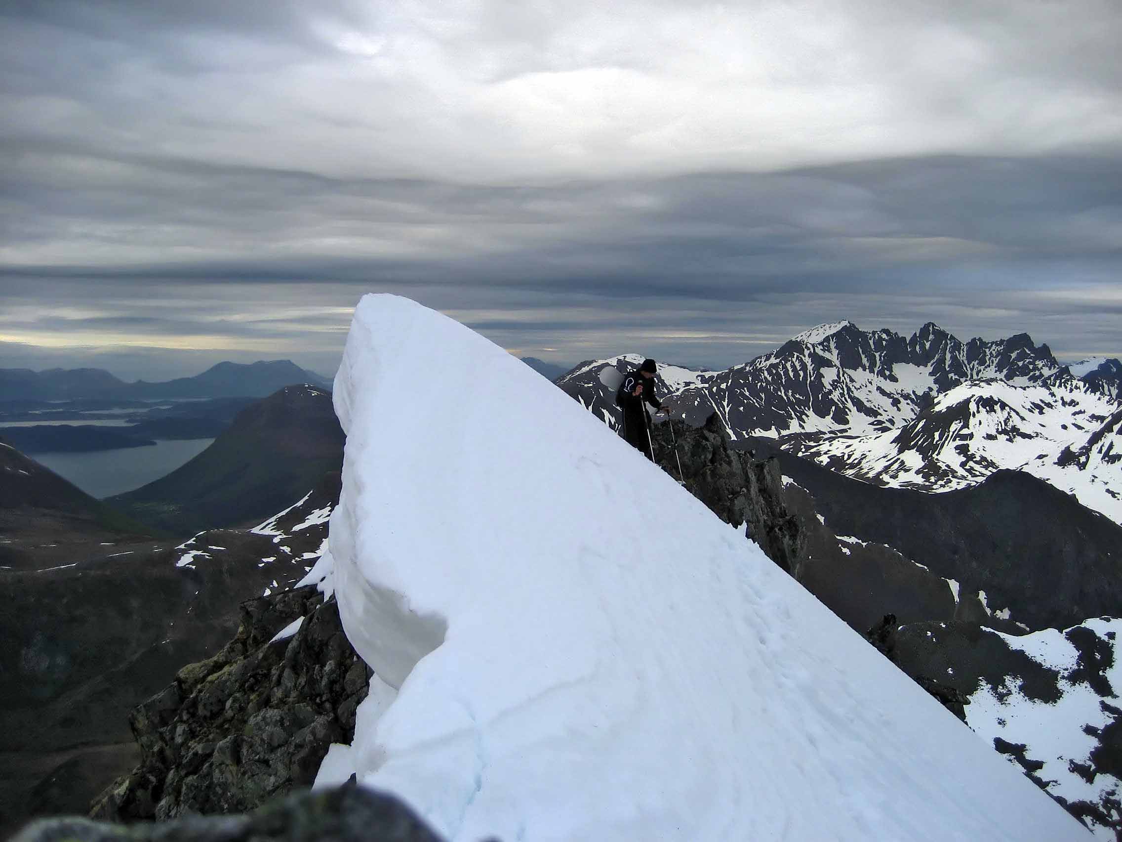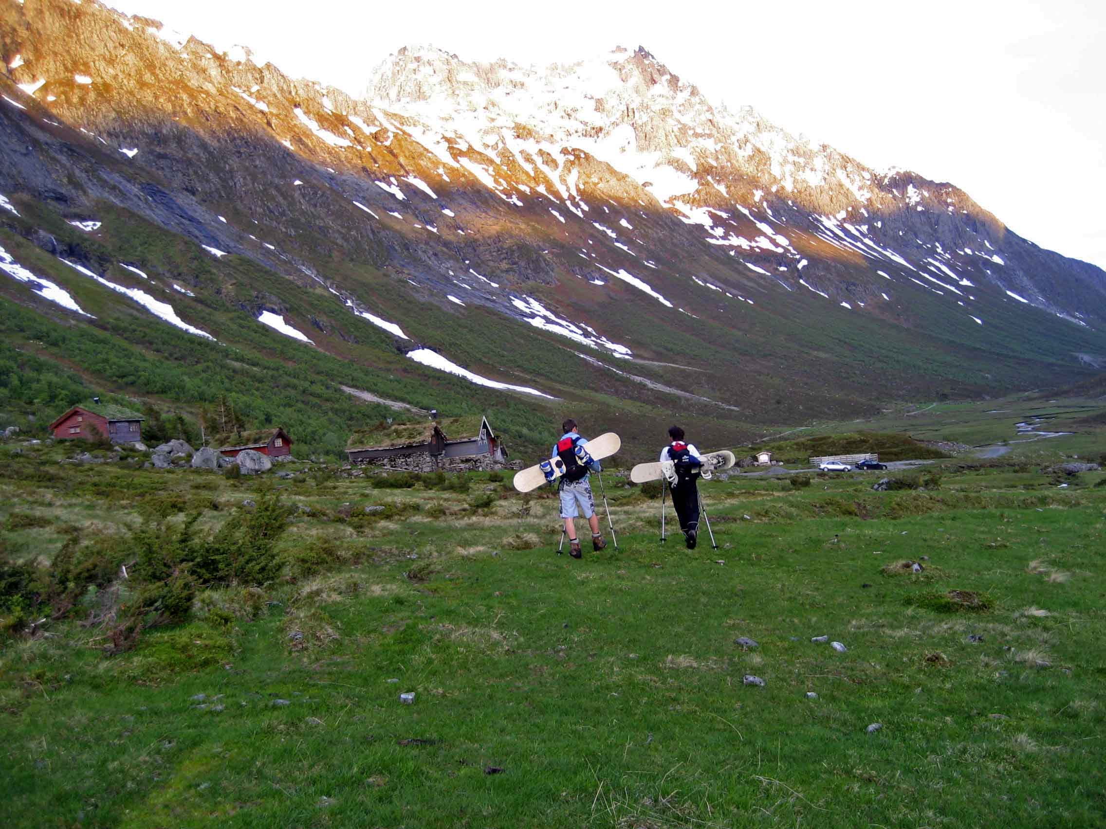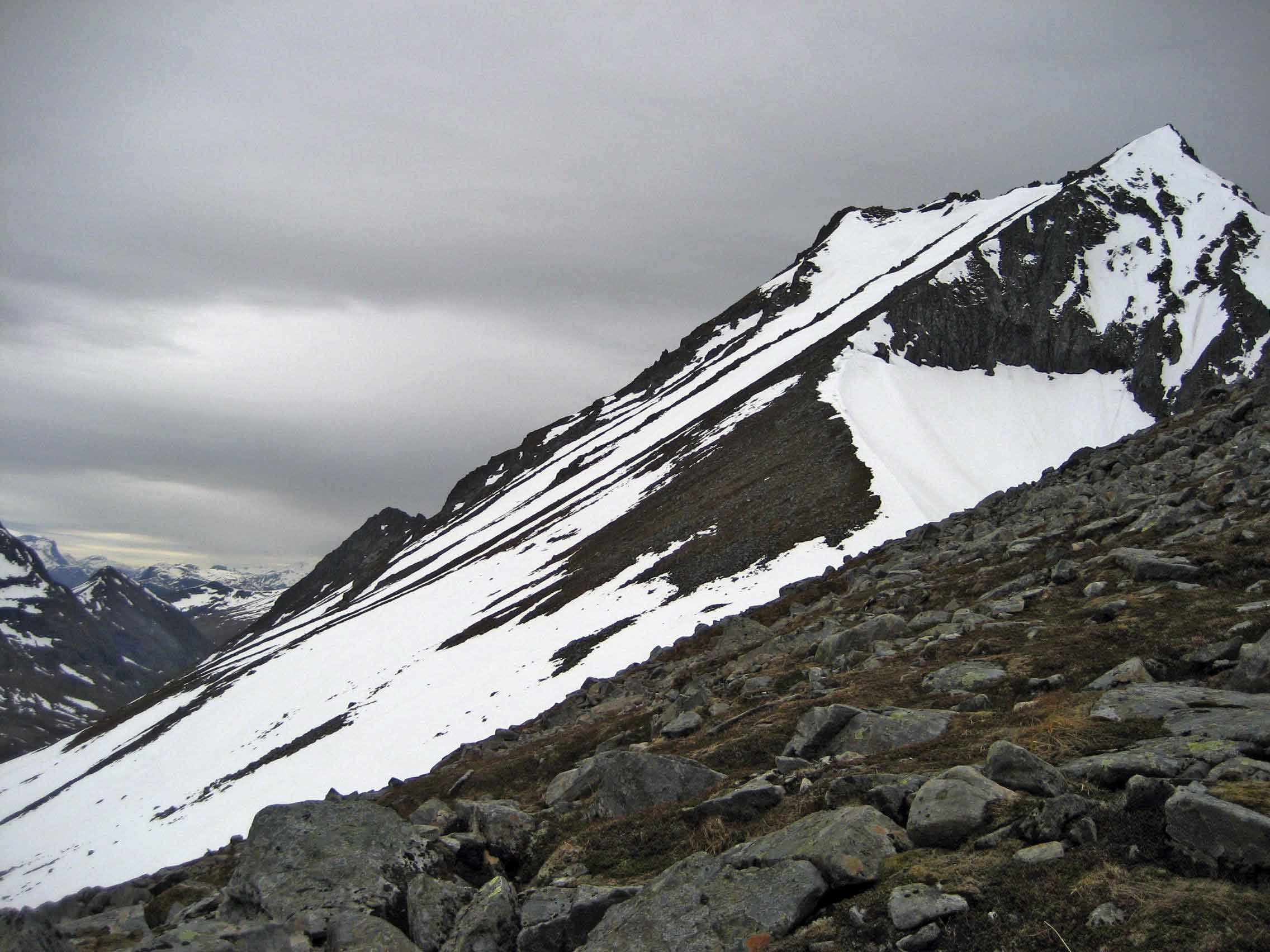 Håp om skiføre her, er garantert etpar veker.. Hadde en ettermiddagstur på Åvasstinden i går, 8.6. Turen gikk fra Steinestøylen i enden av Romedalen med kurs mot Ørstaskaret og videre til Åvasstinden. Ruta opp her går innom samme ruta som fra Vartdalsetra omtrent ved Ørstaskaret. Starta fra Steinestøylen rundt klokka 18, og nådde toppen omtrent 21.00 med bedagelig gange, hadde pakka med stegjern, men desse fekk ligge trygt i sekken, da ryggen opp var bar. Idet vi nådde toppen, opna samtidi skydekket seg, og i en lav kveldssol bar det ned renna på snøbrett. Føret var av upåklagelig, og først på ca. 550 moh. var det slutt på snøen. Om dette gjelder "dalføret" videre ned mellom Kuvane skal vere usagt, ruta vår gjekk ned igjen mot Steinestøylen.