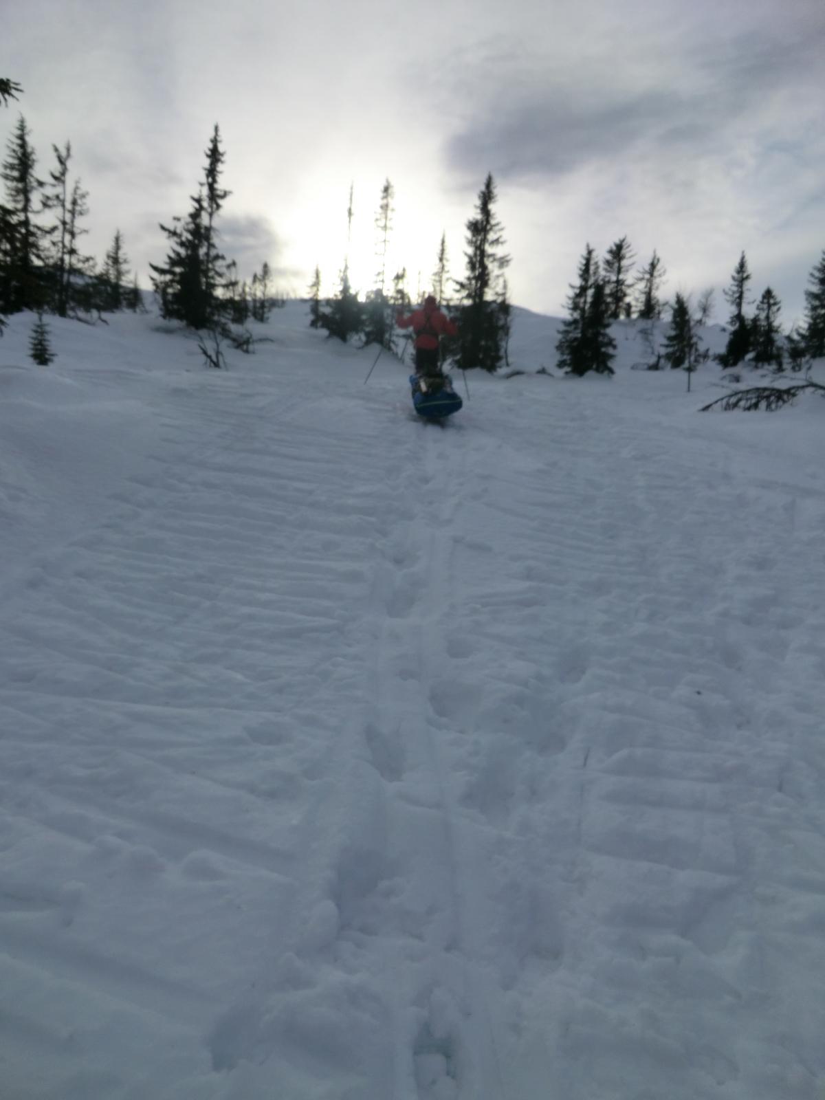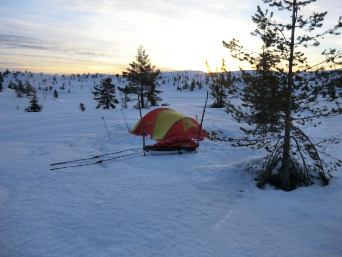 Du vil klare å komme deg til Blefjell, men å komme seg til Kongsberg er bare å glemme . Så fort man kommer ned mot Bolkesjø er det lite snø og terrenget er uframkommelig . Opplevde intet overvann med unntak av da vi hadde teltplassen på ett vann å prøvde oss på å grave en kuldegrop og fant da vann Vi startet vår ferd på parkeringsplassen ved Nordstulvannet. Jeg er vel muligens en av få som har brukt Svalbard 3 som solotelt og brukt pulkpose på det såvidt meg bekjent. Det fungerte helt ypperlig og oppsett av det var ekstremt enkelt.