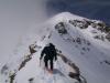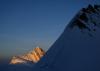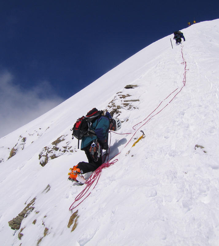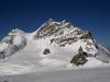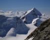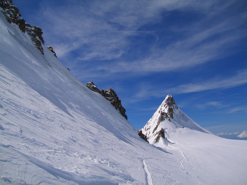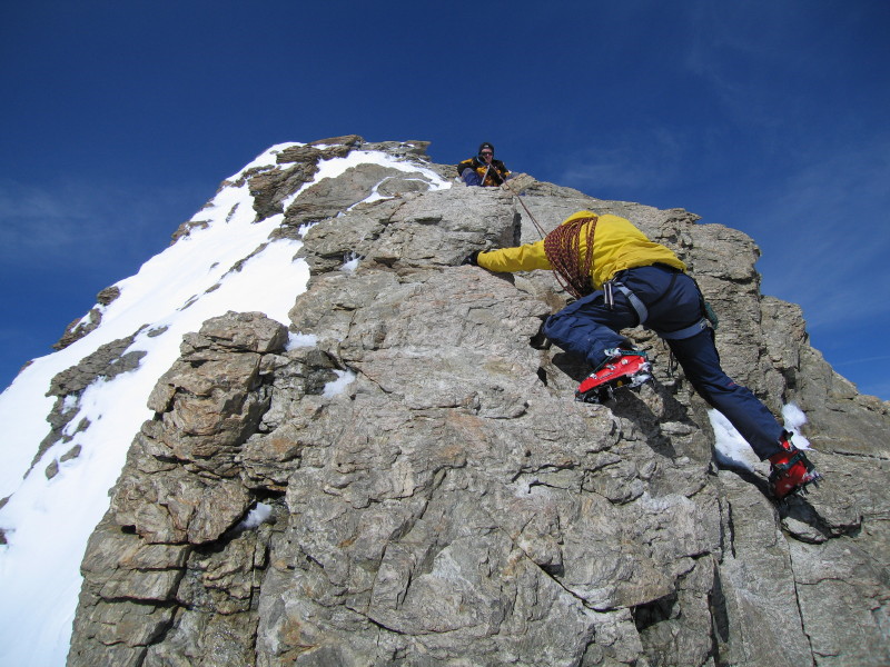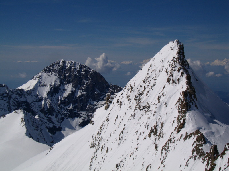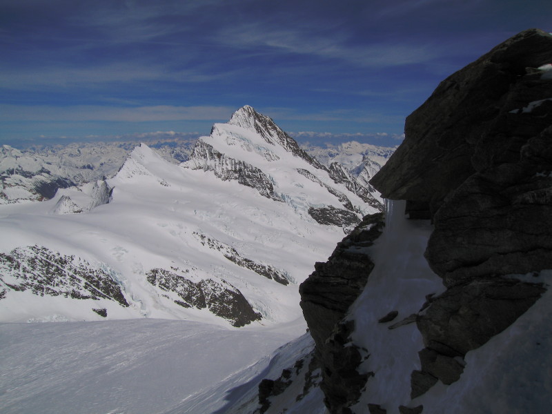 (betrakt bildene nedenfra og opp om du ønsker å følge turkronologien) Der gårsdagen startet som grøt, råder solskinnet fra starten av nå som Fiskehornene står for tur. Det dreier seg om Grosse, Hinter og Kleine Fisherhorn - de to første over 4000 meter. Det hele starter med fire kilometer skinedkjøring fra Mönchjochhütte (3650moh) til ca. 3200 moh. Herfra bratt opp på ski mot skaret mellom de to førstnevnte toppene. Skaret ligger på ca. 3900 meter. De siste tre hundre meterne setter jeg - og andre som skal returnere samme vei - igjen skiene. Herfra er det isøks og stegjern opp til skaret. I skaret er det en smule folksomt. Men det fortar seg straks jeg begynner å klatre eggen opp til Grosse Fisherhorn. Etter Mönch virker det ikke så dramatisk (PD). Jeg begynner å venne meg til å klatre terreng der " sannsynligheten for fall er liten, men der konsekvensen av fall er stor" igjen. Føler jeg meg trygg, er jeg trygg - er dagens filosofi. I dag har jeg simpelthen lagt igjen tauet som lå i sekken i går. Vel nede i skaret igjen er det Hinter Fisherhorn som står for tur. Her er det mindre klatring. Men desto mer spennende er et 55 grader isparti på 30 meter. Aluminiumsstegjernene fungerer også her. Vel oppe på toppen knipser jeg løs: Det er fra dette utsiktpunkt mulig å fange Mönch, Eiger og Grosse Fisherhorn i samme bilde. Men jeg har en topp igjen. Kleine Fisherhorn er under 4000 meter men har en nydelig eksponert snøegg som i øyeblikket er dekket av jomfruelig nysnø. Det varer ikke lenge. Den minste toppen viser seg å være mest krevende. Vel tilbake i nevnte skar oppdager jeg resultatene av solens arbeid. Snøen har sluppet i den vestvendte rennen og flanken jeg nå skal klatre ned (ras). Man får se det positive i situasjonen: Løssnøen har allerede rast ut og det er lite sannsynlig at det skal rase mer. Til gjengjeld må jeg sparke nye spor. Vel nede oppdager jeg at raset har herjet med skiene mine. En av dem er borte. Og for å gjøre en lang historie kort er dette nok til at Jungfrau må vente til neste gang. Det må også Aletschorn og det vakre Finsterarhorn. For ikke å snakke om Schreckhorn. Merk navnet - kanskje like godt.