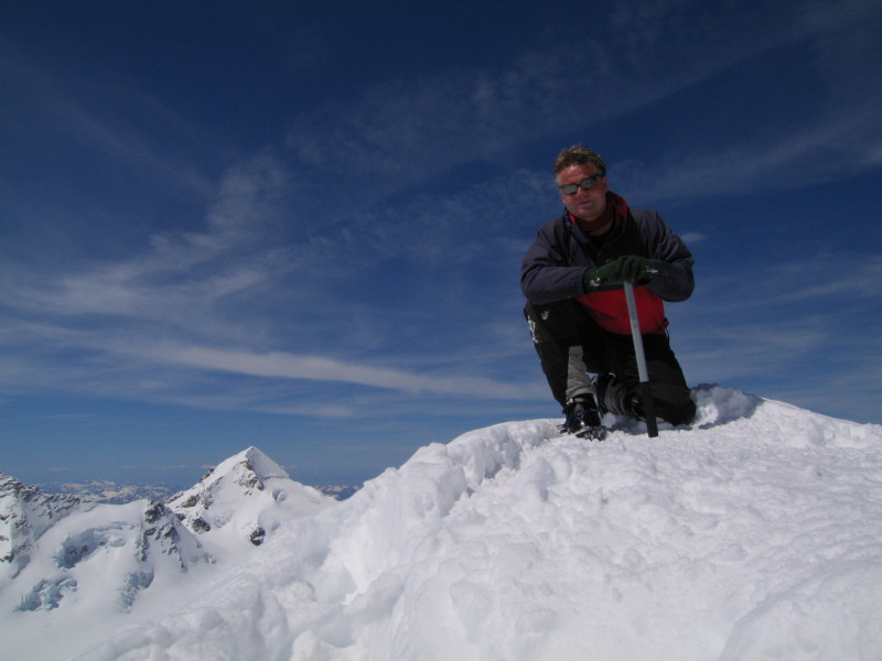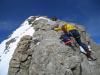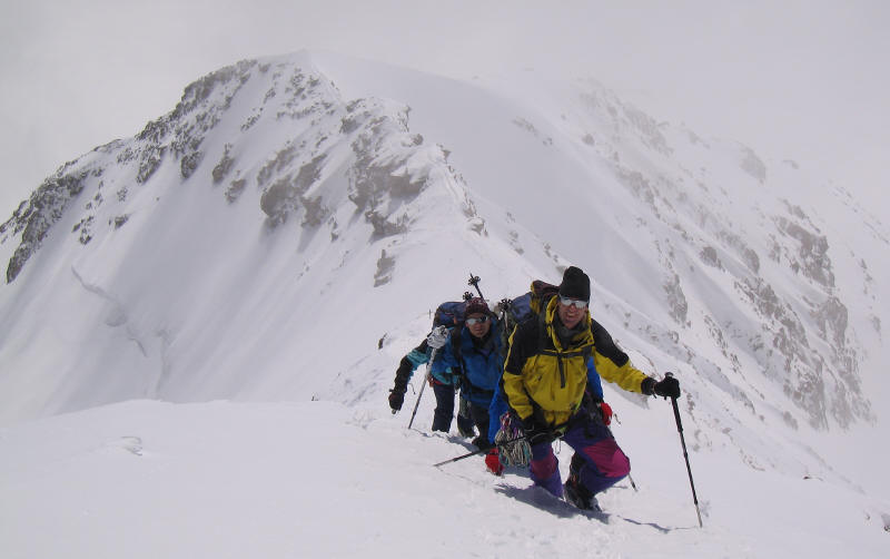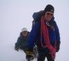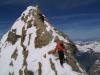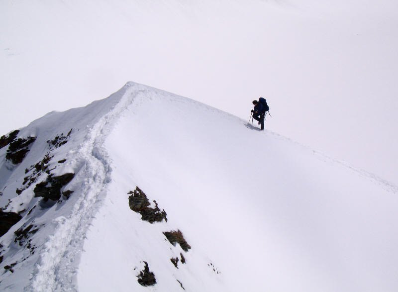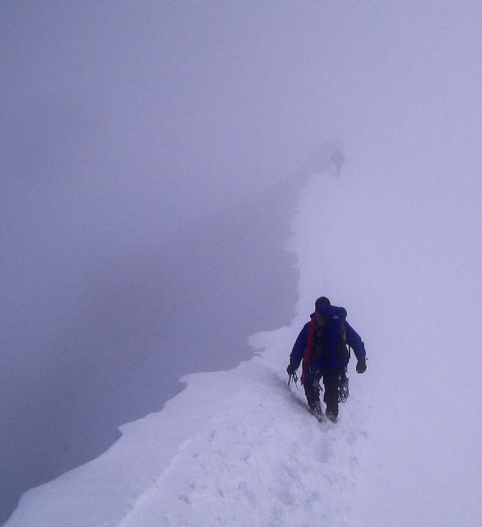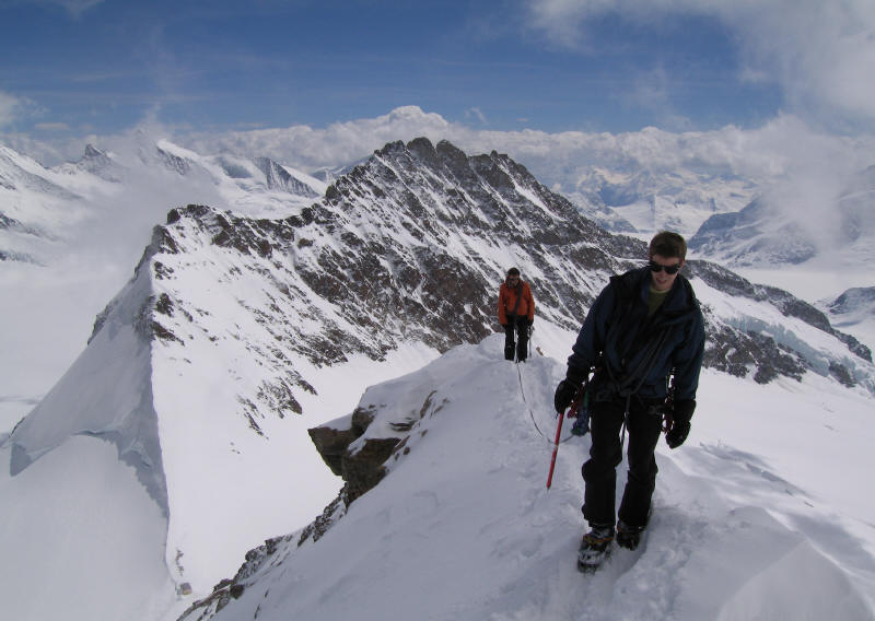 (Bildene bør betraktes nedenifra og opp om du vil fange turkronologien) Inspirert av Coni sin påsketur dro jeg drøye måneden etter ned til Berner Oberland i de sveitsiske alper, som en måte å kombinere jobb og fornøyelse. Jeg kan bekrefte at togbiletten fra Lauterbrunnen til Jungfraujoch (3500 moh.) t/r var dyr (154 sveitser frank). Men det glemte jeg fort da jeg sto på breen utenfor stasjonstunnelen. Det var bare å legge avgårde på ski mot Mönchjochhütte en halvtime unna (3650 moh.). Etter en forutsigelig dårlig sovenatt. våknet jeg til tåke og vind. Men jeg hadde ikke tid til å ligge på været og gav meg avsted ved 7.30-tiden. Ved innsteget var to tyske karer i gang med taurigging. Selv dro jeg på meg de nye Camp-stegjernene på de nesten like nye Scarpa T-4 telemarkstøvlene, og labbet opp den brede ryggen mot Mönch på jomfruelig sne. Etterhvert bratner og smaler det til - og jeg "tvinges" ut i toer-klatring på klippe, 45 graders snøklatring i flanke (til venstre) avbrutt av snøegger i varierende bredde. Siste halvdel av bestigningen starter med en bratt snøflanke opp mot 50 grader. Her er det noe is, men også noen jernspidd som kan brukes til forankring om man bruker tau. Jeg klatrer alene og må konstatere at de nye lettmetallstegjernene også fungerer på moderat is. Over ispartiet flater det hele ut i en nesten horisontal topp-egg som ikke ser ut til å gi seg i det usiktbare været. Kan bare ane abyssen der nede - også fordi Coni har fortalt det i en tidligere turrapport. Det er bare å føle seg frem med stav og isøks i den jomfruelige snøen. Det føles nesten perverst å like seg her. Best ikke å forsøke og deschifrere psykologien i dette. Bare nyte resultatet av de kjemiske og psykologiske prosessene hvor både adrenalin og kompenseringsbehov åpenbart må inngå. Det er nesten et antiklimaks å komme opp. En stund er jeg ikke sikker på om jeg har kommet opp pga. tåka. Etter en stund kommer de to tyskerne - Toby og Sven - også. Vi går sammen ned toppeggen. I det vi forlater denne ned isfeltet, bryter solskinnet løs, og straks blir det mye motgående trafikk. Det er ingen grunn til å stresse nå som sola skinner og vinden har tatt pause. Nå er det fotografen i meg som tar overhånd. Jeg vinker farvel til Sven og Toby som skal rekke et tog. Neste dag skal jeg på Fisherhornene. Det er været som vil bestemme om og hvor mange...