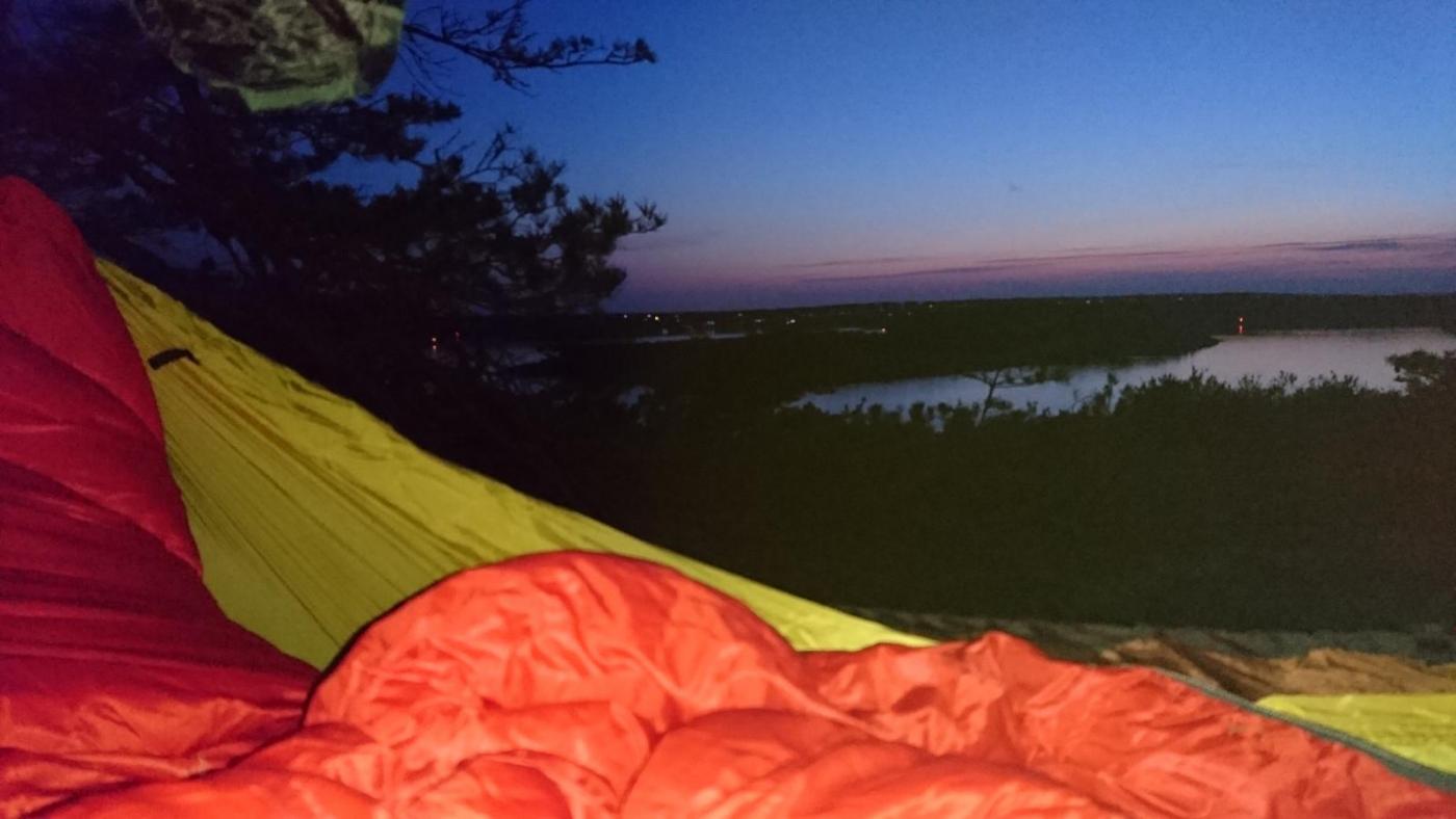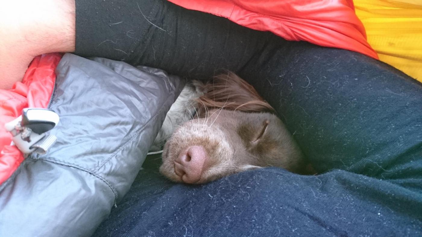 Endelig, varmt i været og stille. I løpet av noen få strakser på lørdags kveld, ble sekken pakket for en liten topptur i mitt nærområde. Med en overivrig hund i front, ble de nesten to km unnagjort i en feil. Rakk akkurat og få opp hengekøya før solen forsvant. I horisontal avslapping nøt jeg kveldshimmelen mens hunden nøt tørre pinner. Så helt stille ble det ikke. Vi sovnet etterhvert, jeg i hengekøye innsvøp i dun, og hunden i Jervenhiet sitt. Utpå morgen kvisten var det en liten som ikke lenger var fornøyd med Jervenhiet sitt. Så de siste timene ble felles kos i køya.
