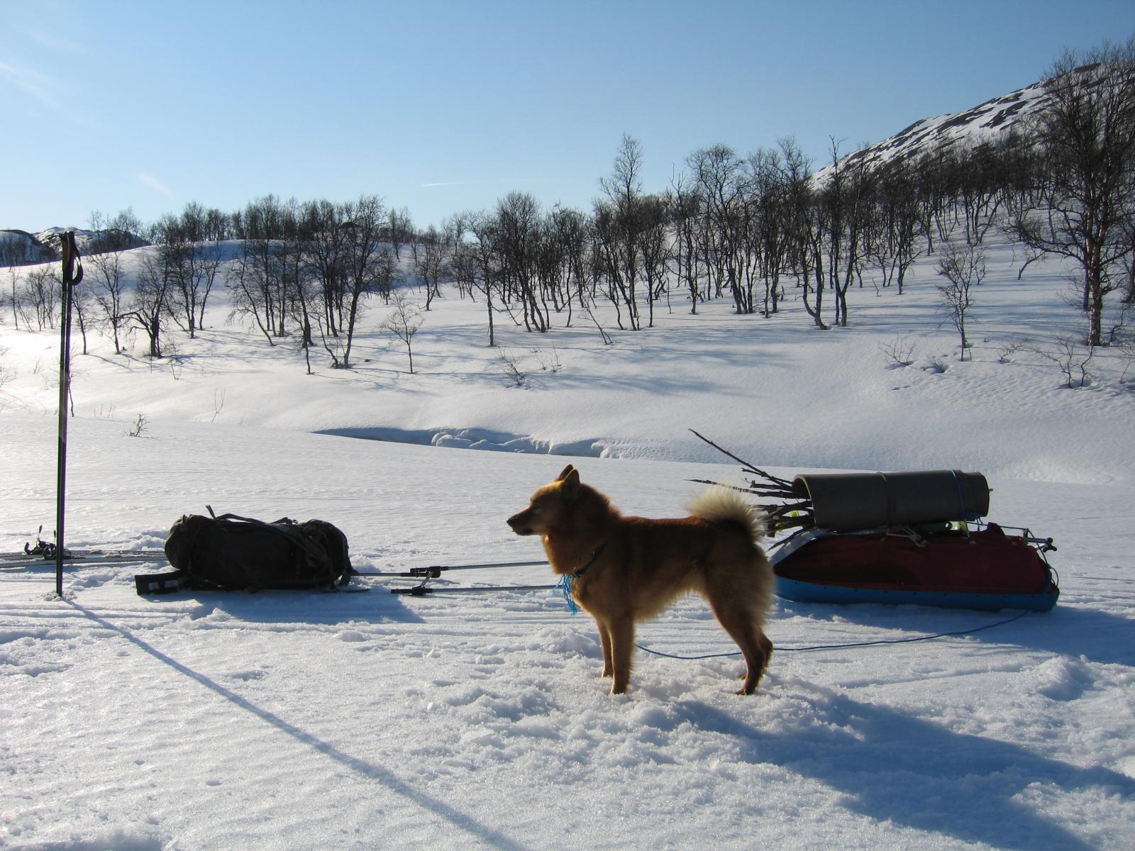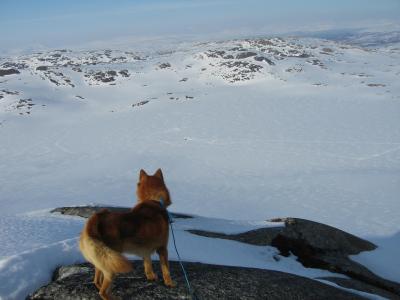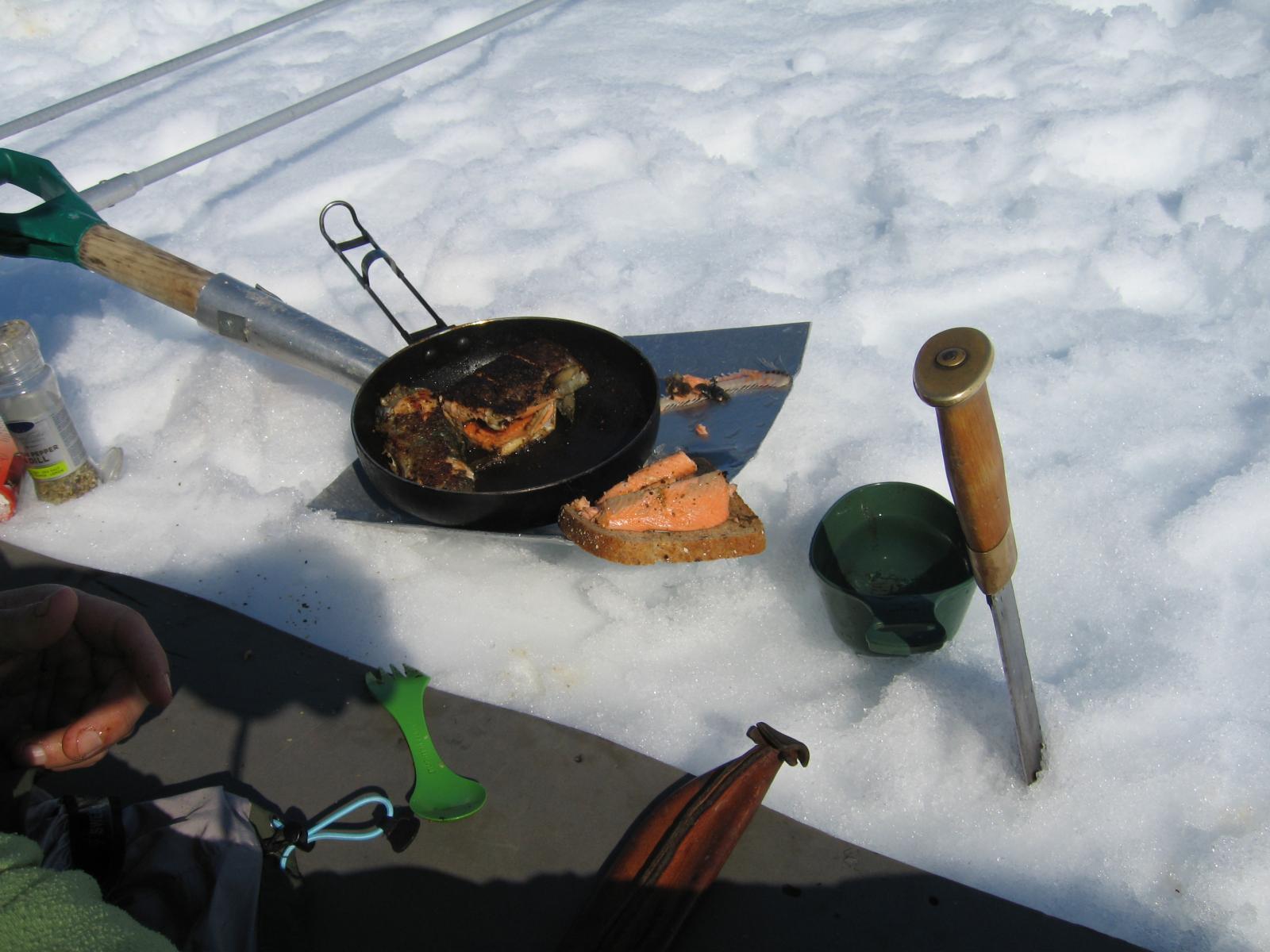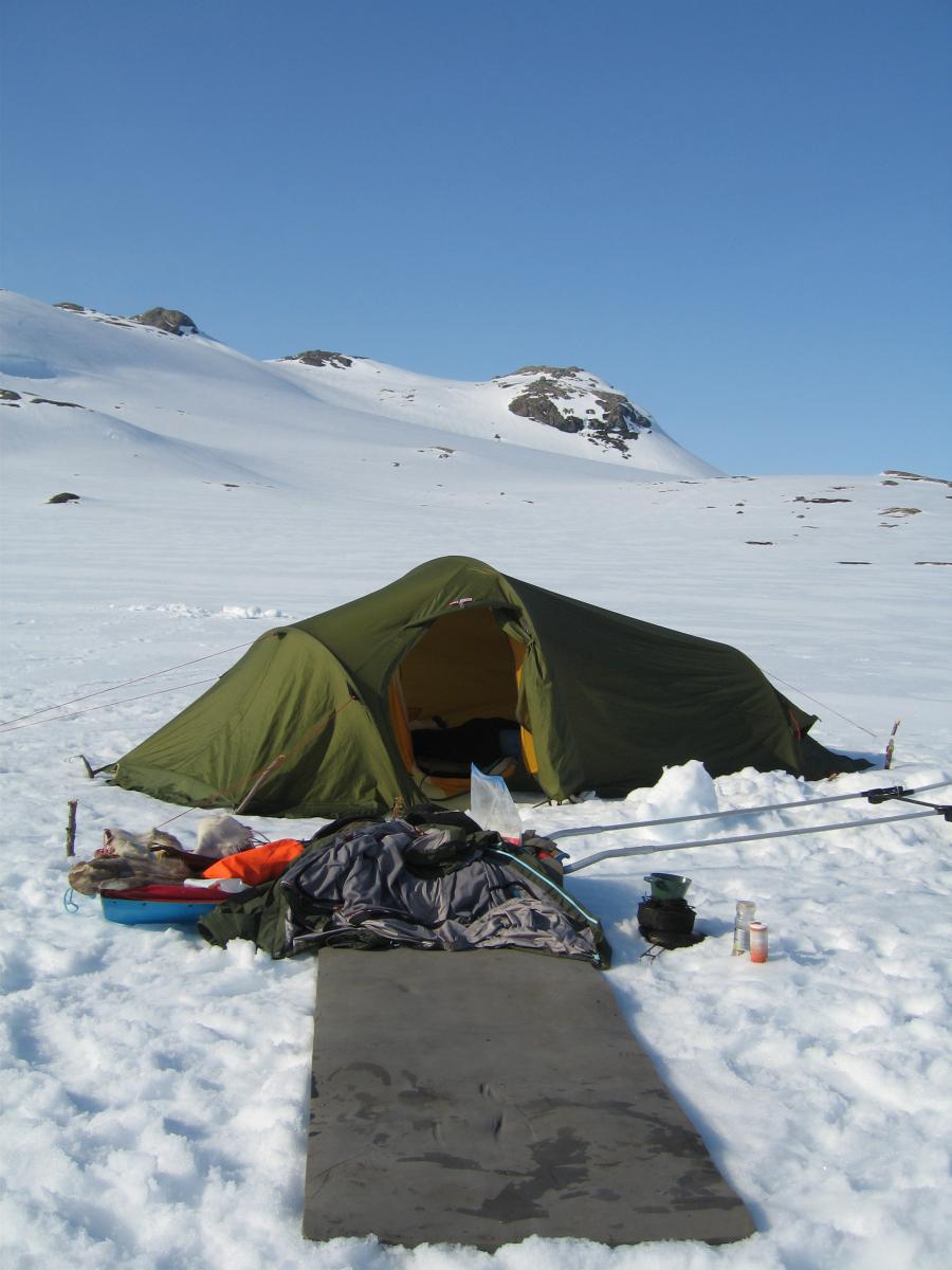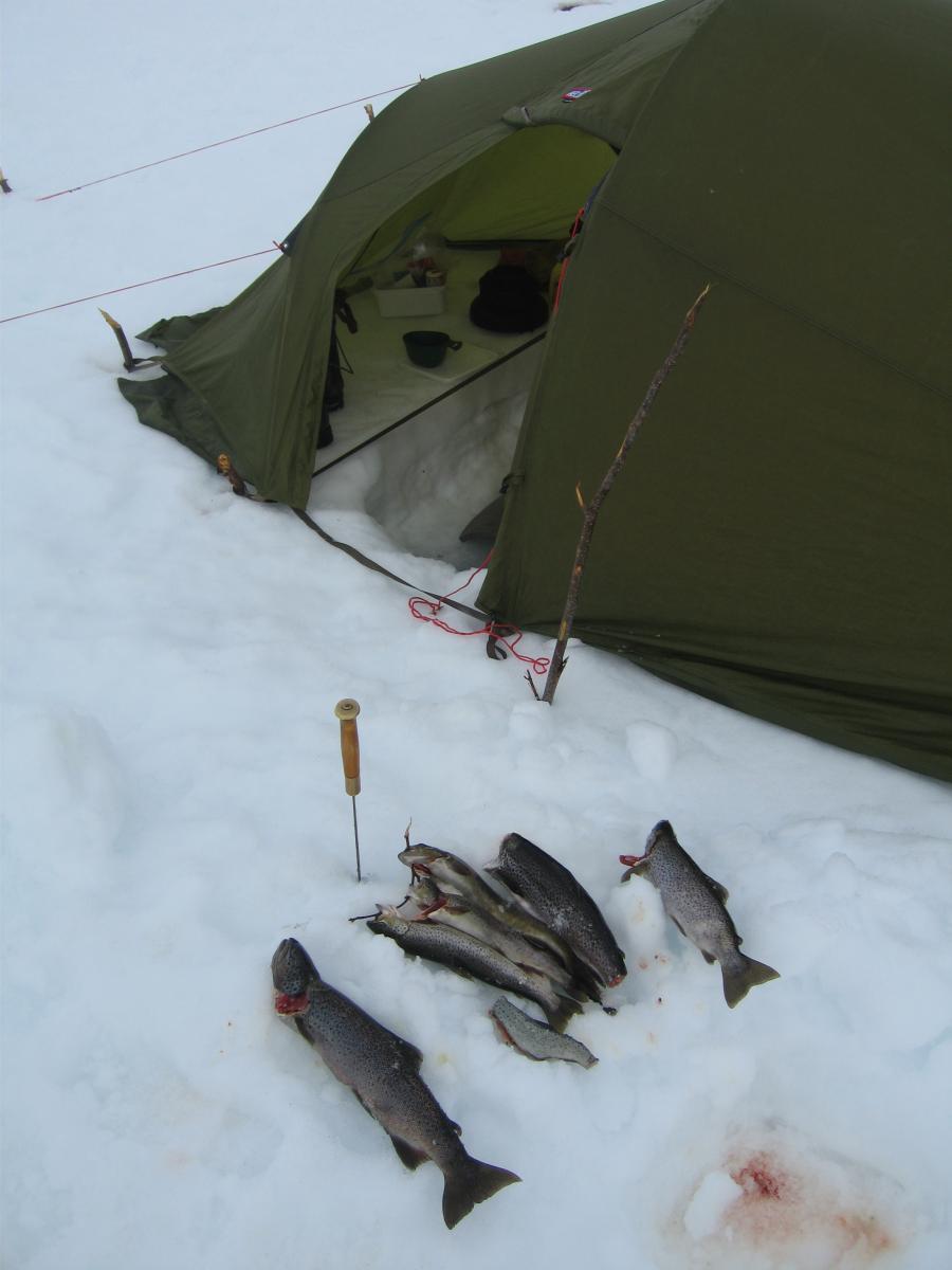 Som ivrig leser på fjellforum føler jeg at det også er på tide at jeg legger ut en liten turrapport. Det er jo flotte områder jeg ferdes i så de fortjener å vises . Kort fortalt så stakk jeg rett fra jobb sist fredag og til fjells,og med kurs for grensefjellene. Jeg hadde halvannen times kjøretur,og et par-tre timers skitur foran meg før jeg var ved den tjønna jeg hadde tenkt å campe ved. Buster og gammelpulken. Et rypepar hilste oss velkommen Fantastisk fint vær,føre og teltplass. Fredagskvelden gikk med til å bore hull og sette ut snører,og jaggu fikk jeg ikke fisk også og fisk er jo mat,ergo ble det stekt fisk til kveldsmat. Lørdagen startet med å sjekke snørene og ta av et par ørreter. Etter frokost ble det en to og en halv times skitur i området,i sol og vindstille. Midt på dagen lå jeg stort sett og døste utefor teltet. På kvelden ble det en ny lang skitur på toppene i området. Denne karen var ikke langt unna De gamle fjellskiene funka bra i slushen. Lørdagsmiddagen Noe av fangsten Denne kilosrøya slapp jeg tilbake da den var krøket i sporden. Den var i tillegg ikke kommet helt i form etter gytingen og så litt slapp i "fisken"ut. På søndag våknet jeg til skodde,en skodde som holdte seg helt til i tolvtia,men da titta sola frem. Da pakket jeg sammen,og gikk til et annet vann for å prøve fiskelykken noen timer før jeg satte kursen hjem. Oppsummering: Vindstille,rundt null grader,sol,turboføre,rypekakling døgnet rundt,og bra fiske. Man føler seg rik når man får slike opplevelser