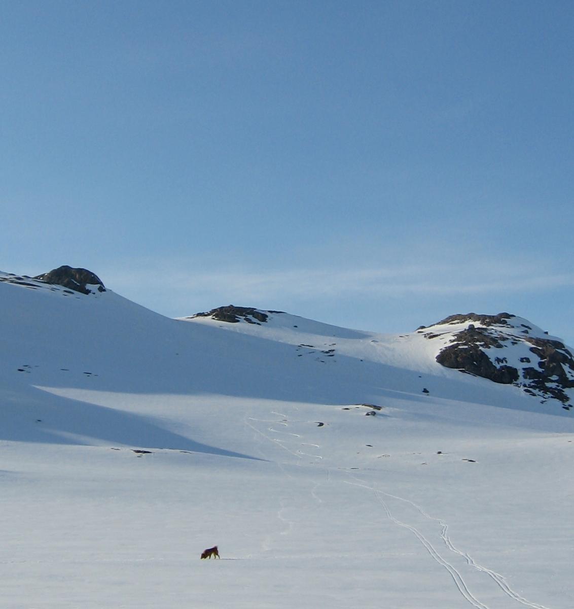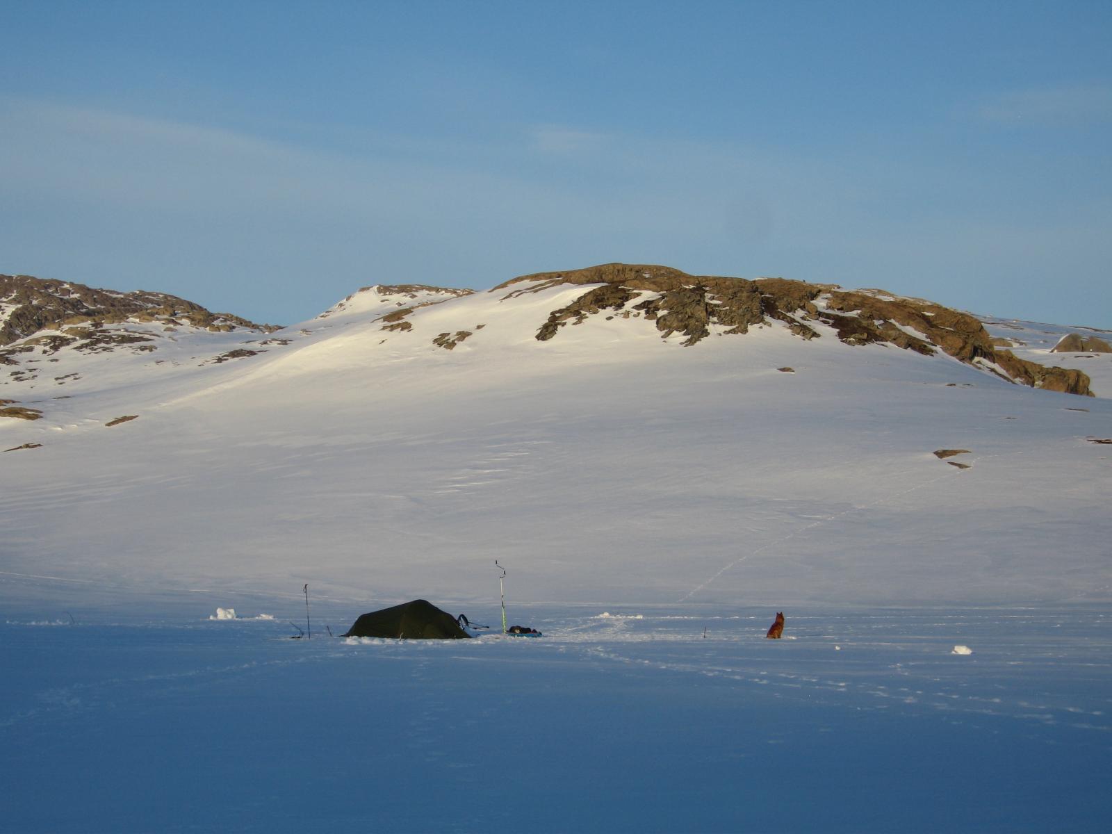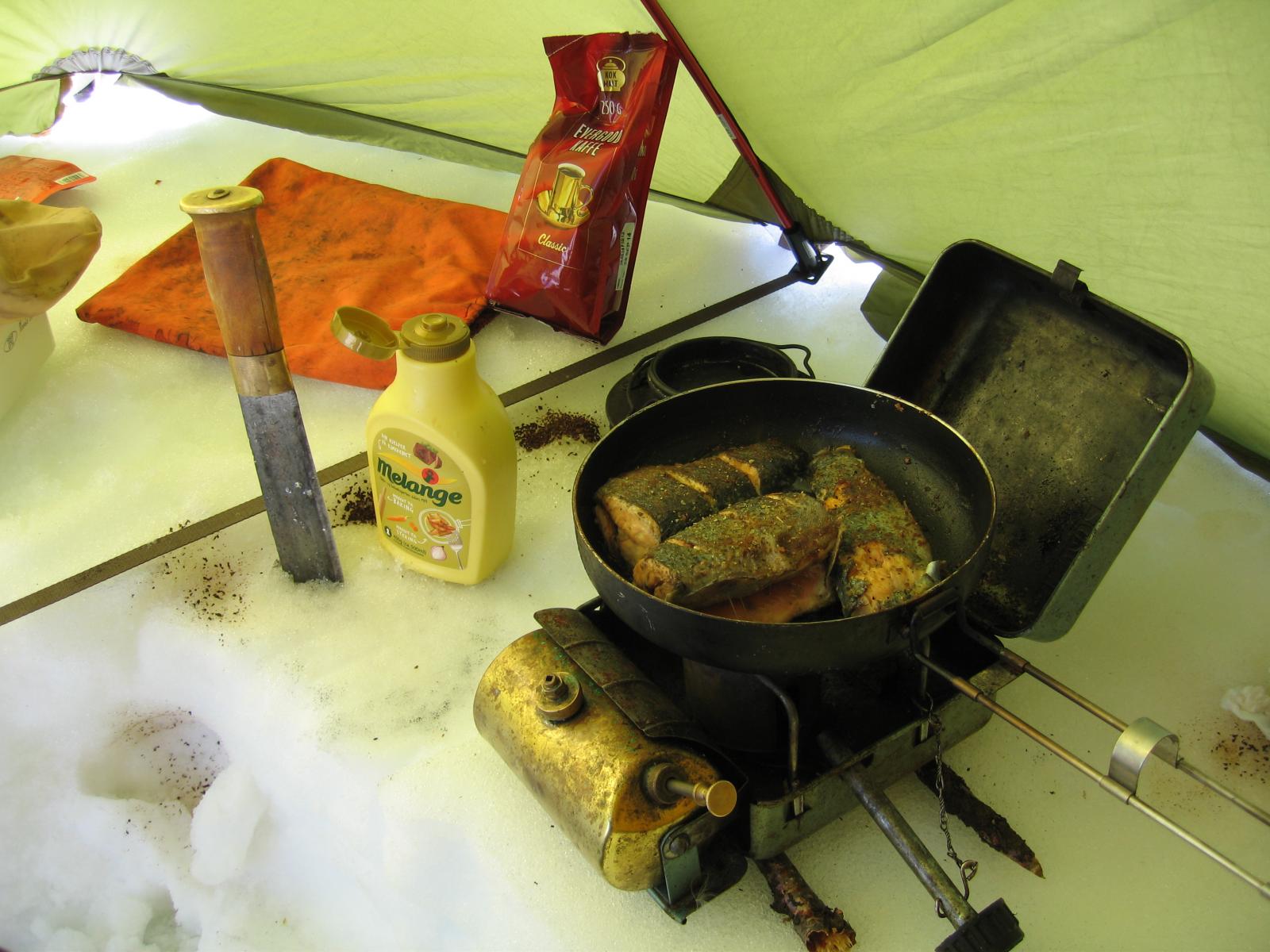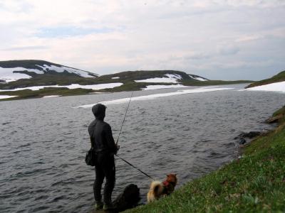 Som ivrig leser på fjellforum føler jeg at det også er på tide at jeg legger ut en liten turrapport. Det er jo flotte områder jeg ferdes i så de fortjener å vises . Kort fortalt så stakk jeg rett fra jobb sist fredag og til fjells,og med kurs for grensefjellene. Jeg hadde halvannen times kjøretur,og et par-tre timers skitur foran meg før jeg var ved den tjønna jeg hadde tenkt å campe ved. Buster og gammelpulken. Et rypepar hilste oss velkommen Fantastisk fint vær,føre og teltplass. Fredagskvelden gikk med til å bore hull og sette ut snører,og jaggu fikk jeg ikke fisk også og fisk er jo mat,ergo ble det stekt fisk til kveldsmat. Lørdagen startet med å sjekke snørene og ta av et par ørreter. Etter frokost ble det en to og en halv times skitur i området,i sol og vindstille. Midt på dagen lå jeg stort sett og døste utefor teltet. På kvelden ble det en ny lang skitur på toppene i området. Denne karen var ikke langt unna De gamle fjellskiene funka bra i slushen. Lørdagsmiddagen Noe av fangsten Denne kilosrøya slapp jeg tilbake da den var krøket i sporden. Den var i tillegg ikke kommet helt i form etter gytingen og så litt slapp i "fisken"ut. På søndag våknet jeg til skodde,en skodde som holdte seg helt til i tolvtia,men da titta sola frem. Da pakket jeg sammen,og gikk til et annet vann for å prøve fiskelykken noen timer før jeg satte kursen hjem. Oppsummering: Vindstille,rundt null grader,sol,turboføre,rypekakling døgnet rundt,og bra fiske. Man føler seg rik når man får slike opplevelser