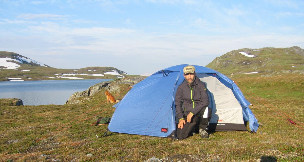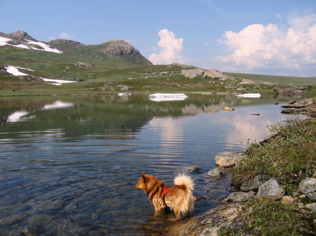 Har akkurat kommet hjem etter noen dager i "det gjemte landet" Lomsdal-Visten. Sol fra skyfri himmel,og nesten vindstille hele tiden . Vi begynte med å gå opp til Bijjiejaevrie og slo leir der. Dagen etterpå gikk vi opp skaret midt i bildet og over mot Elgviddvatnet. Her har jeg akkurat kommet opp etter oppstigning fra Bijjiejaevrie. Teltplass Elgviddvatnet. Ego med Elgviddvatnet i bakgrunnen Buster tørker seg etter et bad i Elgviddvatnet. Ego med Øvre Jordbruvatn og Breivasstinden i det fjerne. Fruen prøver fiskelykken ved Nedre Jordbruvatnet. Ego og Buster ved tjønn 826 som man går forbi når man går fra Jordbruvatnet og skal til Måsvasstjønnan ved Tosentunnellen.