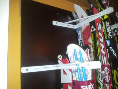Lette også høyt og lavt på nettet for å finne en god løsning for lagring av familiens 15 skipar. Det finnes noen dyre standardløsninger men fant ut at jeg like godt kunne skru sammen en løsning selv. Jeg kjøpte inn flere lange stålvinkler som jeg monterte med langsidene mot hverandre som vist på bildet.Vi har betongvegger i sportsboden. Jeg valgte derfor å montere alle 5 parene med vinkler på i finerplate som så ble skrudd fast i 2"x4" på veggen. Med denne løsningen kunne jeg også montere vinklene med skruer og muttere. Dette gjør det enklere å stramme skruene dersom det blir slark. Vi har 3-4 langrenns og alpinski hengene på hvert vinkelpar.Etter å ha brukt skistativet i 4 år er vi svært fornøyde. Skiene henges opp parvis med en reim i topp og en reim i enden av hvert skipar.
