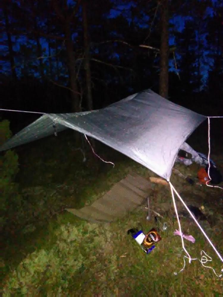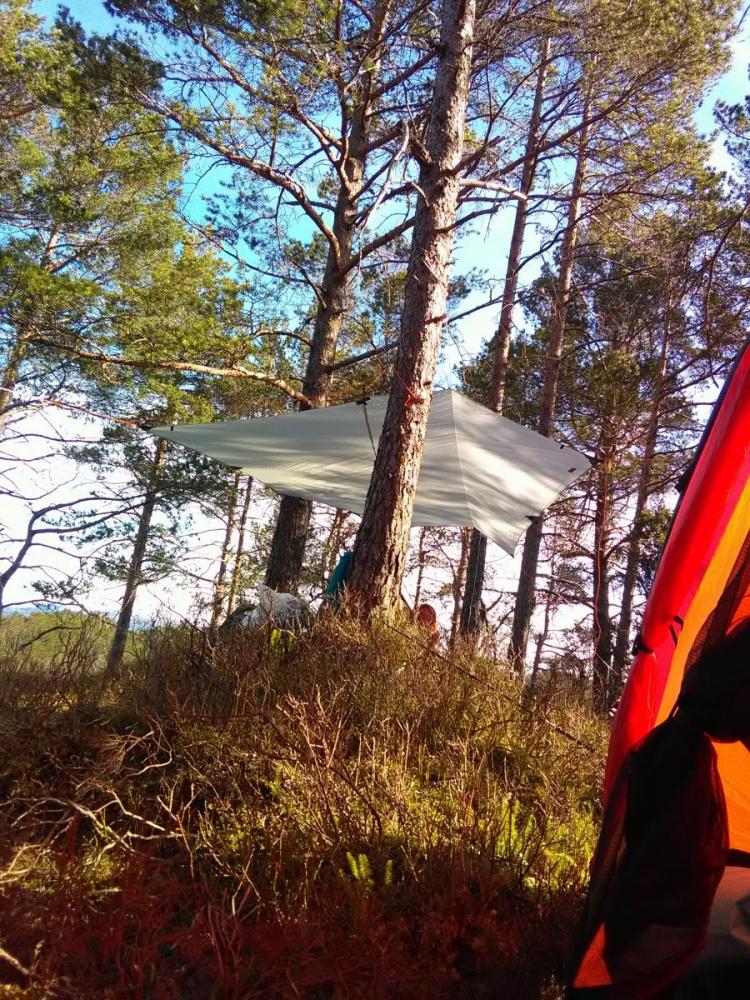 Bruker Gossamer gear C twinn tarp. Ble tilfeldigvis bestillt da jeg kjøpte en sekk fra http://www.backpackinglight.dk/ Den er vel noenlunde 3x2 i dimensjoner. Blir bare med i sekken hvis det er meldt regnvær. Vekt 324 g. Det finnes også en cuben fiber versjon av den som er dobbelt så dyr (200 g, 3000 kr). Ifh til cuben fiber tarp...vet ikke helt om jeg vil sette opp en duk til 3000 kr over et bål.