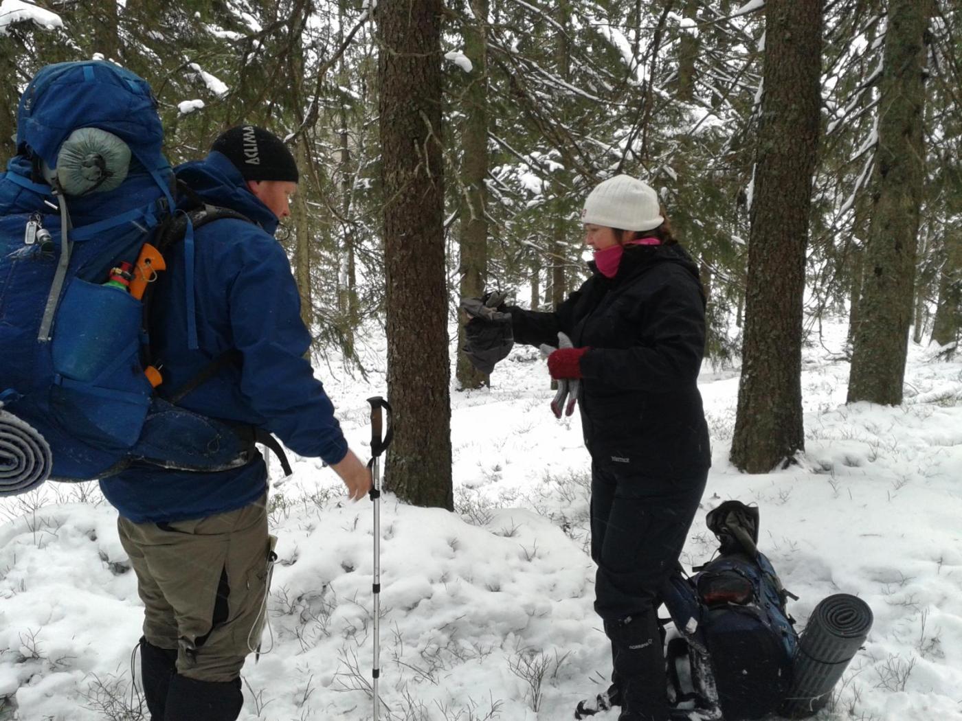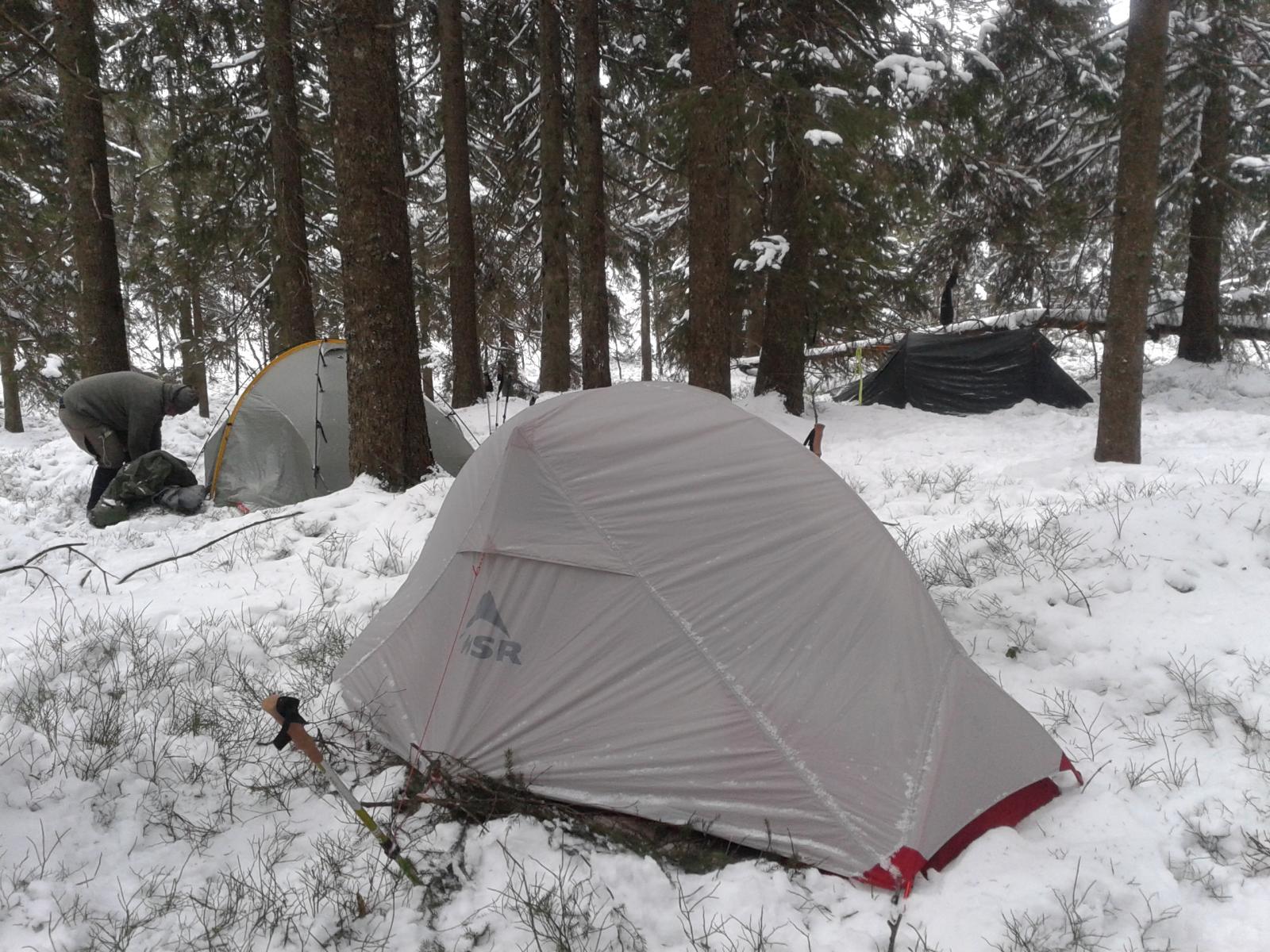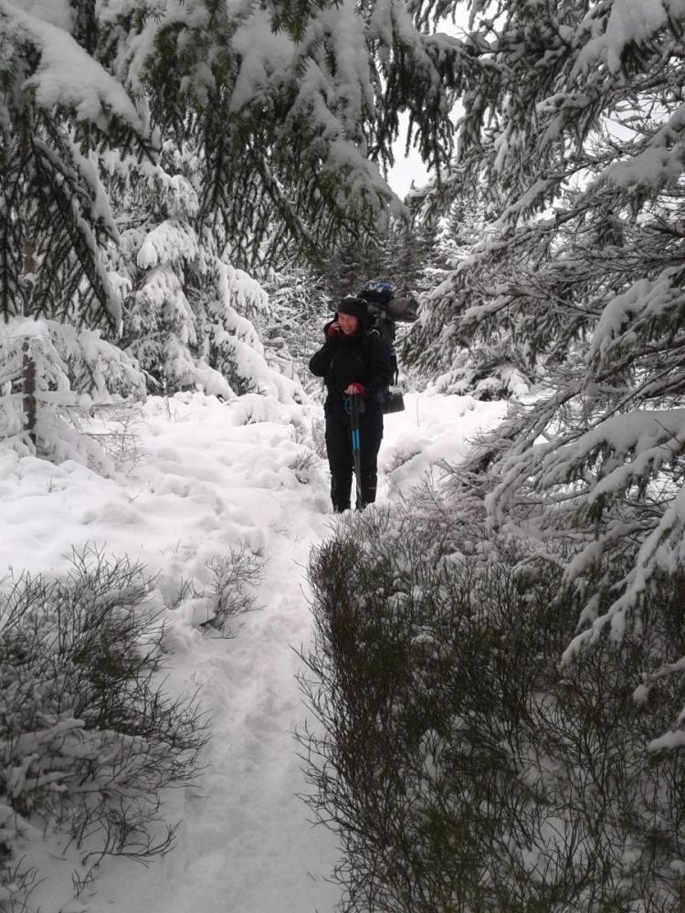Her kommer rapporten på Lillomarka treff! Vi ankom fra forskjellige steder og på forskjellige tidspunker. For meg begynte dagen med å løpe i byen med min stor sekk for å prøve å rekke toget som ankommer kl 10 på Snippen. Jeg ble svettende, men rakk dessverre ikke toget. @Xperiment sammen med @MagneJ og @Blaser (riktig?) gikk da uten meg fra Snippen kl 10. De gikk til Kroktjern via Sinober. @Mossy og jeg begynte fra Sippen kl12. Vi ble overrasket å se at snømengden var trippel så mye som i Oslo. Etter en kort diskusjon bestemte vi å følge først skogsveien, så en umerket sti til et hytteområde, så en blå sti østover, og til slutt den sørover umerkete sti til Kroktjern. Det ble lett å følge den umerkete stien siden noen hadde tråkket stien før oss. Vi sjekket likevel noen ganger orienteringskart+kompass for å sjekke retningen til sporene. Sporene stoppet ved siden av hyttene. Så følgte vi den blåe stien: der var vi først å tråkke og det ble gøy . Puddersnøen var lett å tråkke, og på hver steig ble vi overrasket om det var ei myk myra/et tynt islag som knekker/en iset stein/normal terreng som var under føttene våre! Ekte eventyr følelse. På veien fikk vi høre at teltleir var etablert på vestsiden av Kroktjern. Vi fikk også høre at @tronn sammen med @Sig Man (håper igjen jeg tar ikke feil med forumnavnene!?) hadde overnattet på fredagskveld på en annen lite innsjø. Da vi ankom på Kroktjern var nettopp @Gittiamo sammen med @Denali ferdige med å sette opp teltet. De hadde vært fra Nittedal, sammen med den snille hunden Imsé (riktig?) som var akkurat da tydeligvis ikke trøtt i det helt tatt av turen . Senere ble Imsé derimot helt sovende ved siden av oss! @tronn sammen med @Sig Man ankom litt etterpå. Så ankom @Johan2000 som klarte å sette opp teltet rask før det ble veldig mørkt. Teltene og hengekøyene ble satt opp på de blåbærbuskene dekket med snøen. Det var fortsatt egentlig smakelig blåbær @Xperiment var bålsjefen; han hadde kappet/saget vedkuber fra døde trær sånn at et fint bål begynte snart å varme oss. Så ble det måltid rundt bålet, snakking, godteri...Flere hadde "luksus mat", middagpalmen er til @Mossy som hadde kokt en lammestek hele natten i ovnen på lav-temperaturen med grønnsaker. Smaken var helt topp! Det ble også fisk på bål, curry med ferske brokkoli...(ah, jeg skal ikke nevne hva som jeg spiste selv, det var ikke presis luksusmat !). Det ble også bursdagssang på norsk og på fransk, og hjemmelaget marmor (marbled??) kake. Vi hadde også noen troll rundt oss: snøballer falte regelmessig nesten på hodene av de som satt under trærne, og trollene også sendte oss bålrøyk og bålgnister (sannsynligvis ikke på fastretning!). Jeg fikk høre om fjellgris (cf se posten fra @Gittiamo), rafting, utstyr, tur, språk. Jeg lærte nye order: grishus (elsker at det norske språket er så logisk at stedet hvor bor grisene heter bare grishus) og gjess (tja, er norsk så logisk med en så uregelmessig flertall??), men sannsynligvis burde det være lettere å lære meg svensk (begge Franskmenn og Svensker spiser [glass/glace]!). Natten ble kjølig og @Xperiment fortalte oss at det hadde vært -9°C på natten (på termometer? eller i følge værstatistikkene?). Lyden til vinden gjennom grantrærne var imponerende, heldigvis hadde vi ikke teltene på toppen av grantrærne men ned på bakken hvor det var roligere! Noen gikk tidlig før jeg selv var helt våken. Det ble frokost/lunsj rundt kl 11 med svinekoteletter, egg+bakon nister, potetmos, grøt med fersk melk (fersk? eller isete ble kanskje mer riktig!)... Det var fortsatt ganske kaldt og små putter hadde fryst i løpet av natten. Så kom alle tilbake hjem og vi la Kroktjern etter en sist sjekk fra @tronn for å la stedet ryddig (han klarte å se hvite lommetørker på den hvite snøen!). Takk til alle dere som ikke la dere skrem av snøen og kuldegrader ;)! Andre bilder finnes Her Og linken til flere av bildene mine kommer også snart!