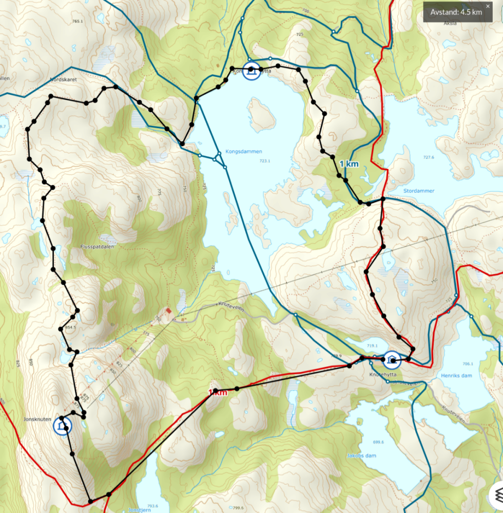 @Blaser@graham@André Pedersen Tusen takk for svarene! Jeg har ikke ennå noe presis plan om å gå der, men undersøker turmulighetene i forbindelse med besøk fra utlandet. Jeg tenkte at turen til Jonsknuten oppfyller kriteria som tur som ikke er for vanskelig, med utsikt, og i flott natur! Her under er en mulig rundtur hvor man går opp fra sør siden av Jonsknutten. Eller er det kanskje lettere å gå opp langs taubanen?