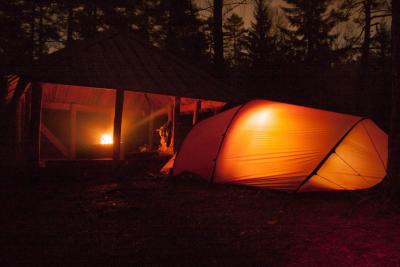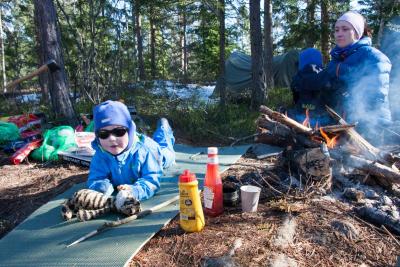 Det har blitt lenge siden november og forrige tur med ungene. Les om den HER. Vinteren har ikke vært spesielt lang eller kald og det har vært mange tanker om tur siden sist. En 1.åring i hus med et noe utfordrende søvnmønster, jobbhelger, enda flere jobbhelger og økende trass på de nå 3 år gamle tvillingene hadde gjort dørstokkmila utrolig lang. Det å ta med 1.åringen på tur vinterstid føltes ikke aktuelt slik som han sov om natta og tur alene med tvillingene i kulda føltes tungt. Jeg var redd for at påkledning og bleieskift ville ta alt for lang tid i kulda. Våren var godt i gang når kong vinter atter slo tilbake og lagde "snøkaos" på østlandet. Dette tok nesten motet fra meg med tanke på når jeg skulle få til tur. Ikke det at jeg eller madammen har noe i mot tur i snø og kulde, men tvillingene har vist seg ikke å være de ivrigste på ski og med snø enda. Da ble det ekstra deilig når godværet virkelig slo til å påsken! Svigermor kunne passe minsten og et vennepar villle være med på tur! Planen hadde jeg tenkt på lenge. Parkere langs en grusvei ikke langt hjemmefra, gå litt innover veien for så å ta av veien inn på en god sti/traktorvei. Denne gikk inn til en hytte jeg brukte å dra til med speider`n i mine yngre dager. Gutta har ikke vist spesielt gode takter når det gjelder gangdistanse så målet mitt nå var at de skulle klare å gå selv og det gikk kjempefint! Tvillingene bar sekken sin med sovepose og kosedyr hele veien og eneste hjelp var en hånd og holde i fra tid til annen. Mange spennende dammer som vi kunne "fiske" i på veien! Vi fant en fin teltplass og vi fikk satt opp teltet, vårt nyinnkjøpte Bergans Wiglo. Kjempetelt!! Ungene syntes det var superstas å sette opp teltet. Mye inn og ut, alle innganger skulle testes. Var så gøy med nytt telt at det måtte prøvesoves med en gang Videre ble det bål og middag. I 19 tiden påsto småtrollene at de ville sove, noe som selvfølgelig ikke var tilfellet. Ville bare turne i teltet. Ble litt jobb med klær som skulle av og på osv. Godt vi var to voksene om jobben. Først etter en god stund til forran bålet var de klare for soveposen og sovnet greit i 2030 tiden. Vi voksene kunne nyte ett par timer ute rundt bålet med den gode samtale før vi krøp inn i teltet vi også. Natten gikk nokså uproblematisk. Emil våknet og ville ned i posen vår i løp av natten. Ble jo litt trangt, men gikk helt fint. Jeg våknet og så på Vetle i løp av natten og han hadde krøpet ut av posen og lå utenfor... Så litt kaldt ut siden det var minusgrader, men han sov godt. Fikk pakket han tilbake igjen uten problemer. Sto ikke opp før 0830 noe de fleste småbarnsforeldre må være enig i at er høyst akseptabelt! Sol og friskt morgenvær. Kunne det vært bedre. Siden det var litt kaldt ble det kokt havregrøt i teltet til frokost før vi trakk ut til morrabålet for en liten kaffekopp før vi sakte pakket sammen og trasket hjem. Turen var en veldig positiv opplevelse for liten og stor. Nå gleder vi oss masse til sommerferien og nye turplaner. Noen som har tips?? Sykkel med sykkelvogn, rallarvegen og nordmarka er noen tanker jeg har. Kano? basecamp på fjellet med mulighet for fine småturer (opp mot 2-3km?) Noen flere bilder
