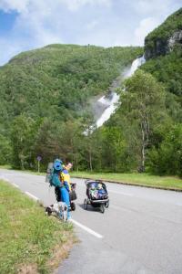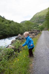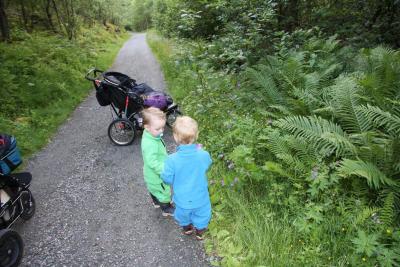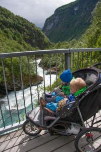 Vi var på sommerferie og hadde besøkt Onkel og Tante(min kones) på Gol, vært i bjørneparken og skulle vidre mot sogndal der vi hadde lånt hytte. Bilen hadde vi stappa full med alt som kunne krype og gå eller ikke alle kunne krype en gang.Tvillingene på rett over 2, lillebror på 6 mnd og vår engelsk setter. I takboksen hadde vi etter nøye pakking fått med soveposer, liggeunderlag, lavvo og annet utstyr. Vi skulle på tur! Etter en del timer i bil og litt slitene grinete unger hadde vi parkert, pakket og var klare til å gå nederst i Utladalen. Det var bratt, flott og Spektakulært oppover. Det var også tungt å skyve vogner med barn oppover! Det var heller ikke så morro med tvillingene på 2 som var skikkelig grinete. De pleier vanligvis å trives i vogna, men i dag var de slitene og lei. Jeg hadde drømt om å kunne telte helt oppe ved Vetti og ta med ungene på dagstur opp til vettisfossen, men det viste seg ganske fort vanskelig. Ungene var rett og slett ikke i humør til tur! Det var allerede tidlig kveld og ikke mange steder og sette opp telt, men vi fant til slutt en fin plass rett ved veien. Sette opp telt og turne i soveposen er jo alltid stas så stemningen steg betraktlig. En av 2 åringene hadde nok sovet for lite denne dagen og sloknet tidlig i posen. Den andre Tvillingen ble med pappa på kveldstur for å ta oppvasken ved elva og se på Vetti gård (på avstand) Natten forløp med Gutter som våknet og krøp ut av posen noen ganger, men ellers greit. Vetle lager frokost og morrakaffe med pappa. Emil sover lenge Det ble ikke Vettisfossen alikevel, men totalt sett gikk turen greit. Ungene var i vesentlig bedre humør hjemover og vi hadde lært masse om å ta med unger på tur! Oppsumerer: Vær forbredt Ikke start seint på dagen Ikke start med slitene unger Ta med noen leker og underholdning til barna Ikke ha for store ambisjoner Ikke dra på tur når natten hjemme er en utfordring.